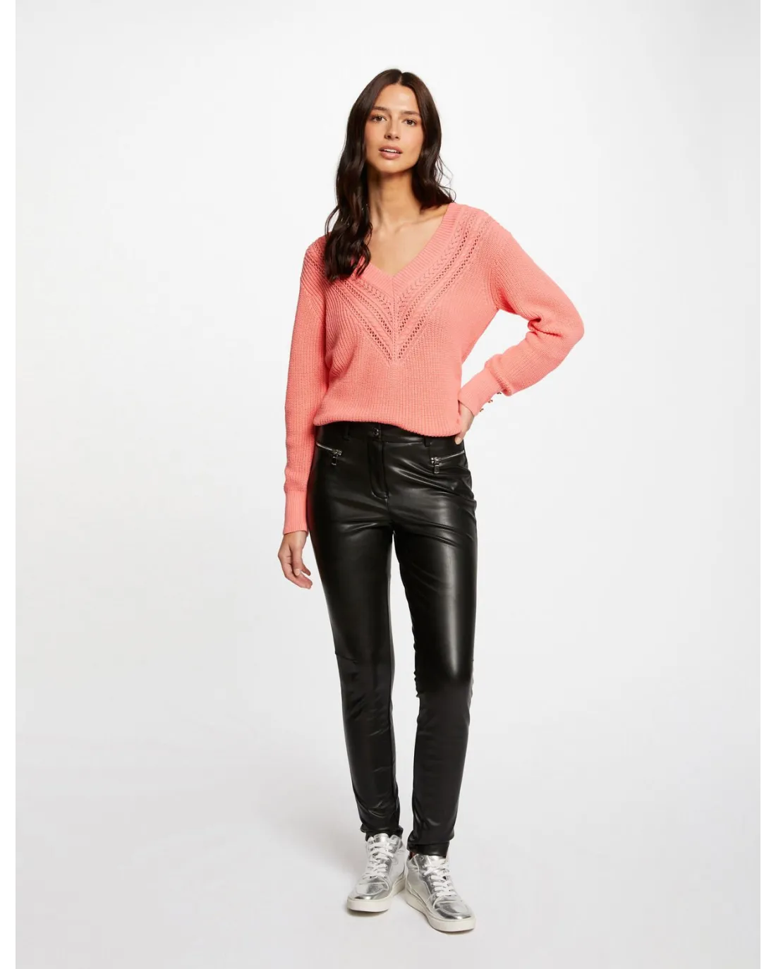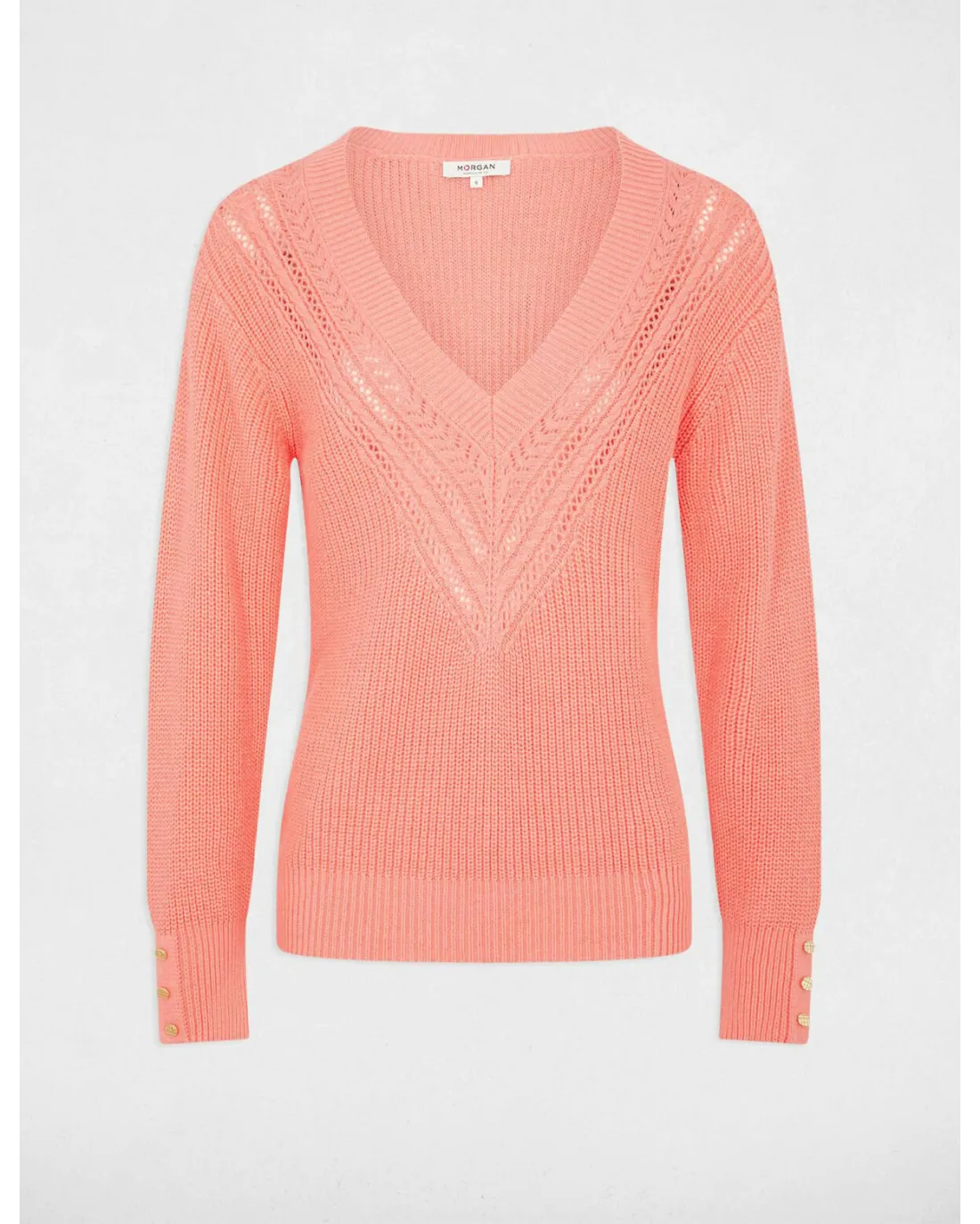 Jersey de punto fino de canalé calado con escote en V, manga larga acabada en puño.