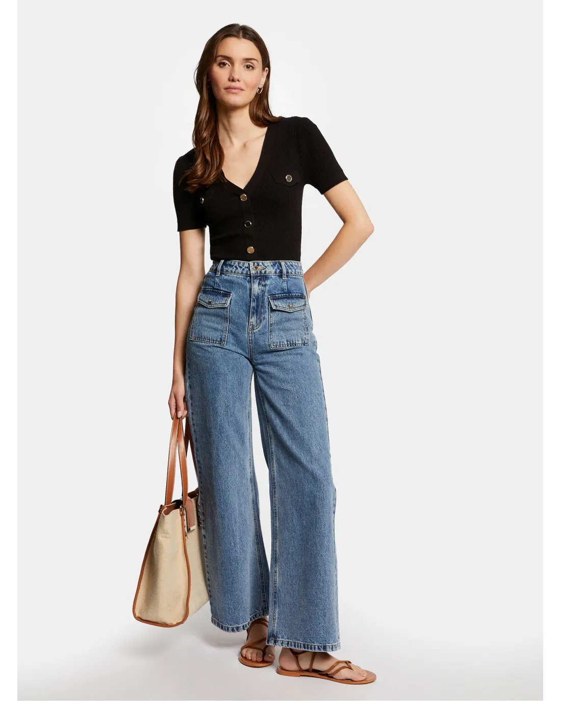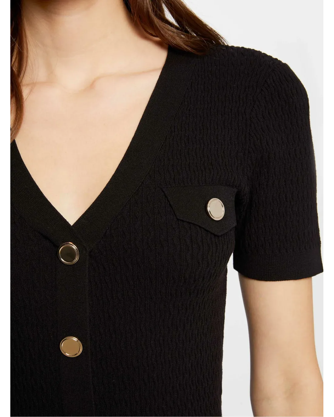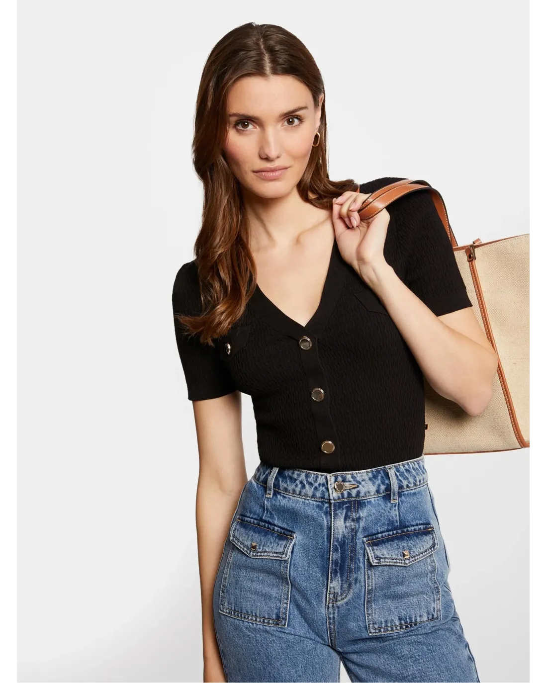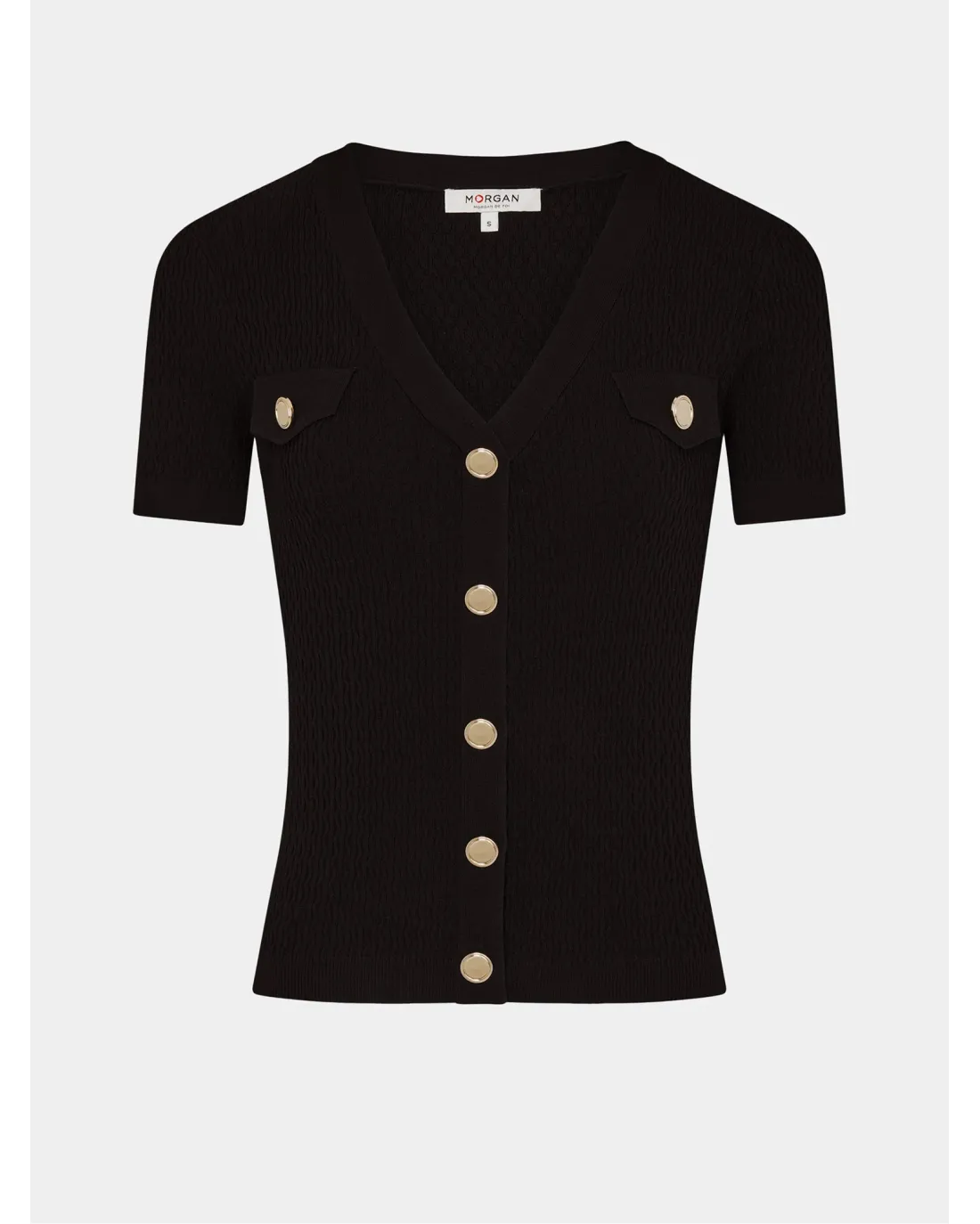 Chaqueta corta confeccionada en punto medio con estampación monograma, manga larga y cierre de botones dorados.
