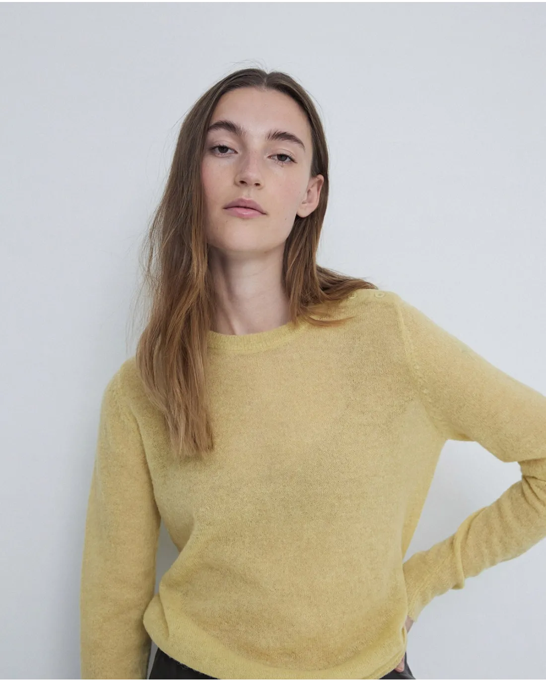 Jersey confeccionado en un fino punto de alpaca con manga larga, cuello redondo y botones decorativos en un hombro.