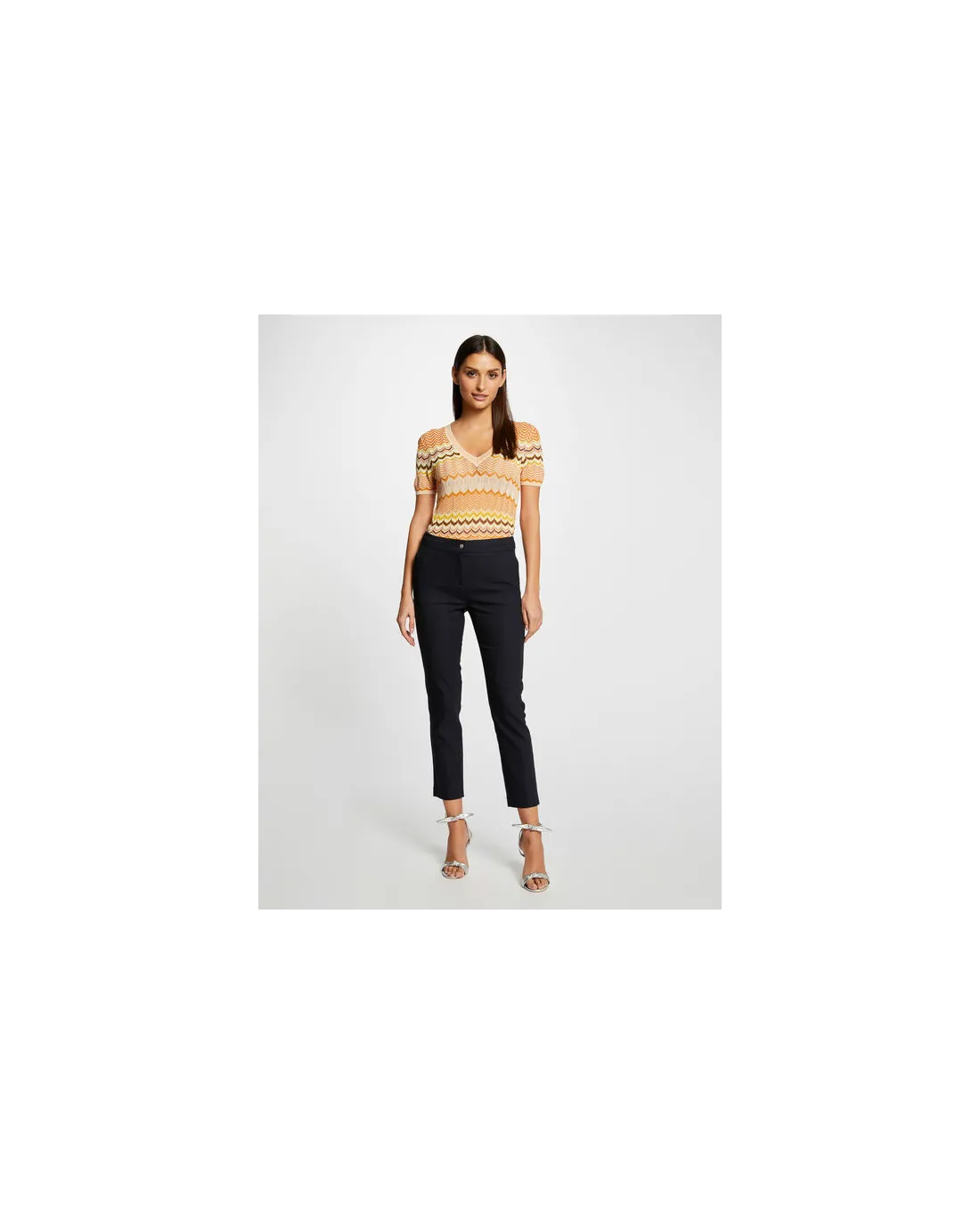 Jersey estampado confeccionado en un fino punto, de manga corta con escote en V y detalles calados.