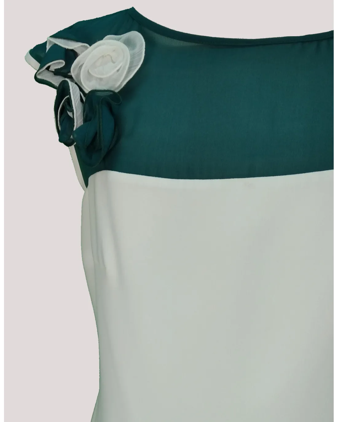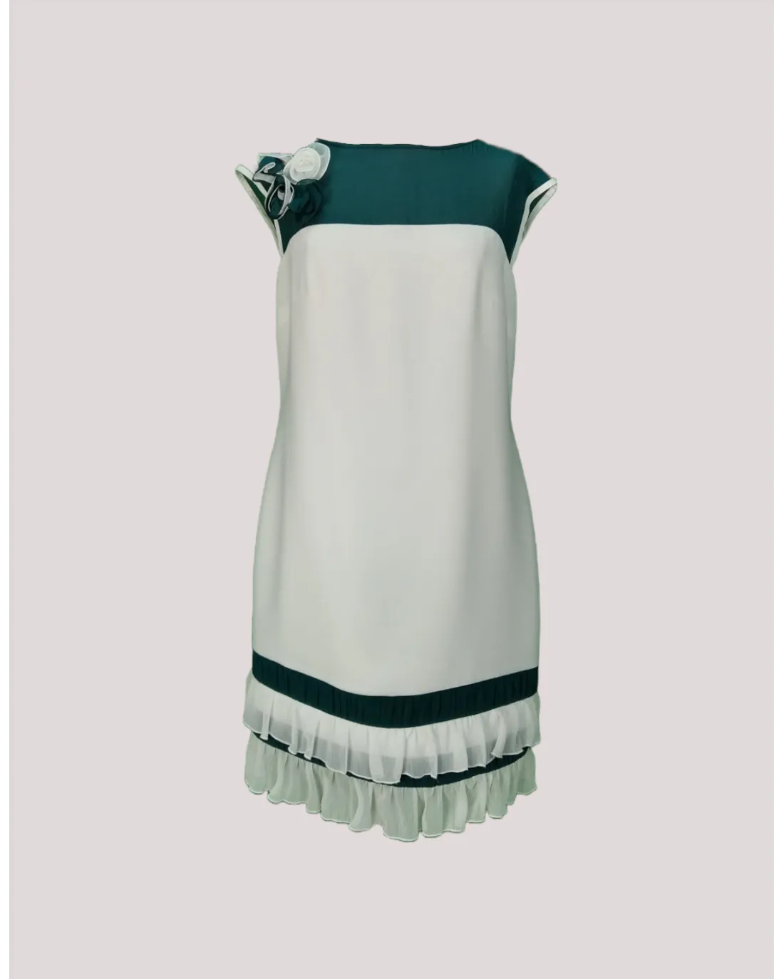 El vestido de corte recto con hombros anchos en un tejido de gasa con un aplique de flor en un hombro, el resto del vestido confeccionado en un tejido crepé acabado en volantes y la chaqueta de corte corto con manga larga y detalle de aplique a contraste y cierre de botones.