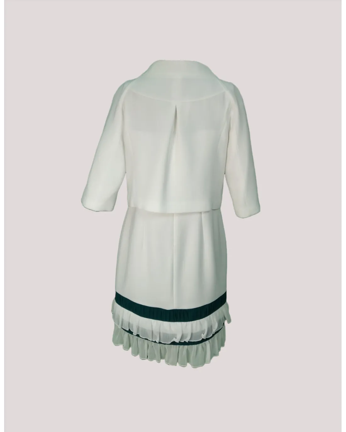 Conjunto confeccionado en un tejido mikado, la chaqueta de manga larga acabada con doble volante, cuello de solapas, de talle floral en un hombro y trezado a contraste en cintura. El vestido en el mismo tono que la chaqueta de maga corta con cuello redondo de corte recto y detalle trenzado en cintura.