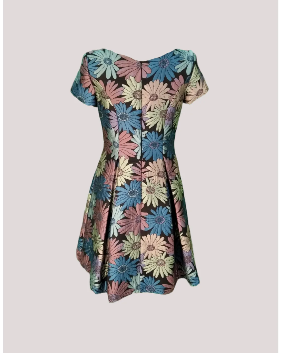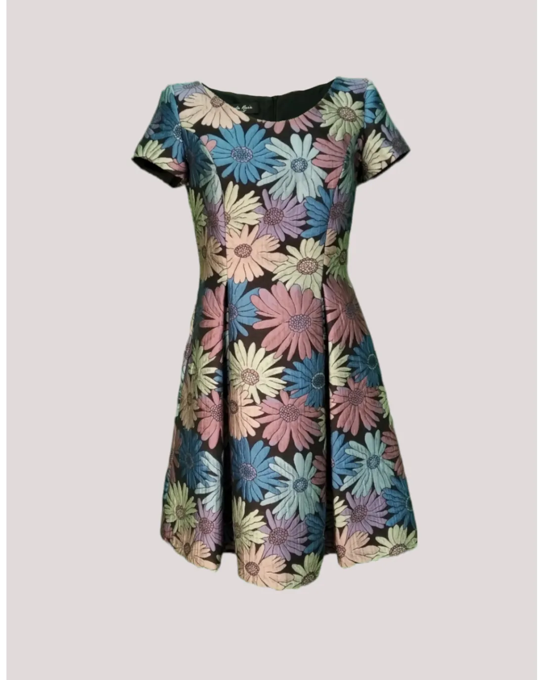 Vestido corto recto, manga larga con hombros descubiertos. Escote en pico, vestido de encaje.