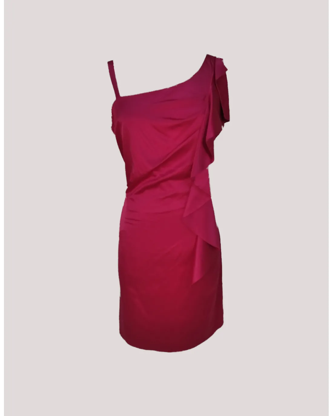 Vestido corto asimétrico con cuerpo y espalda drapeada.