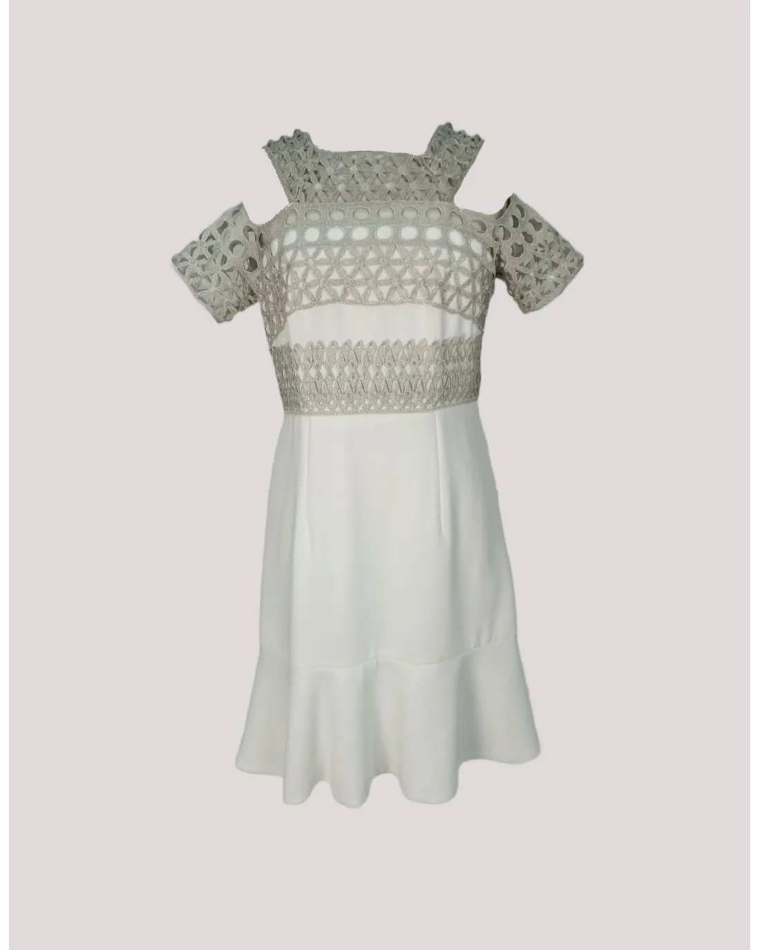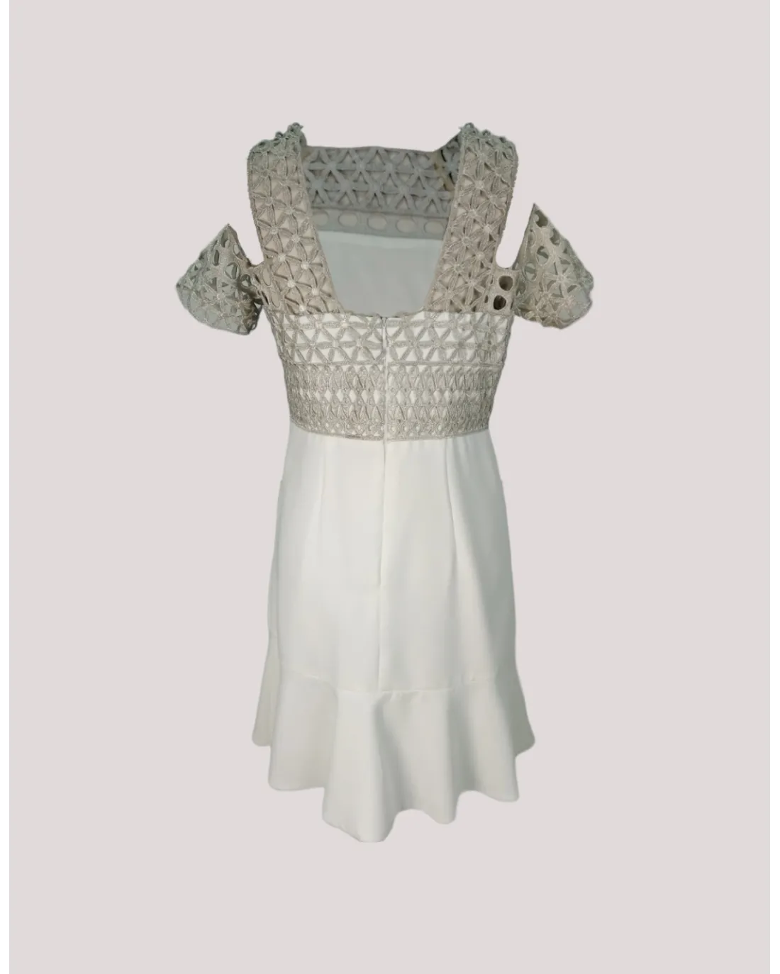 Vestido corto confeccionado en un tejido brocado, de manga corta con cuello redondo, aplique a contraste en cintura, falda de palas y franja a contraste en el final del vestido.