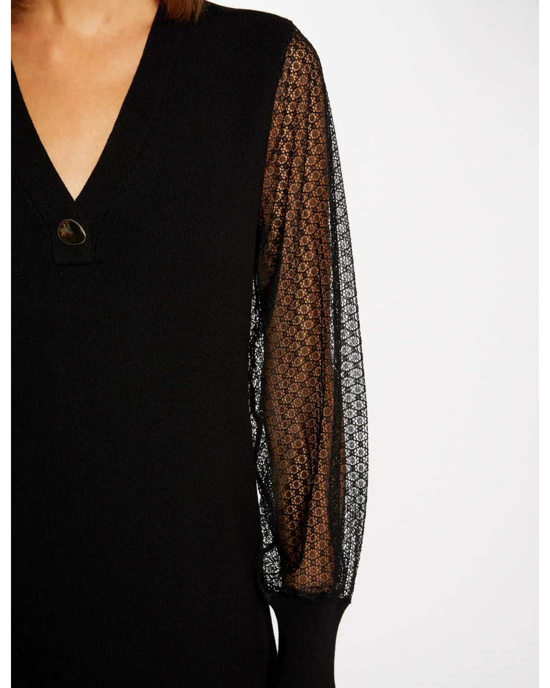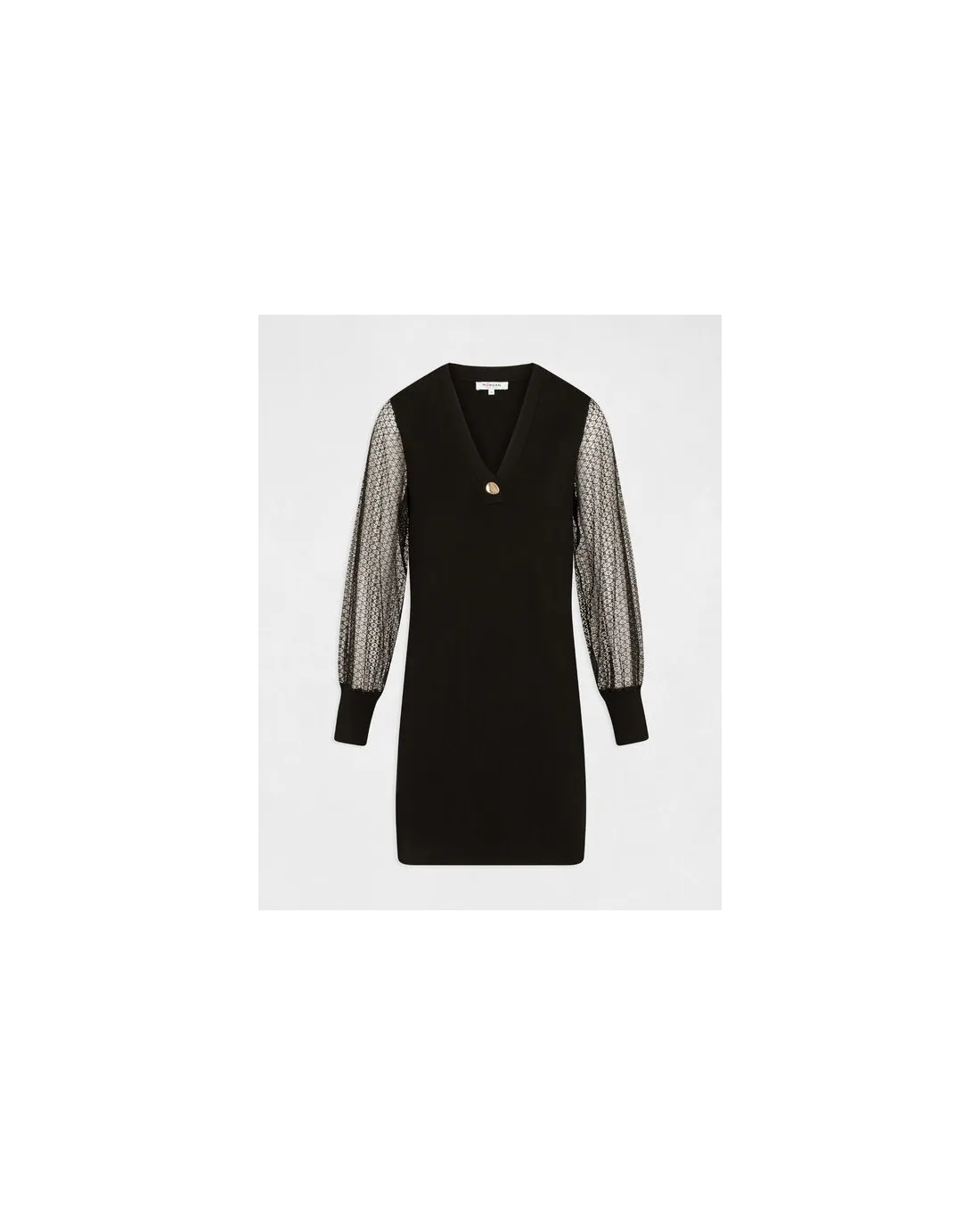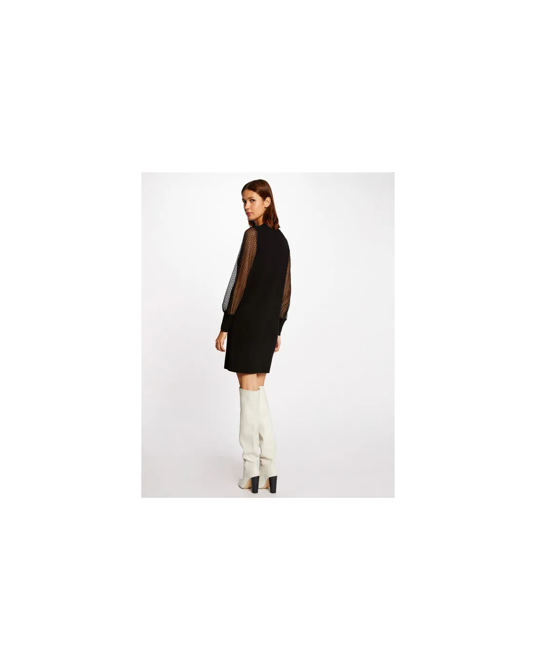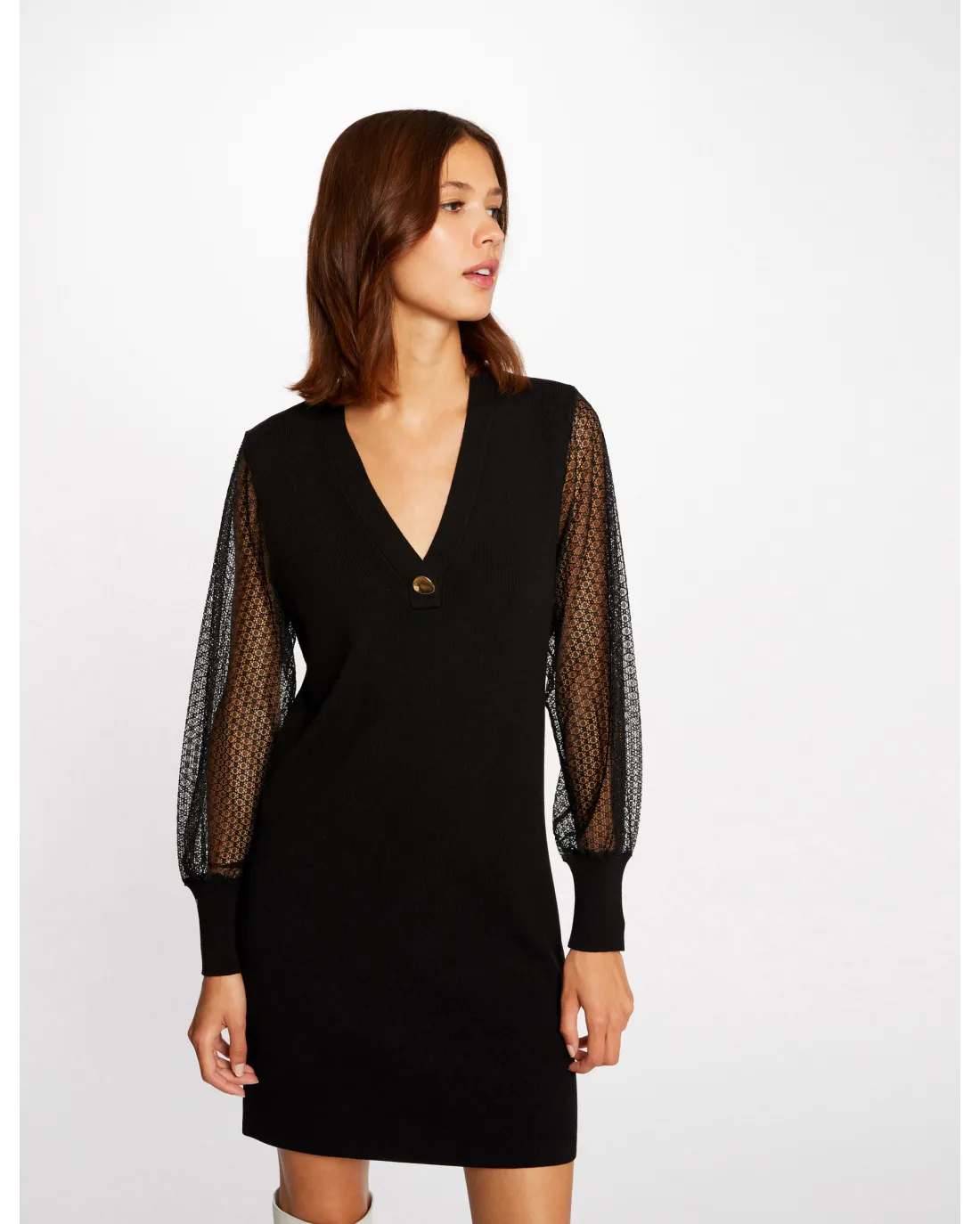 Vestido corto confeccionado en gasa estampada de manga larga con escote en V y falda de vuelo.