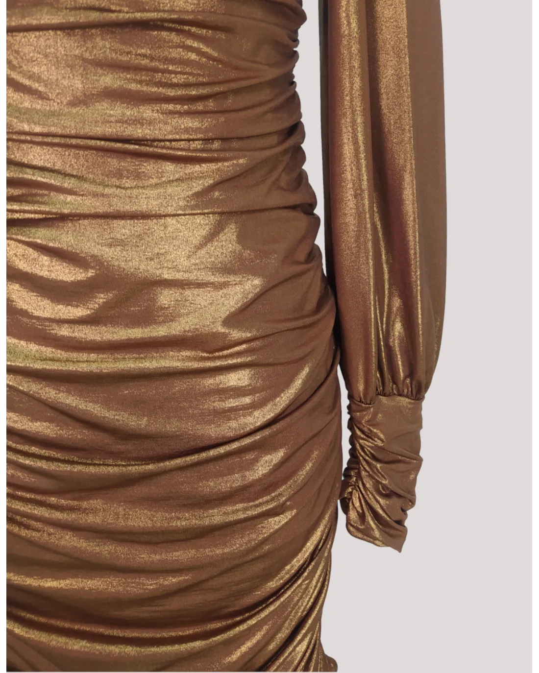 Vestido corto de corte ajustado de manga larga y parte baja drapeada.