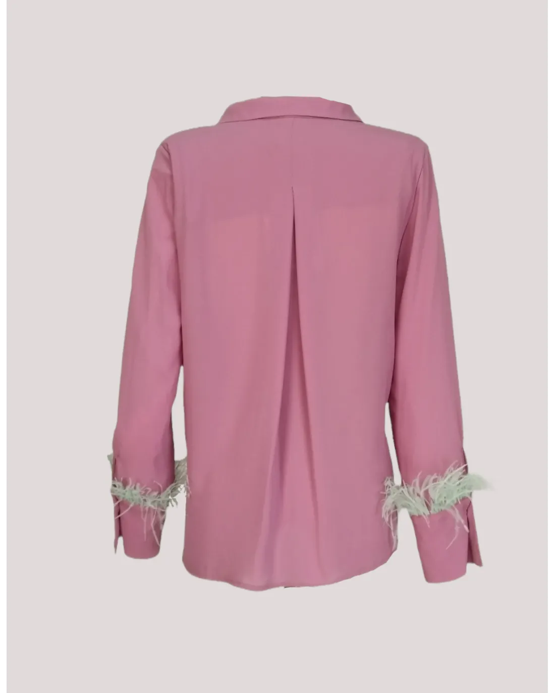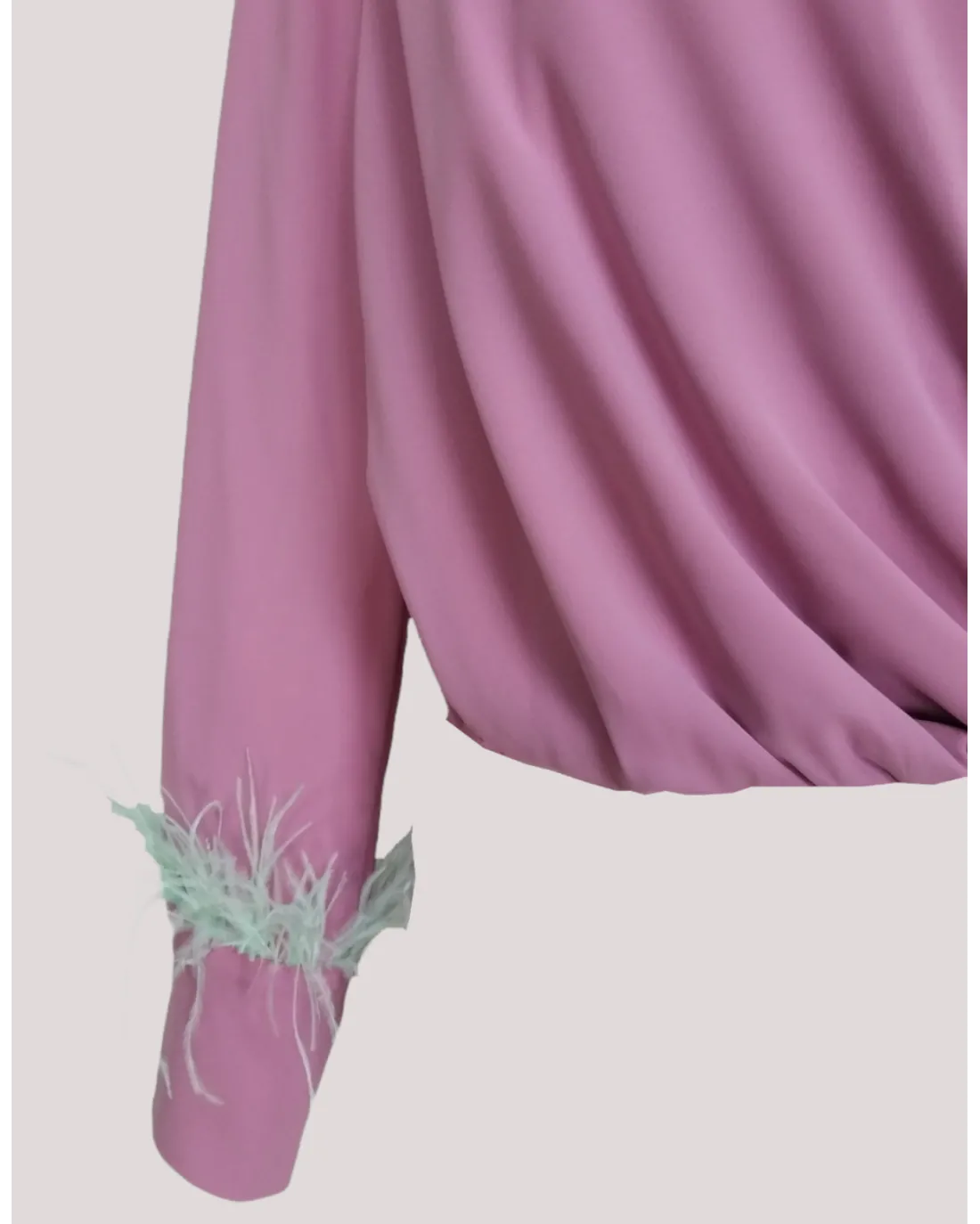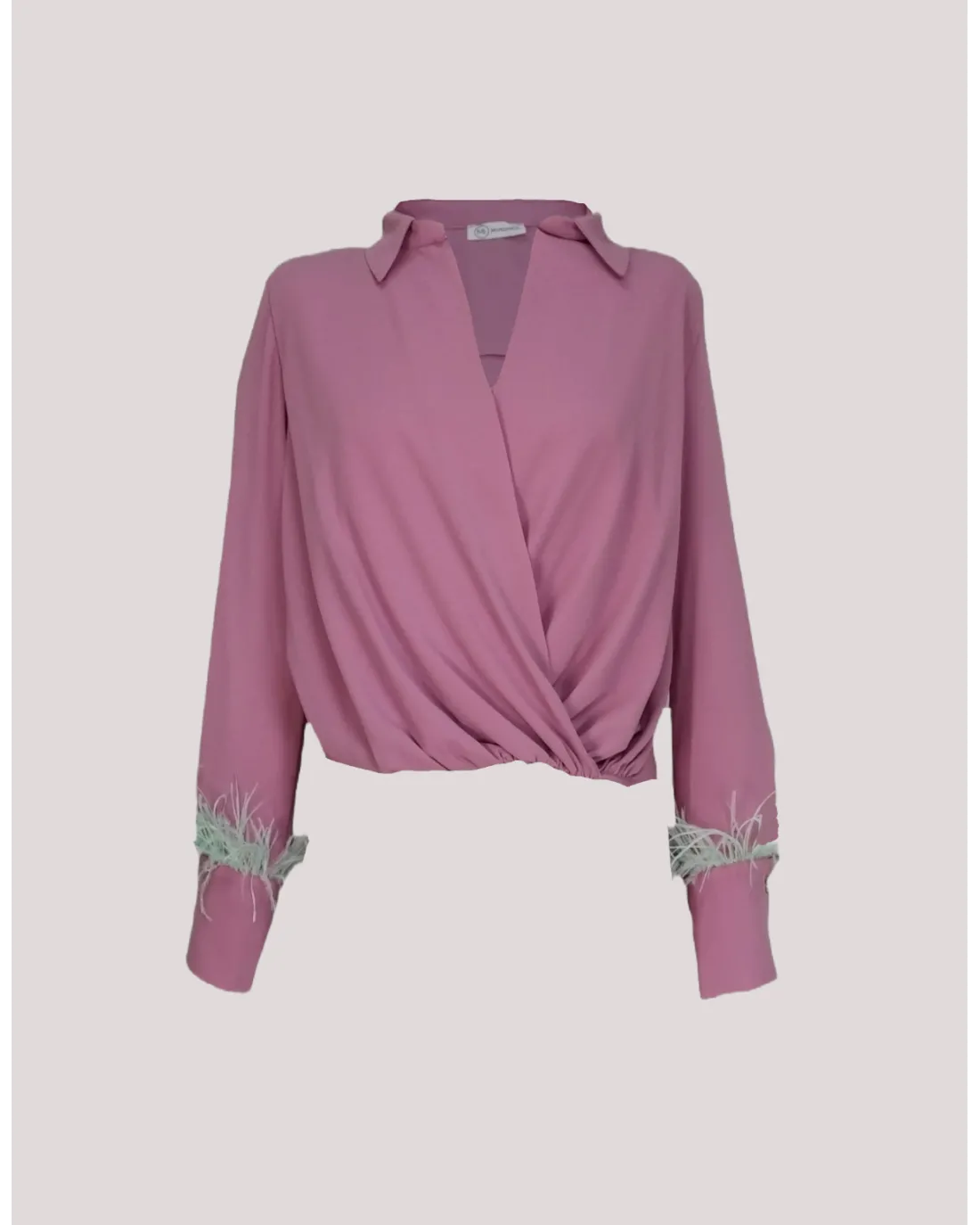 Blusa de corte cruzado con cuello camisero y manga larga con unas plumas a contraste.