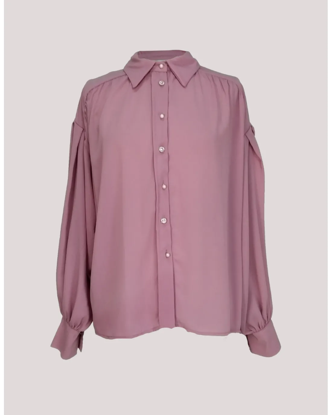 Camisa de corte holgado con botones centrales y cuello camisero, con hombros bajos y manga larga y bombacha.