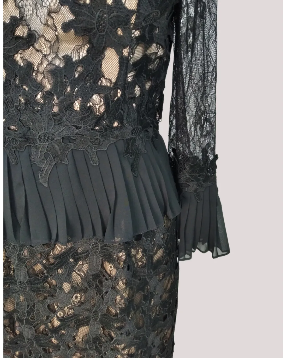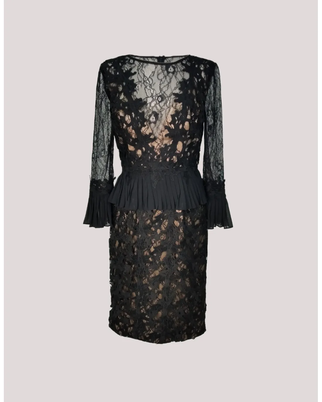 Vestido corto confeccionado en un bonito encaje, de manga larga acaba en volante, escote en V semitransparente y cinturilla con peplum.