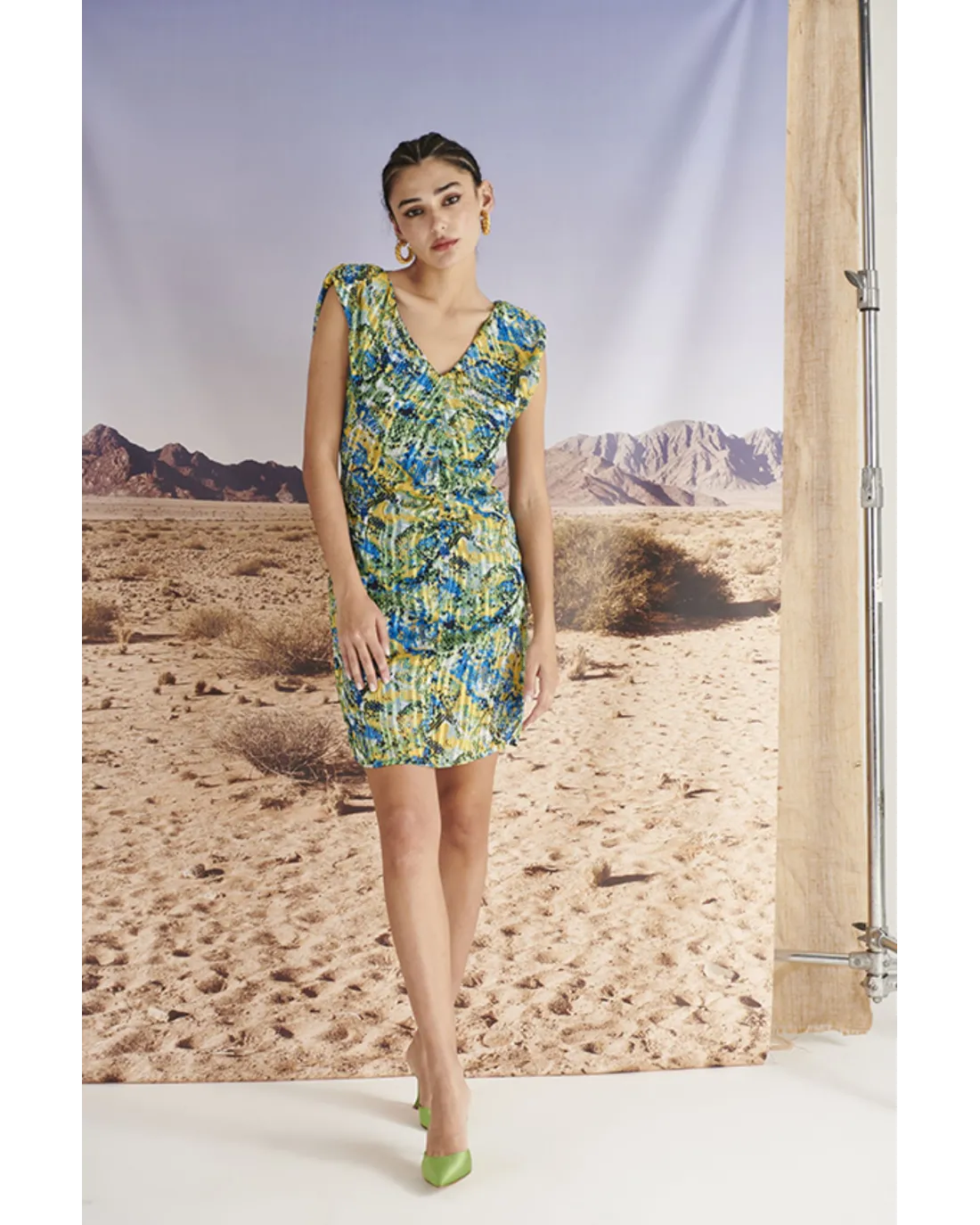 Vestido corto estampado con hombros anchos,  parte delantera drapeada con escote en V y espalda más pronunciada.