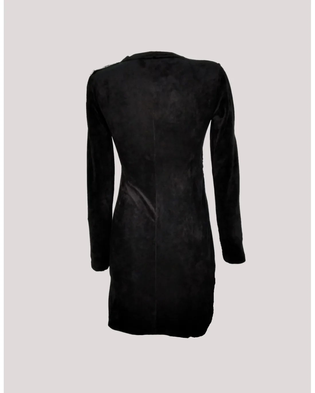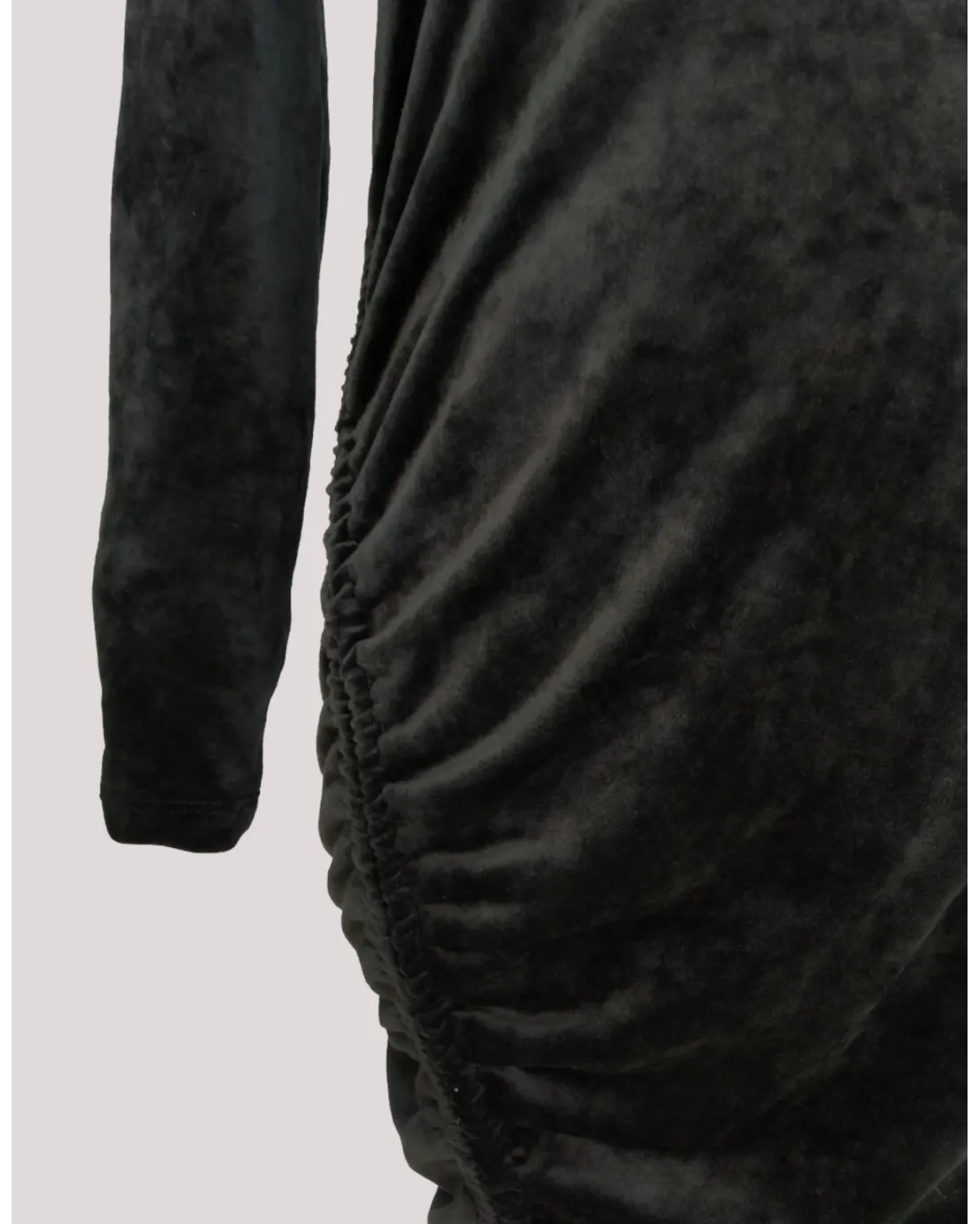 Vestido corto ajustado confeccionado en una tela bronce con brillo, manga larga abullonada acabada en puño igual, espalda baja y todo el vestido drapeado.