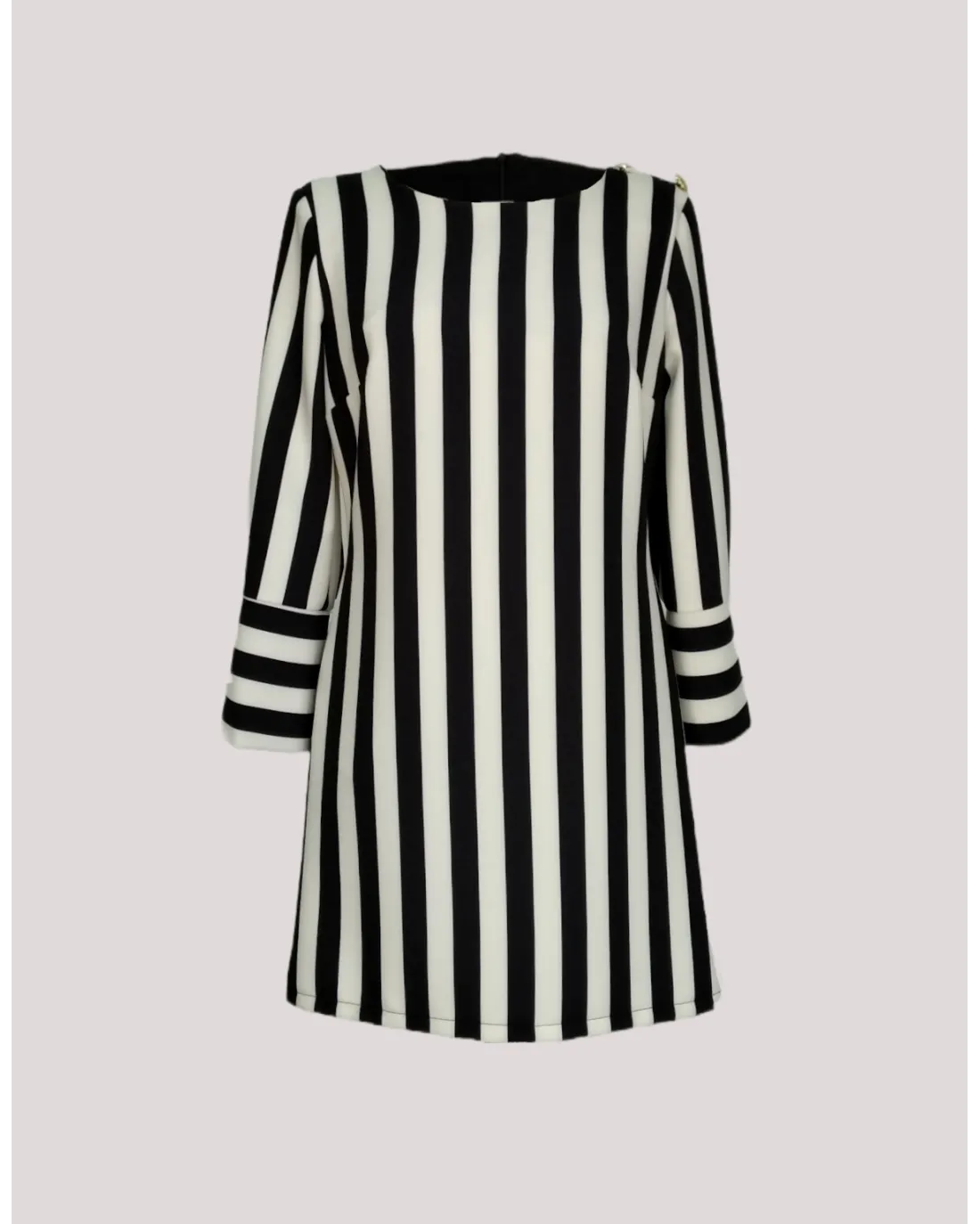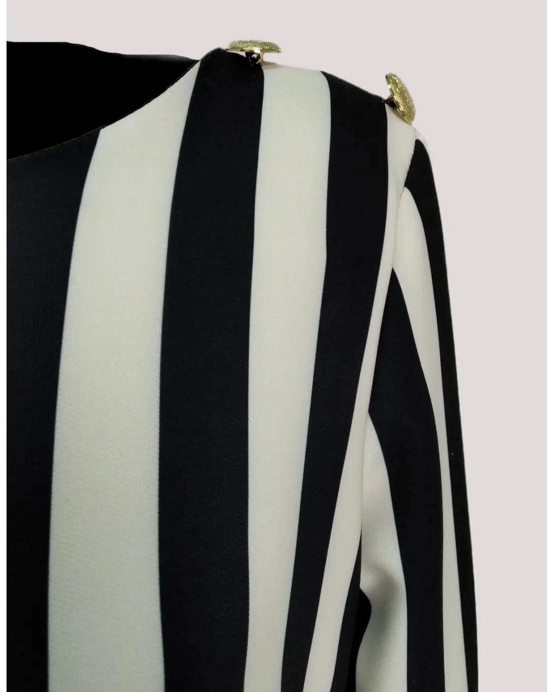 Vestido corto estampado con hombros anchos, parte delantera drapeada con escote en V y espalda más pronunciada.