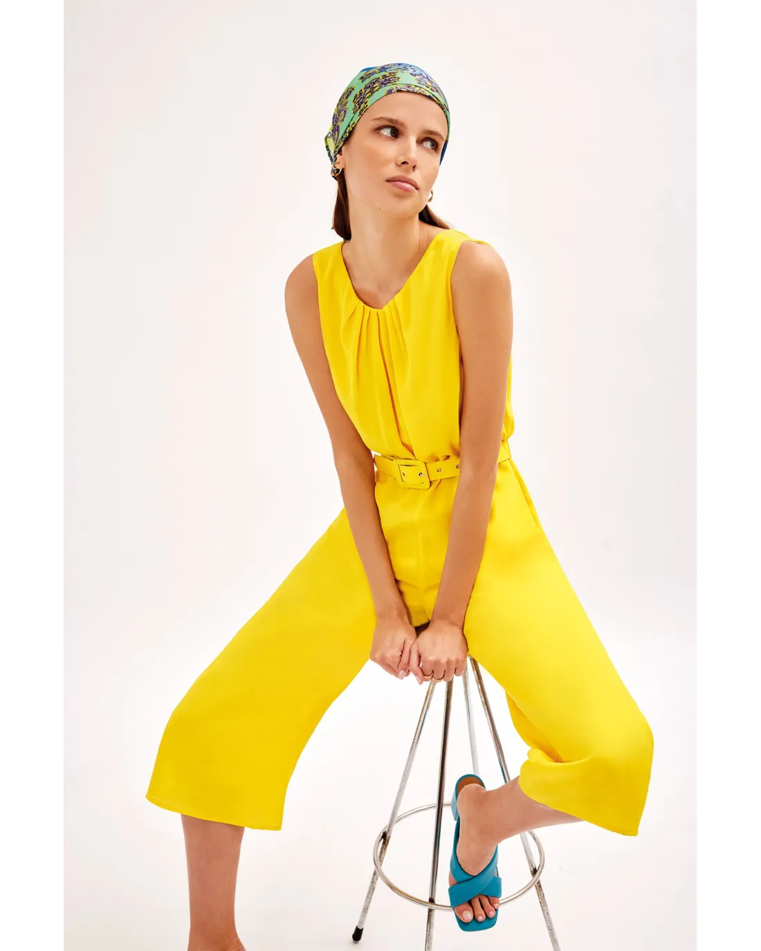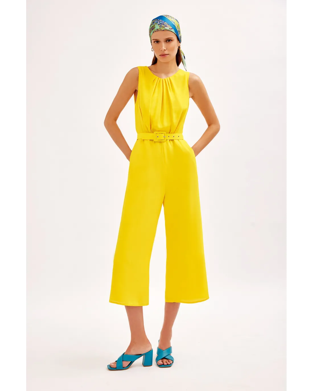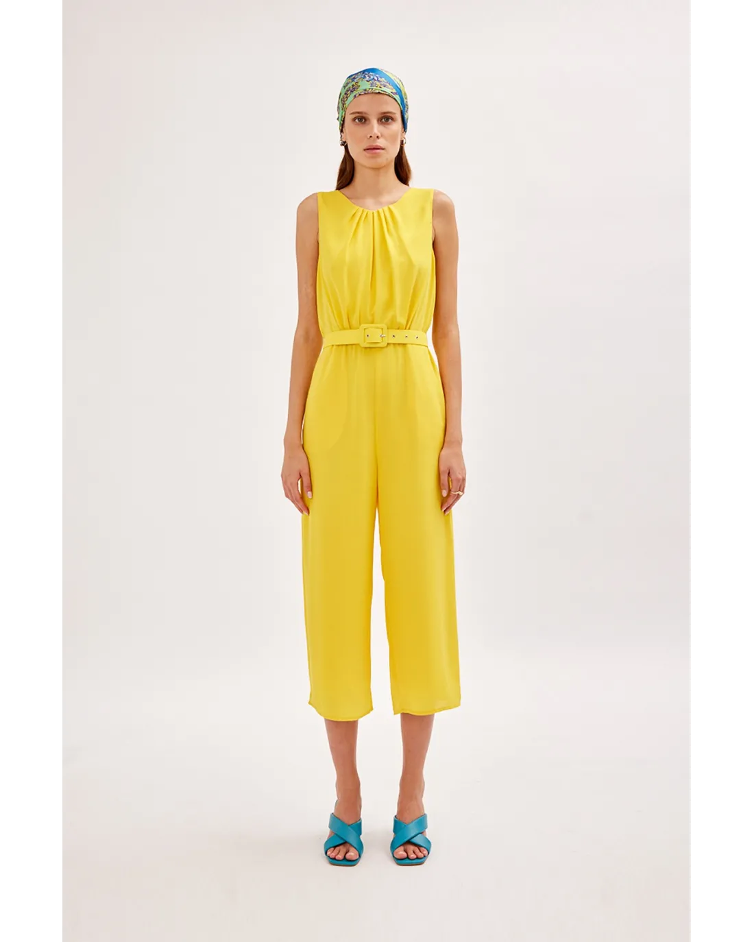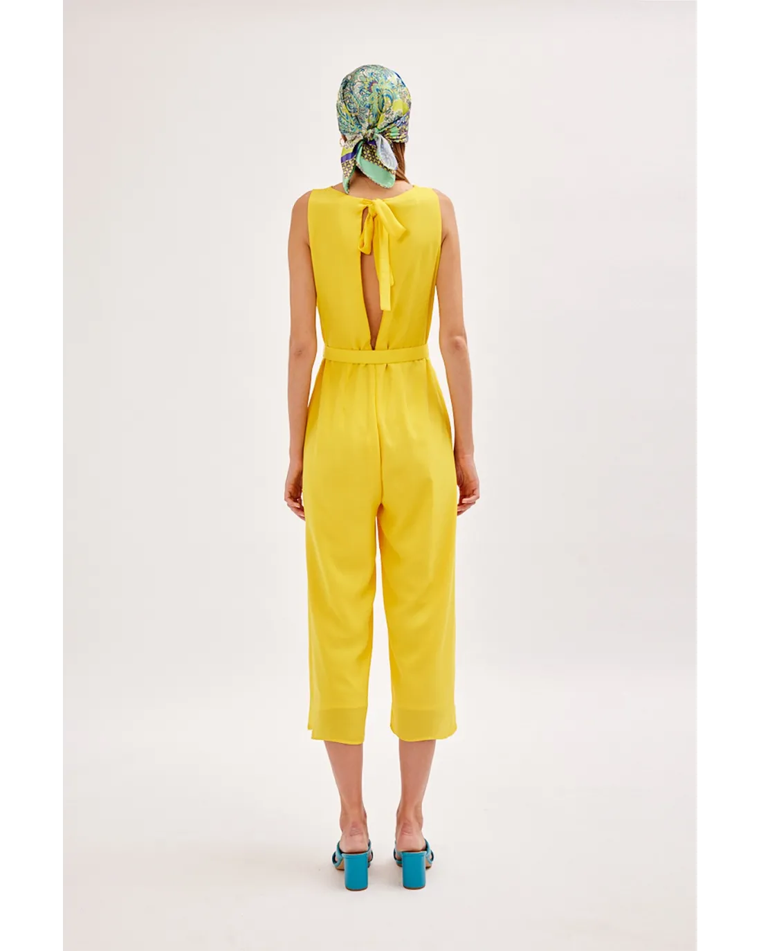 Mono confeccionado en tejido de gasa, sin mangas y cuello a la caja con pequeños pliegues. Acompañado por un cinturón y espalda con abertura y lazada.