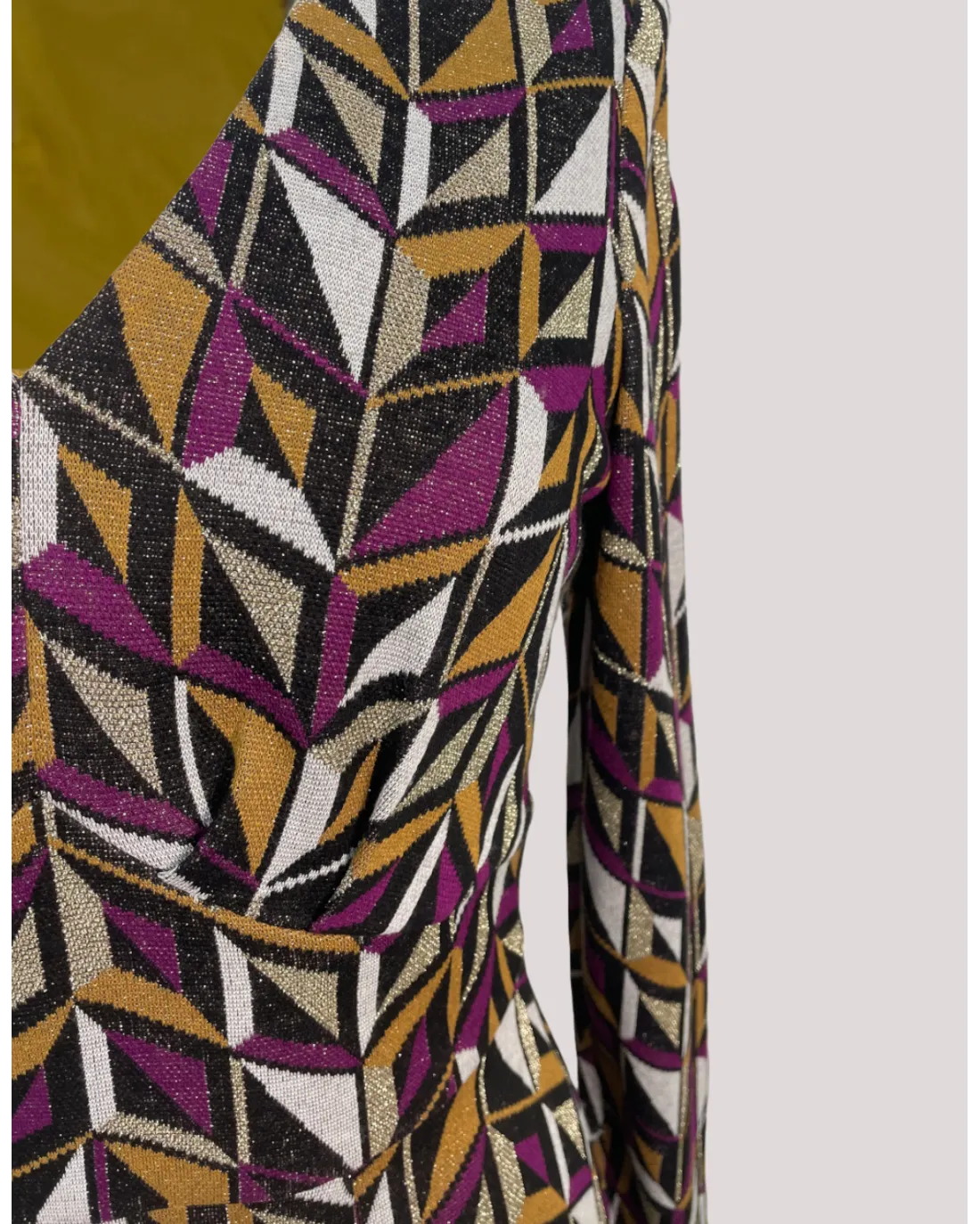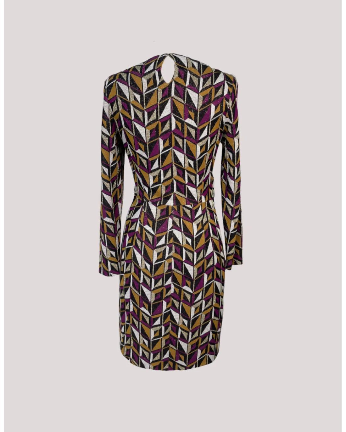 Vestido corto confeccionado en punto multicolor, de manga larga con escote en V y cierre de botón trasero dejando ver una lágrima en espalda.