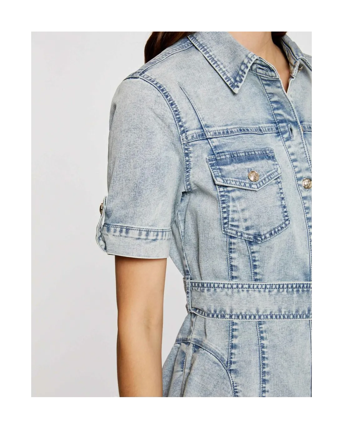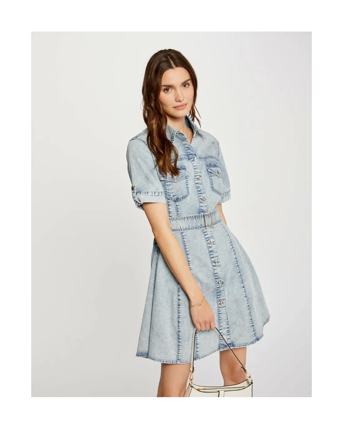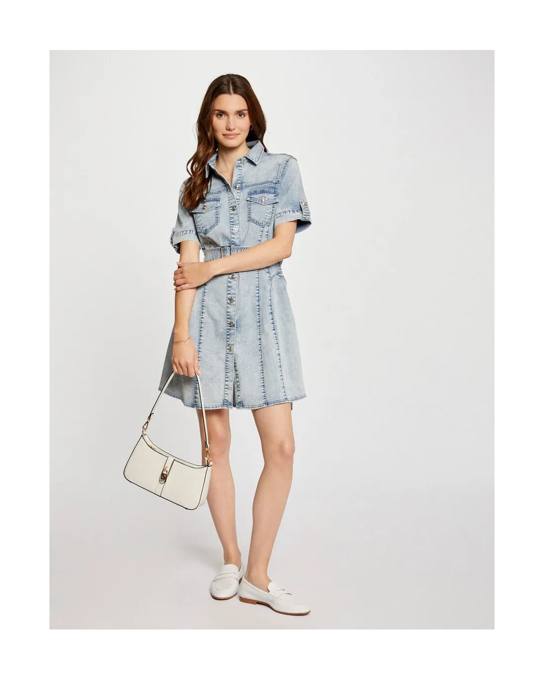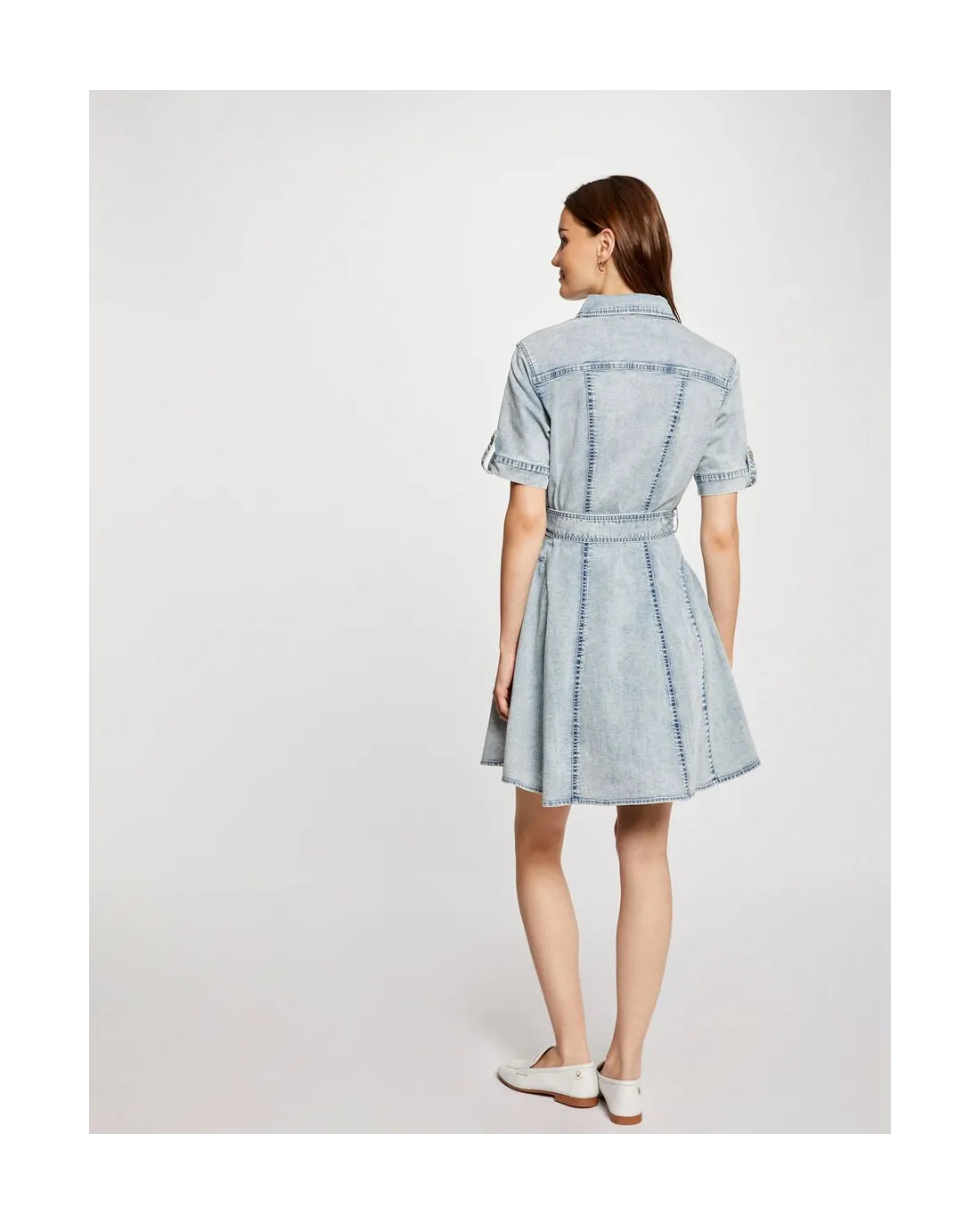 Vestido corto con estampado chevron, hombros anchos y escote en V. Su cierre es de cremallera trasera.