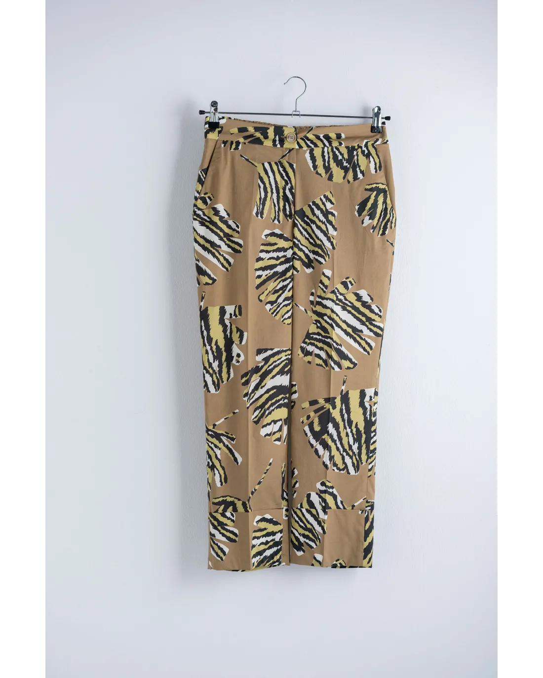 Pantalón largo tobillero con dobladillo, con cinturilla en la parte de la espalda y cierre de botón y cremallera.