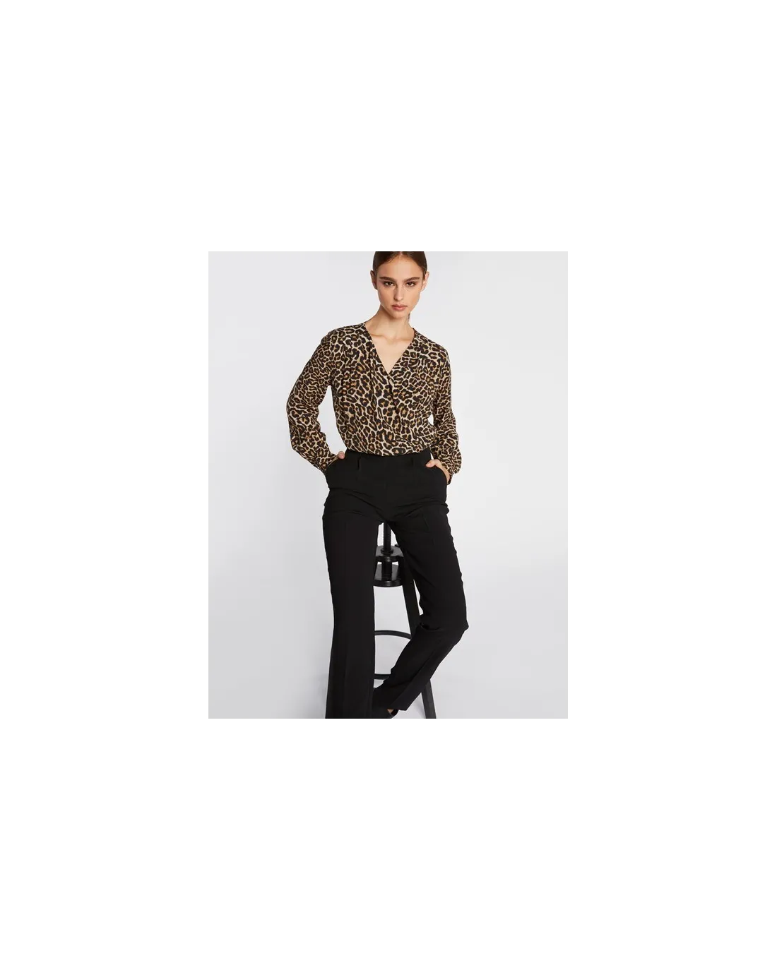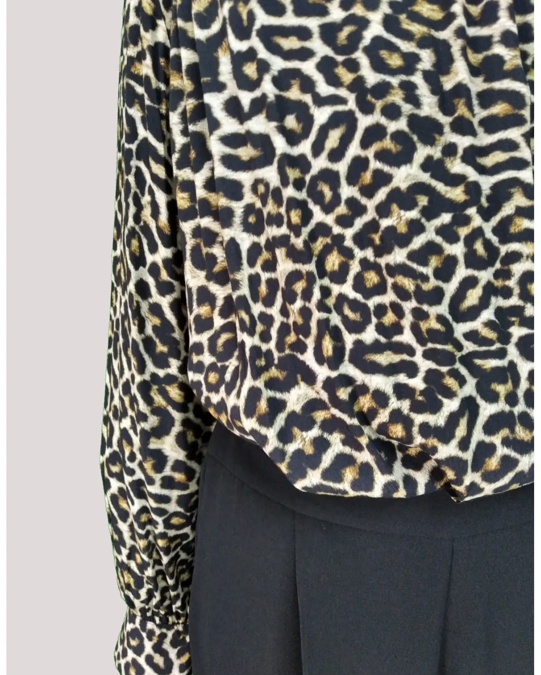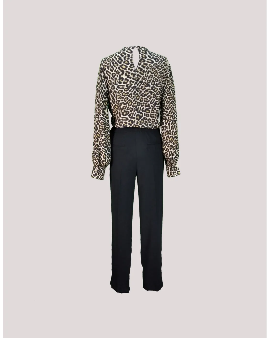 Mono largo estampado en leopardo. Pantalón de talle alto de punto fino y liso con bolsillos delanteros tipo parche en la parte de atrás. Lleva efecto drapeado en la parte de arriba con cuello en V cruzado, manga larga tipo globo y puños abotonados.
