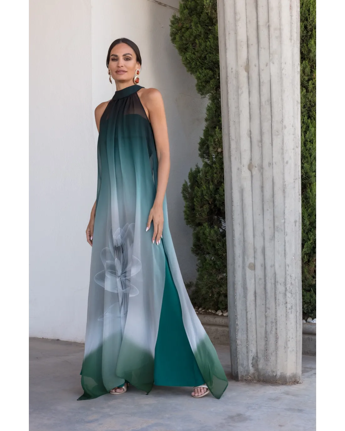Conjunto de mono largo confeccionado en crepé con escote de palabra de honor y blusa kaftán confeccionada en grasa con escote halter, estampación floral y aberturas laterales.