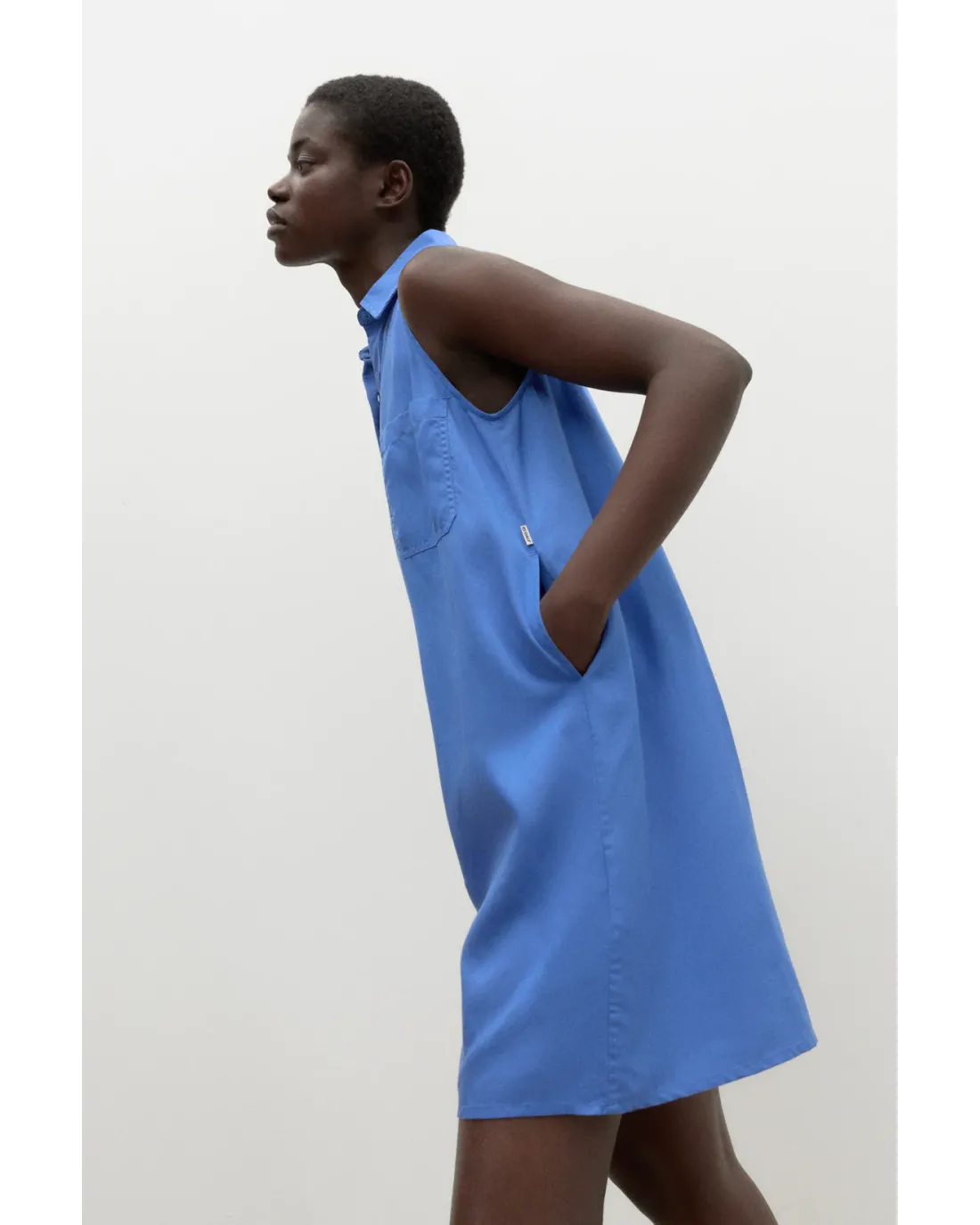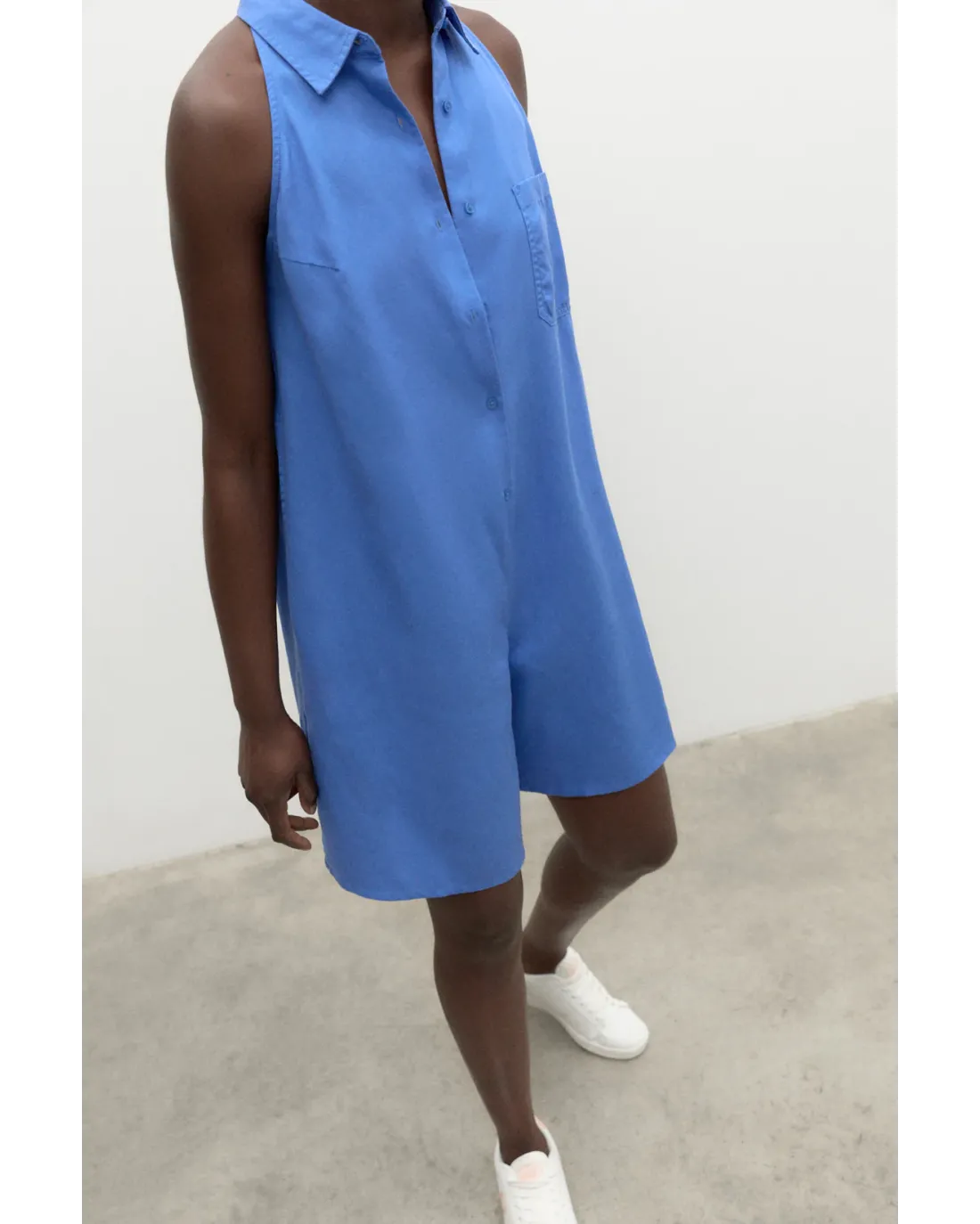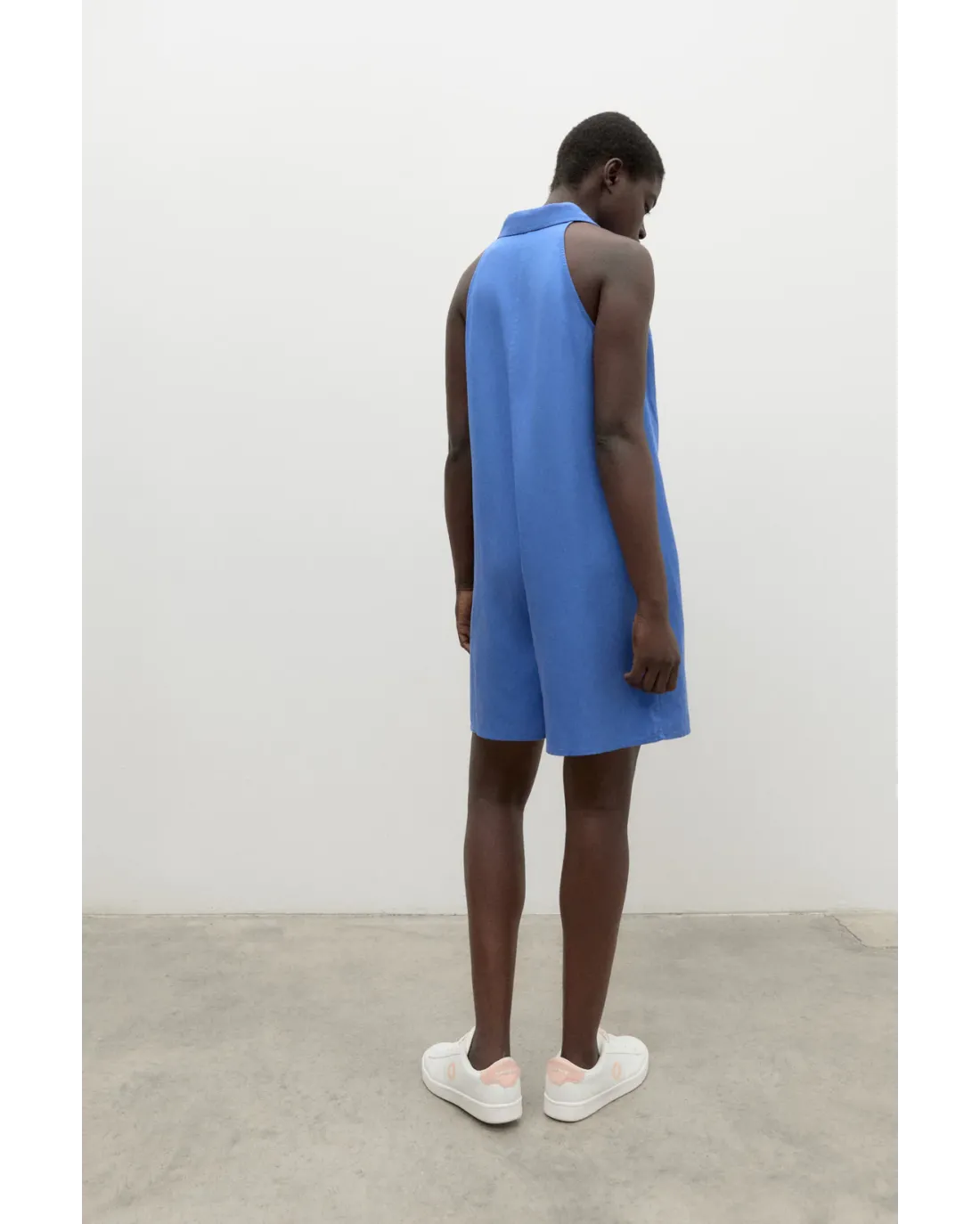 Mono corto sin mangas, parte de arriba estilo camisero, parte central con cierre de botones, dos bolsillos laterales y uno delantero.