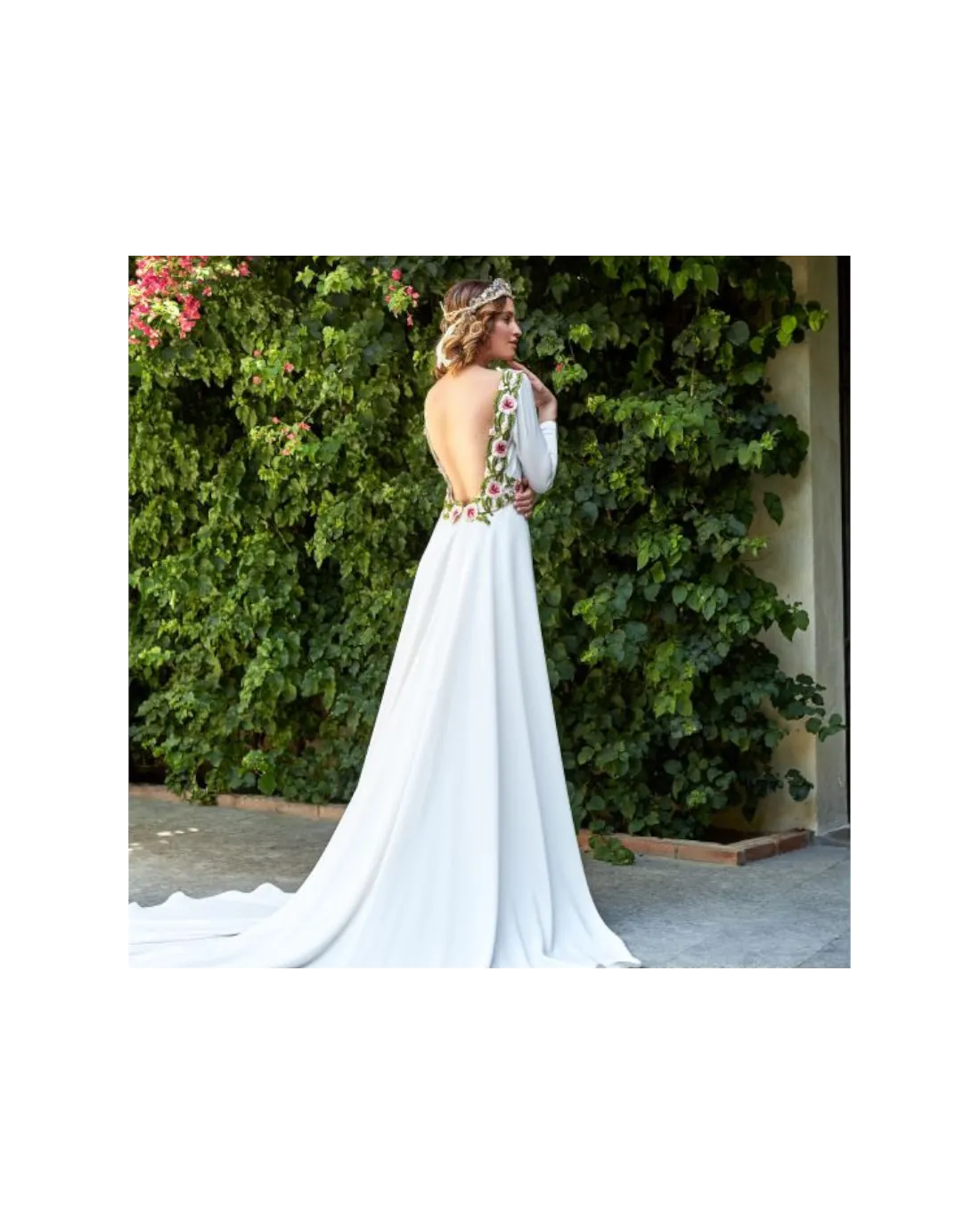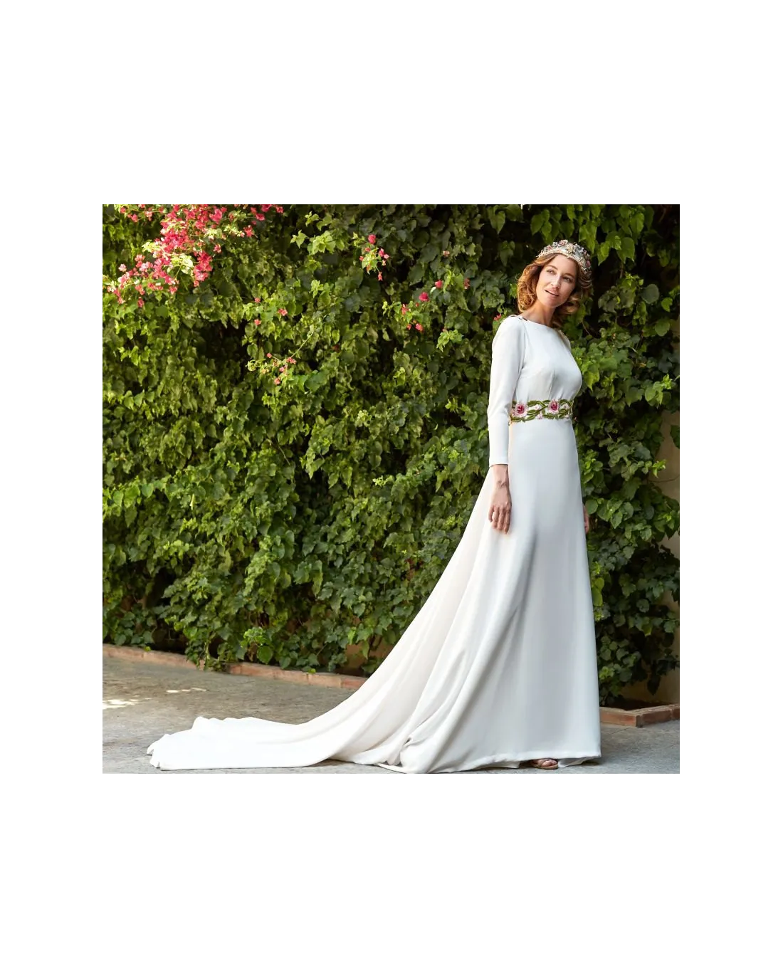 Vestido y sobre falda. El vestido está confeccionado en un tejido crepé con manga larga acabada en bordados, escote drapeado en V y abertura lateral. El cierre de cremallera trasera con pequeños botones. Incluye fajín bordado. La falda confeccionada en un tejido brocado con cola y una amplia cinturilla. La falda podrás quitártela cuando apetezca y lucir...