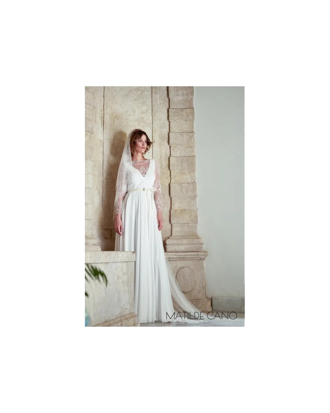 Vestido de novia confeccionado en mikado con manga larga y escote en V con tul. Cierre de cremallera invisible trasera y fajín al tono.