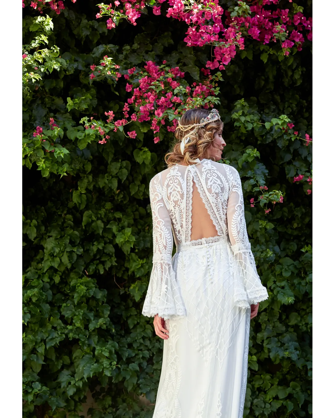 Vestido de novia bordado en gasa, con cuello boho, cortado a la cintura con una cinturilla bordada, manga larga acabada en farol y espalda en triángulo que cierra en un botón. El cierre en espalda baja con cremallera invisible y pequeños botones.