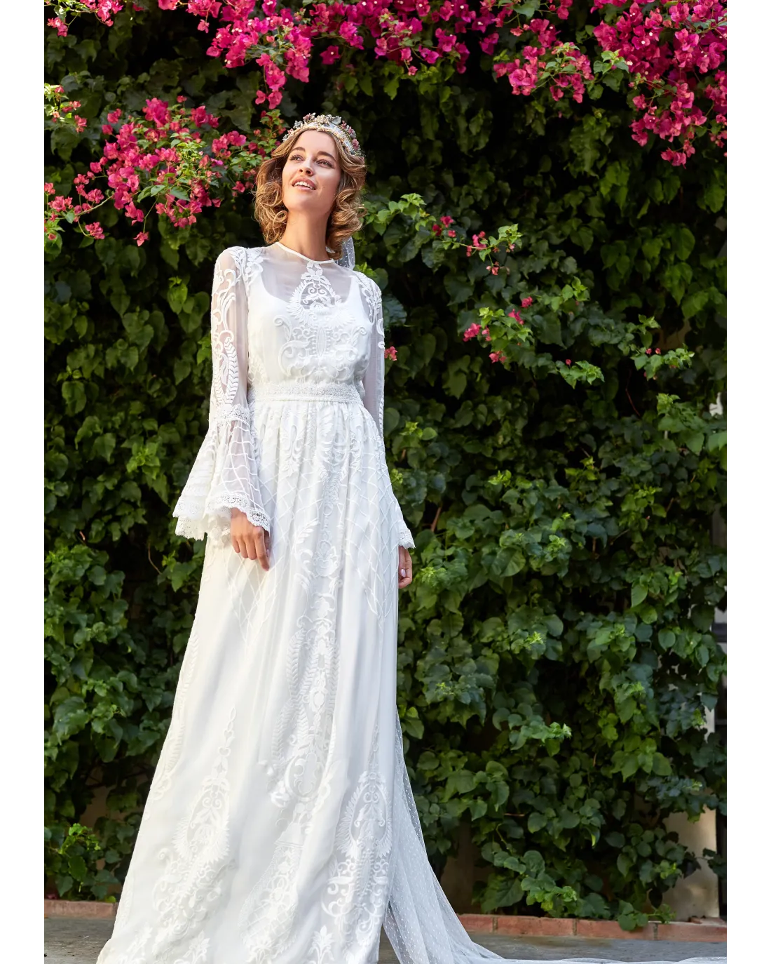 Vestido de novia de tul bordado estilo romántico, cuello redondo y manga larga con una fila de pequeños botones. Cierre trasero con una cremallera invisible y pequeños botones. Incluye una sobrefalda confeccionada en un crepé triacetato con una cinturilla y amplia cola. Incluye cinturón joya.