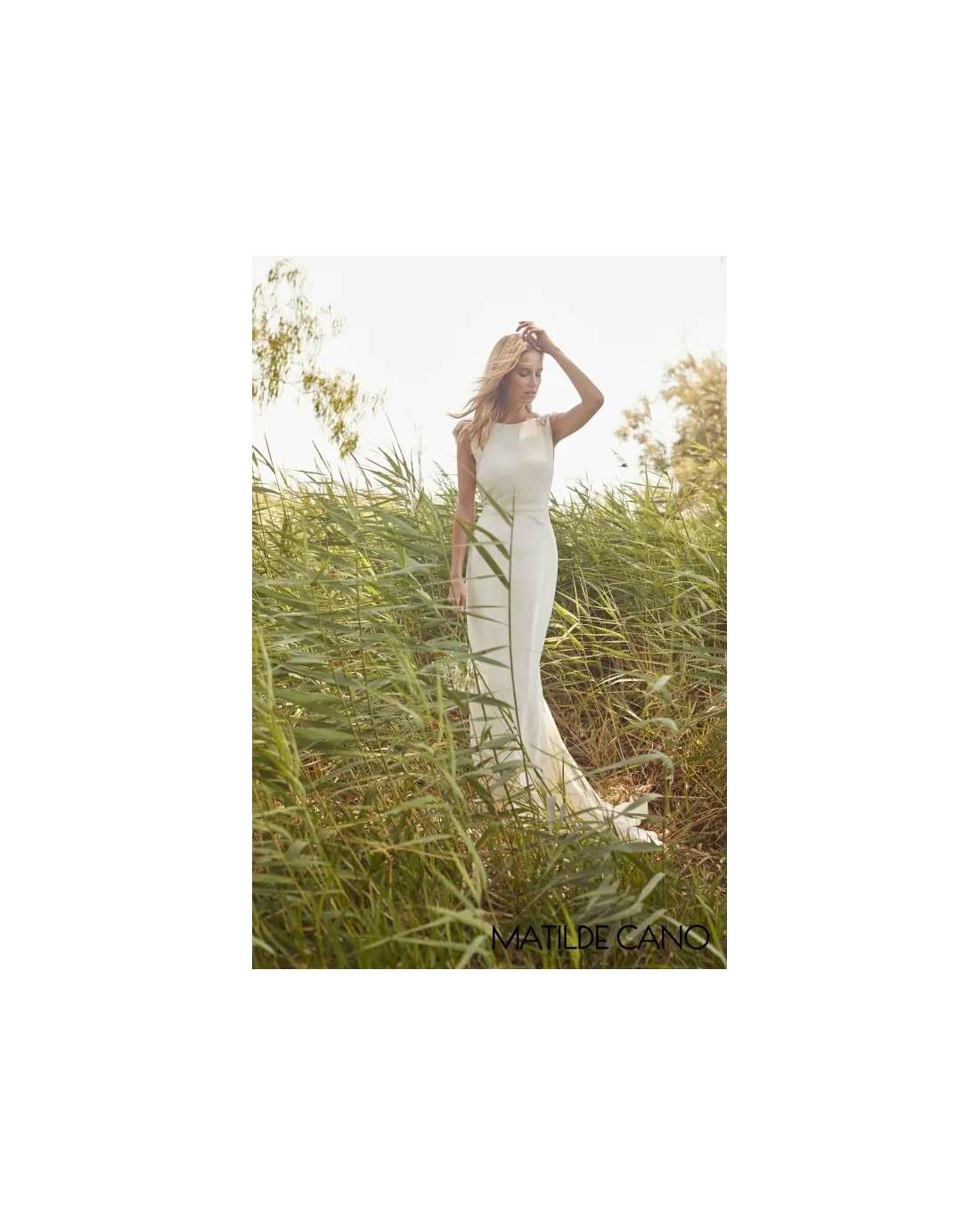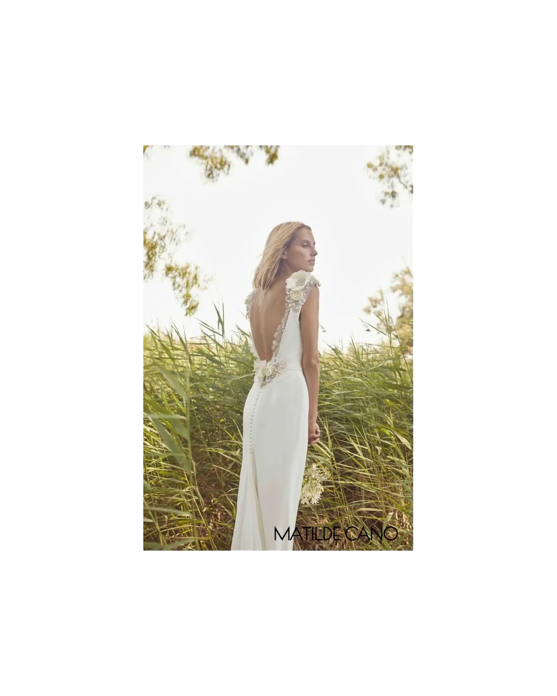 Vestido de novia confeccionado en un delicado crepé con cuello redondo, mangas de sisa con aplique joya, espalda baja con un aplique joya igual que el de hombros. Del vestido sale una pequeña cola. Su cierre de pequeños botones y cremallera invisible.