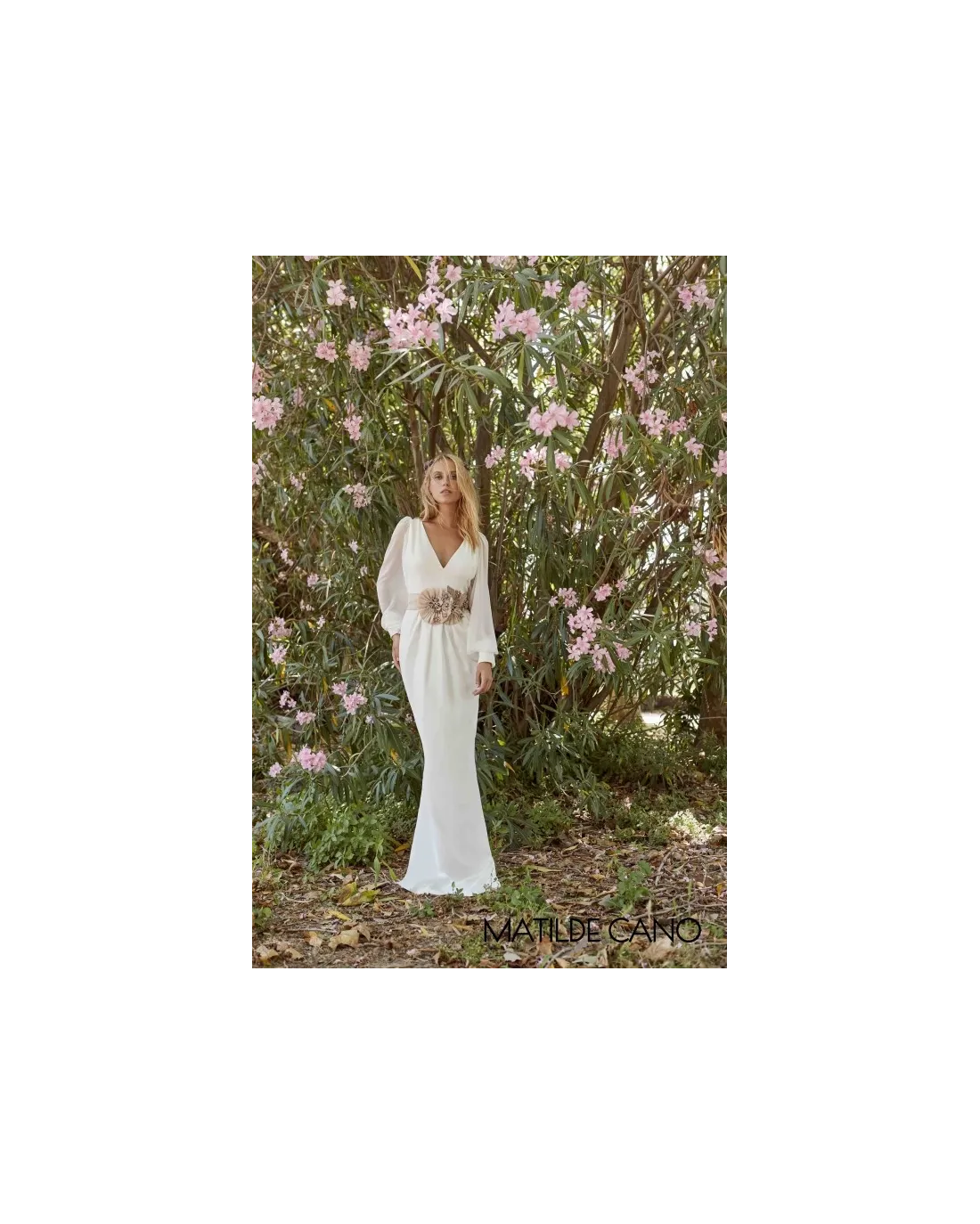 Vestido de novia confeccionado en crepé triacetato, manga larga con una bonita espalda baja con flores a todo alrededor y cinturilla. Amplia cola.
