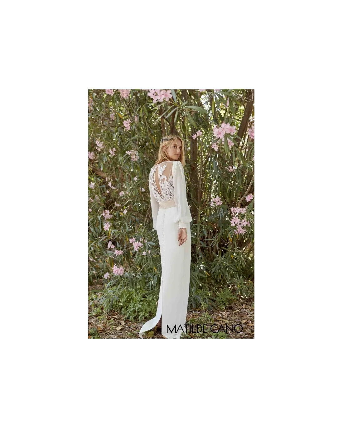 Vestido de novia confeccionado en un delicado crepé con mangas globo confeccionada con una suave gasa acabadas en puño con pequeños botones. Espalda de fantasía con encaje. El cierre del vestido está con pequeños botones y cremallera invisible.