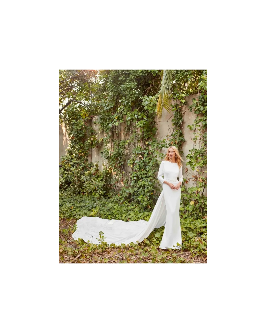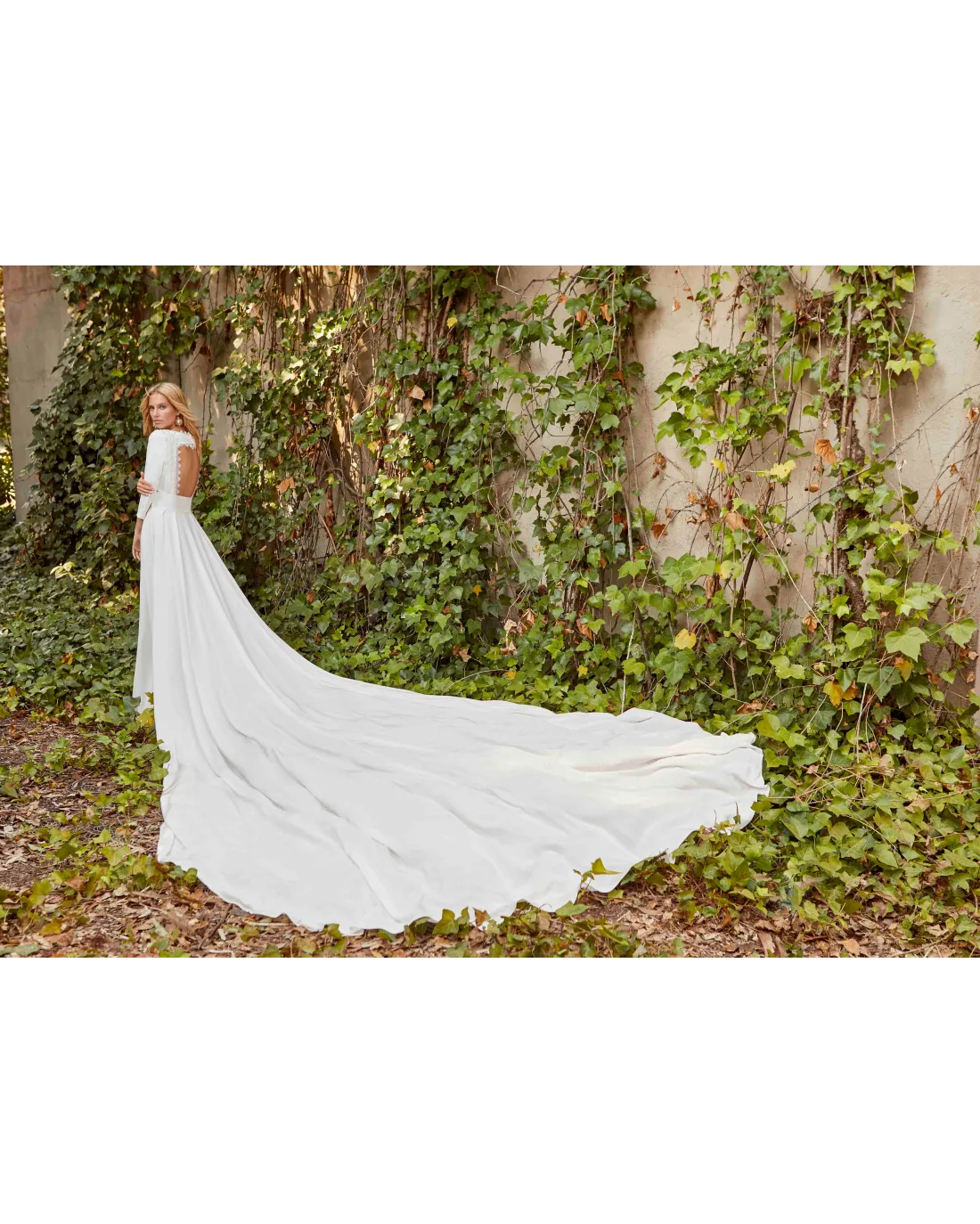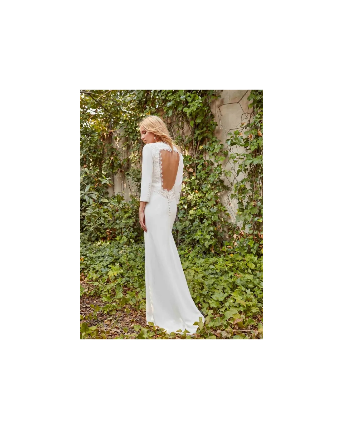 Vestido de novia sencillo, confeccionado en un delicado crepé, con manga larga y espalda descubierta con un guipur alrededor. El cierre del vestido con pequeños botones y cremallera invisible.