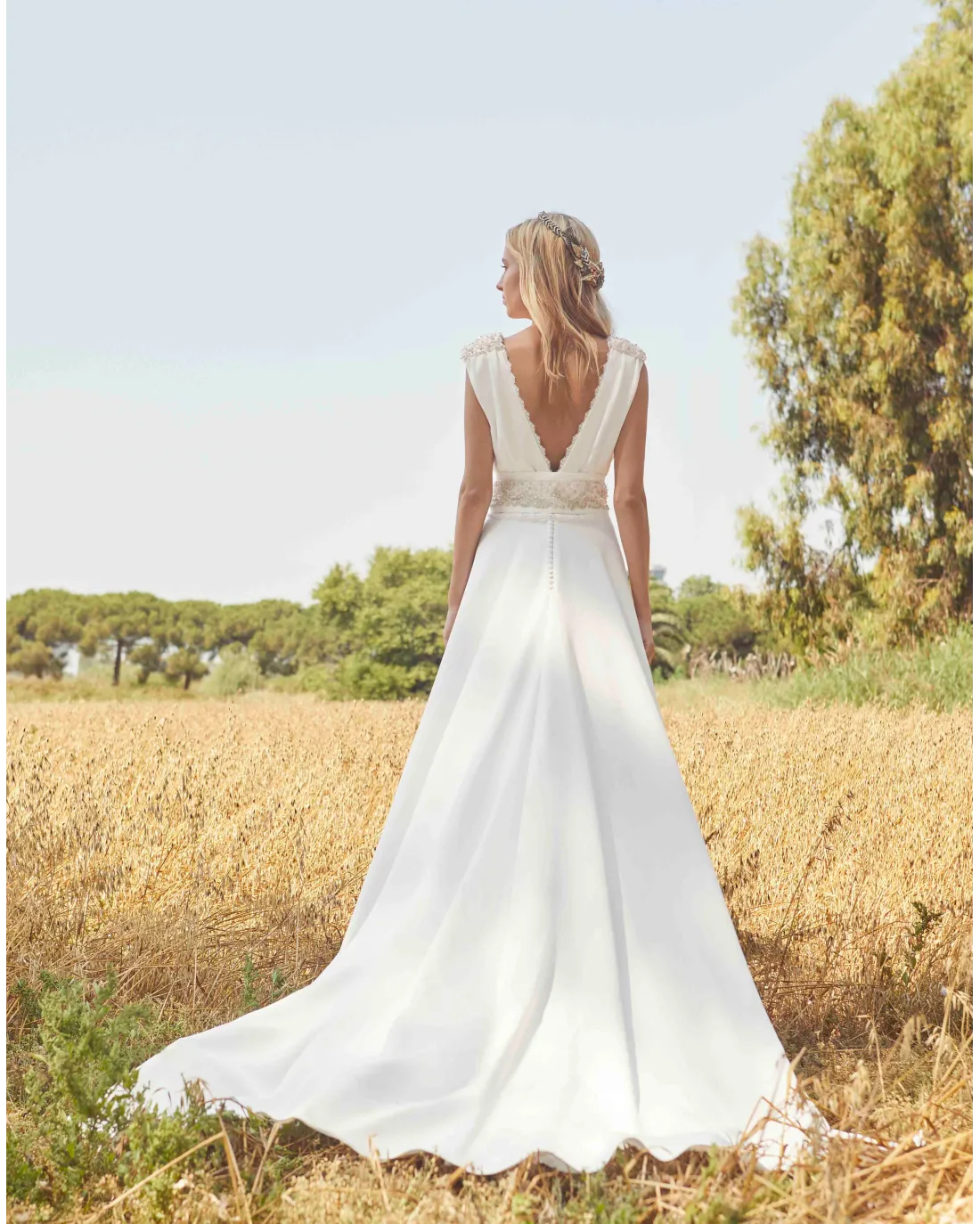 Vestido de novia sencillo, confeccionado en un delicado crepé, con manga larga y espalda descubierta con un guipur alrededor. El cierre del vestido con pequeños botones y cremallera invisible.
