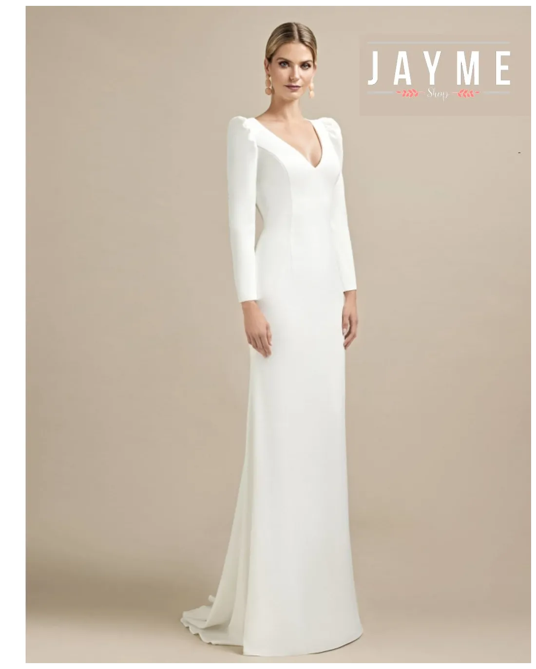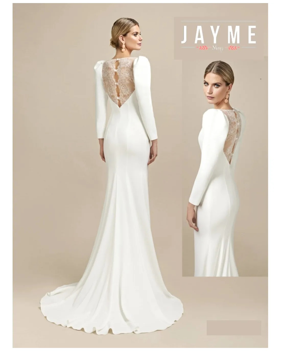 Vestido largo de novia confeccionado en un tejido crepé, de manga larga con escote en V y espalda pronunciada acabada en cintura, donde sale una bonita cola confeccionada en gasa y un aplique floral en laterales.