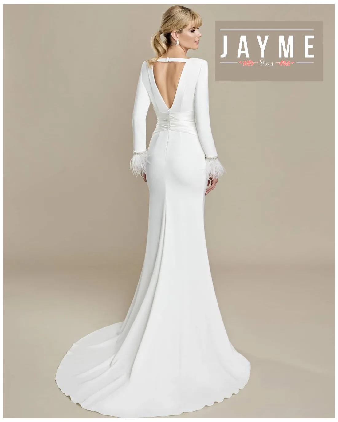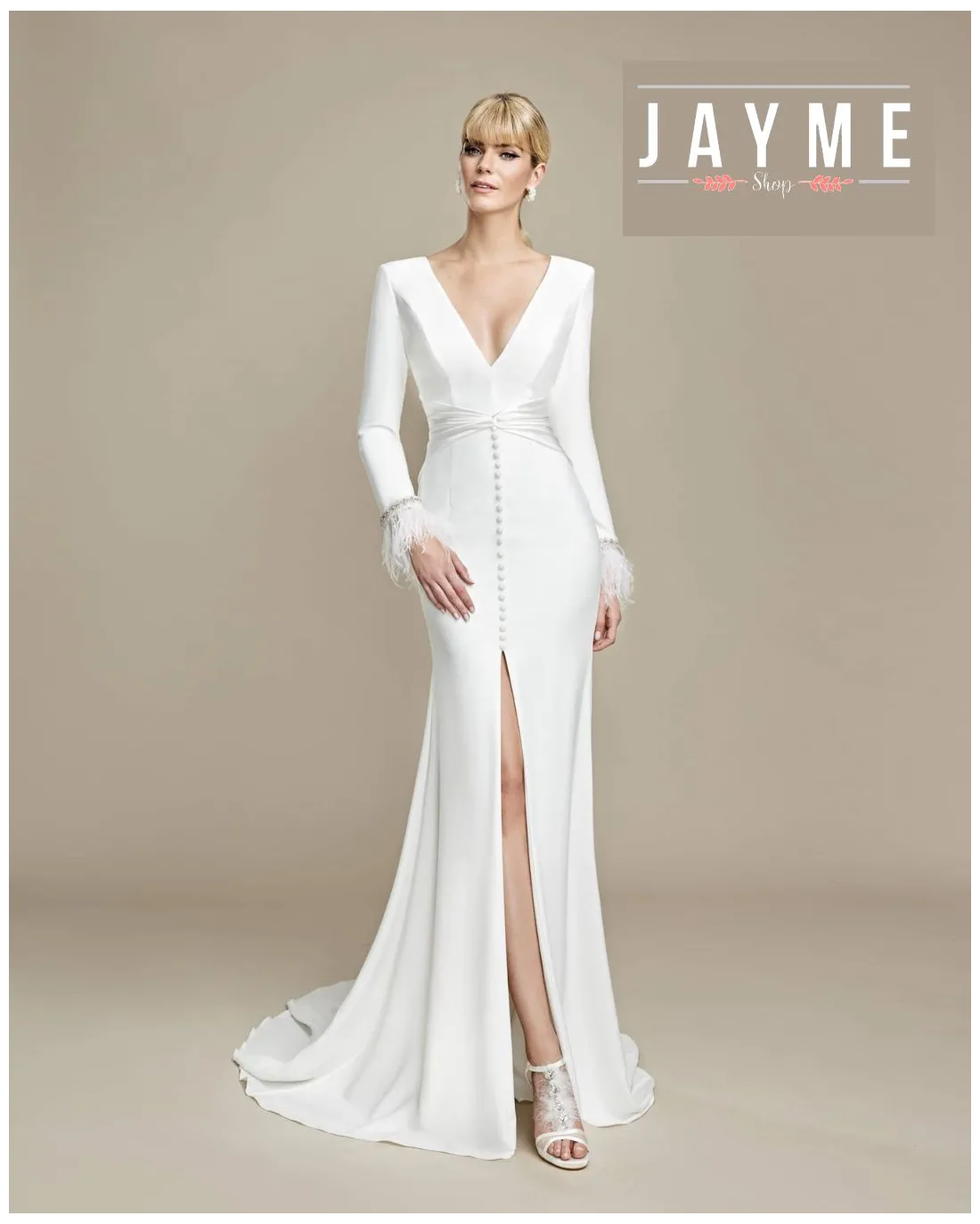 Vestido de novia confeccionado en un tejido crepé combinando la cintura drapeada con un tejido satinado. Escote en V en espalda y delante donde le baja una bonita fila de botones y nace una abertura central. Su manga larga acabada en pasamanería y plumas al tono hace de una elegancia sobrenatural este vestido.