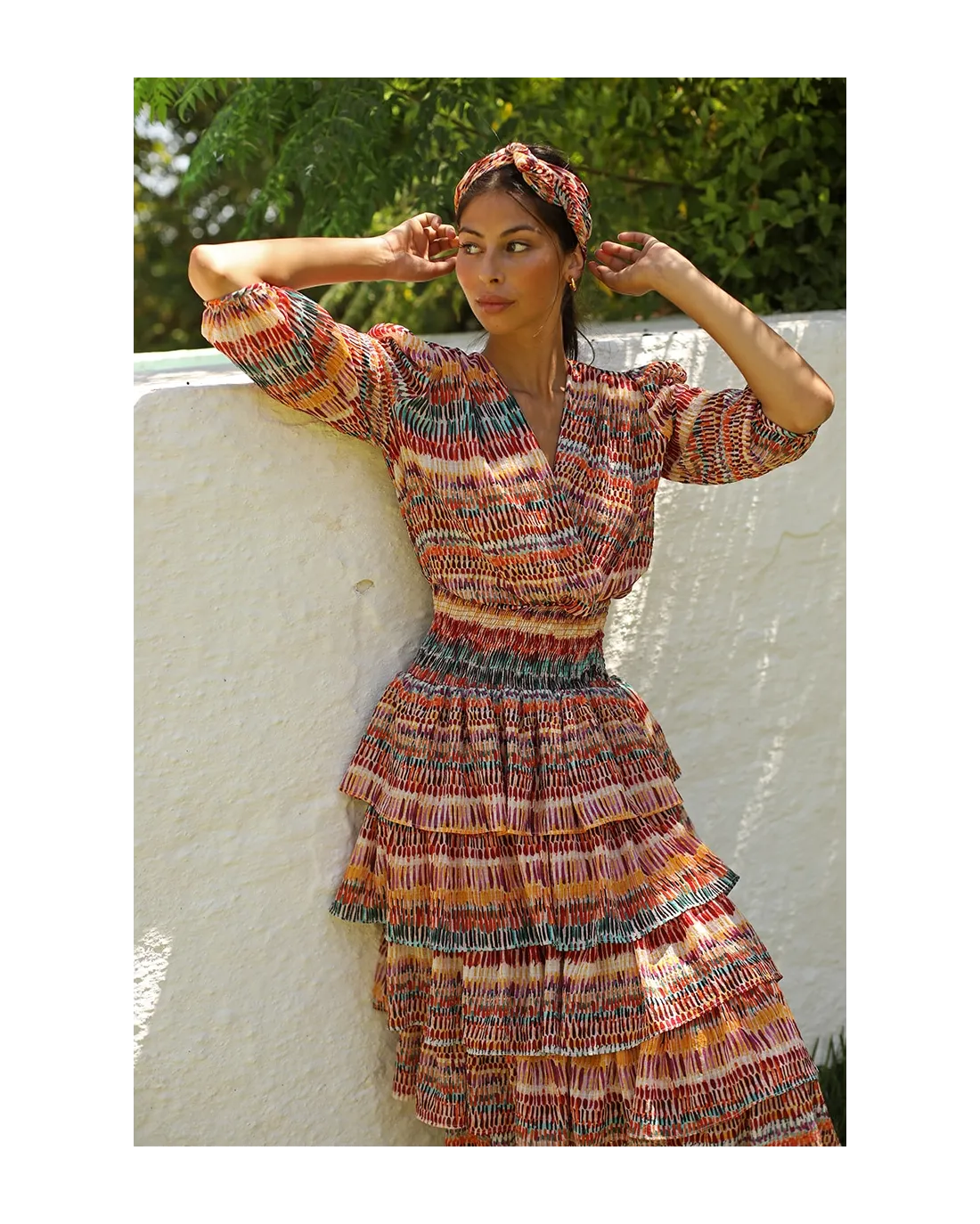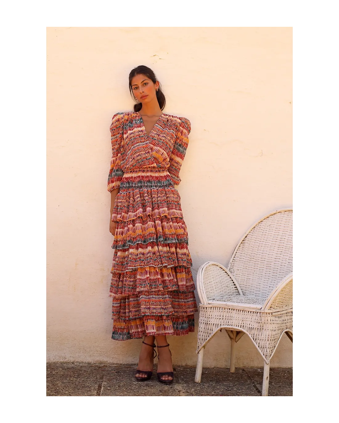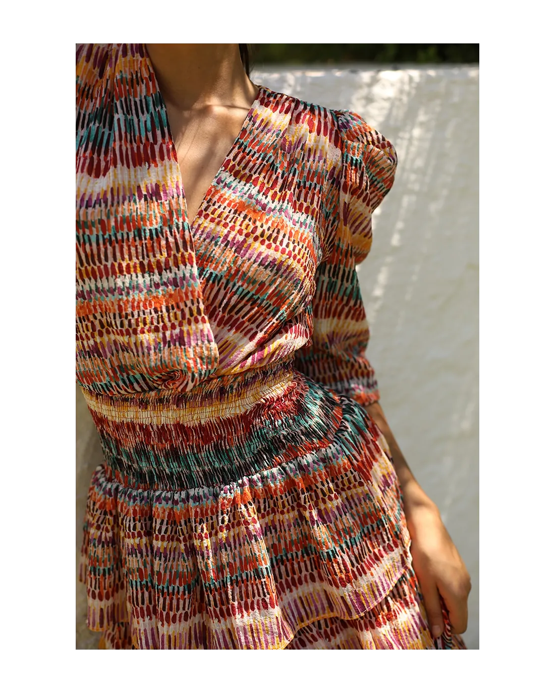 Vestido corto de corte recto, cuello redondo y manga larga. El vestido está confeccionado en tejido de lentejuelas.