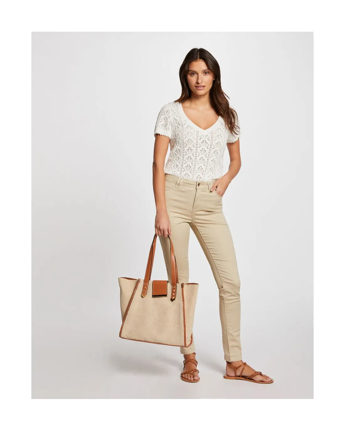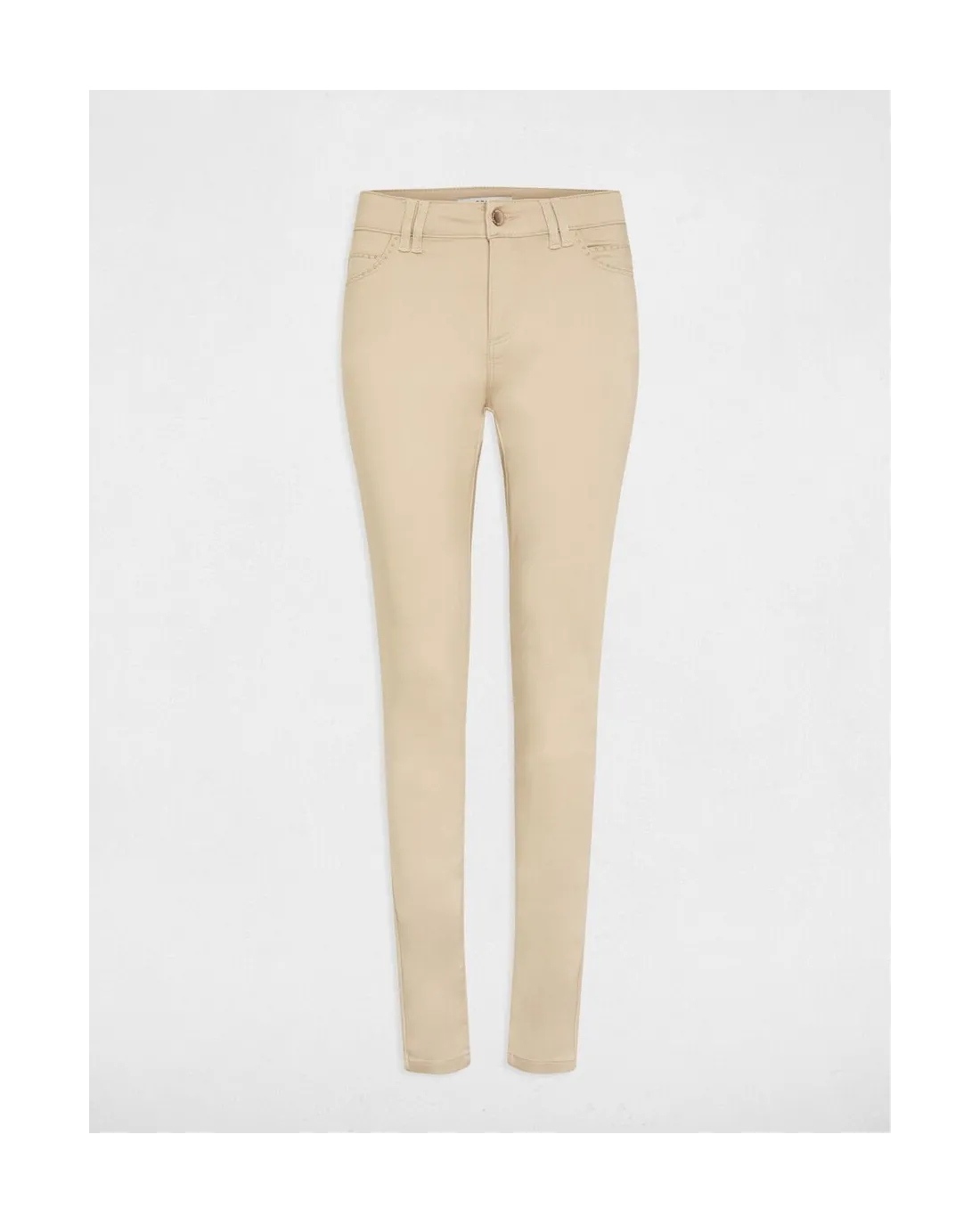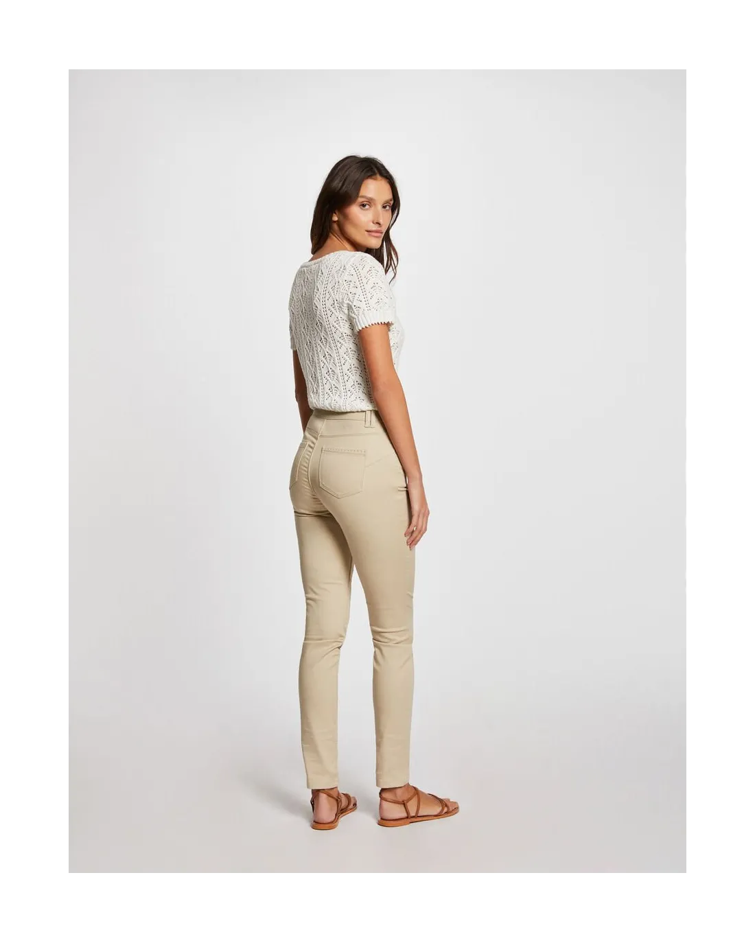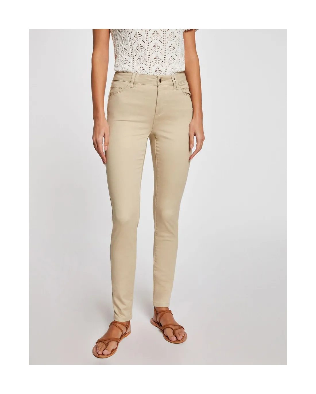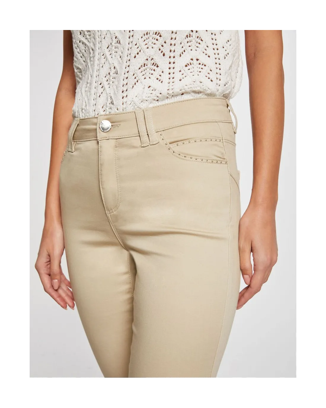Pantalón skinny estilo corto con cinco bolsillos, trabillas y cierre de botón y cremallera delantera.