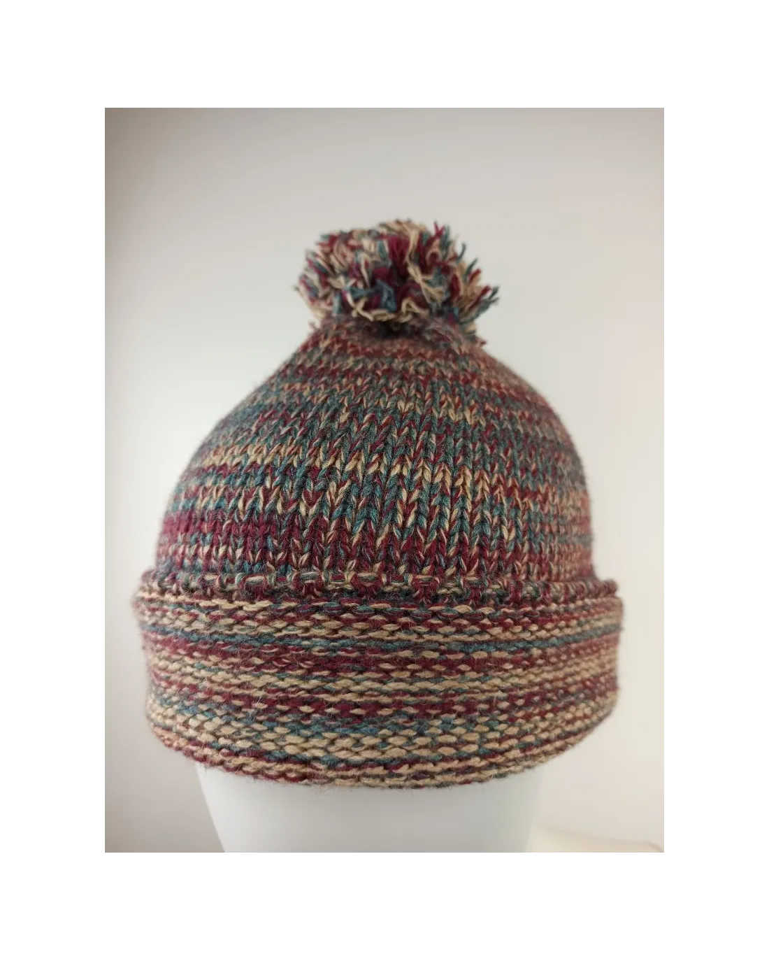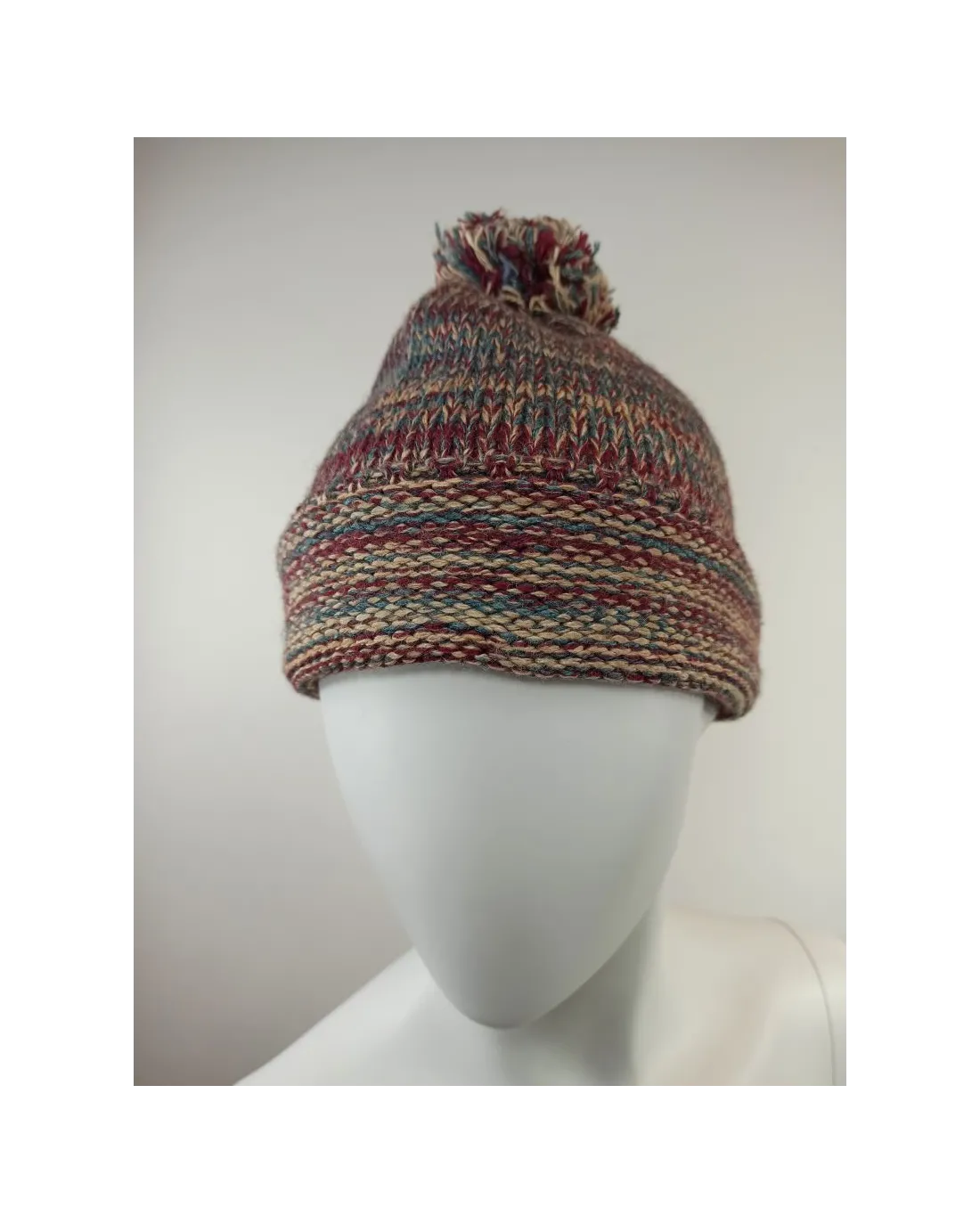 Gorro multicolor confeccionado en lana y un pompón encima del gorro.