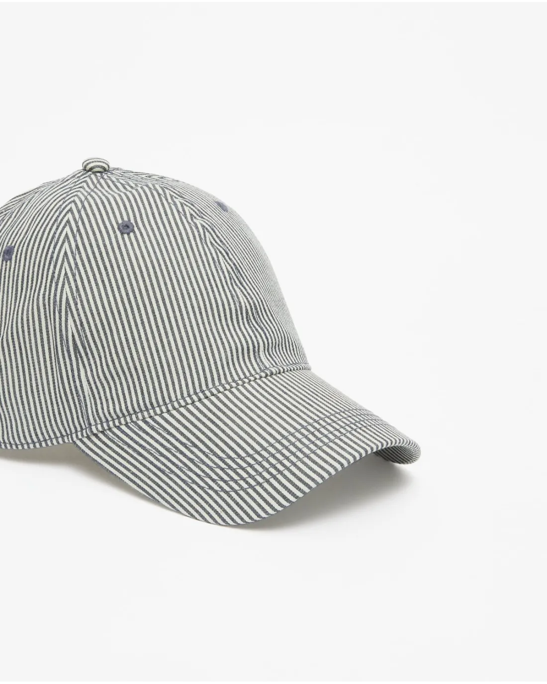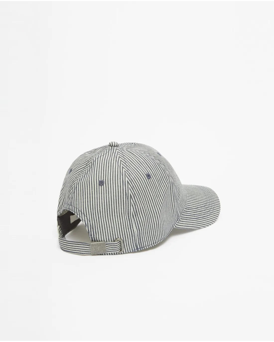 Gorra transpirable a rayas blancas y marino con visera y ajustable por la parte de atrás.