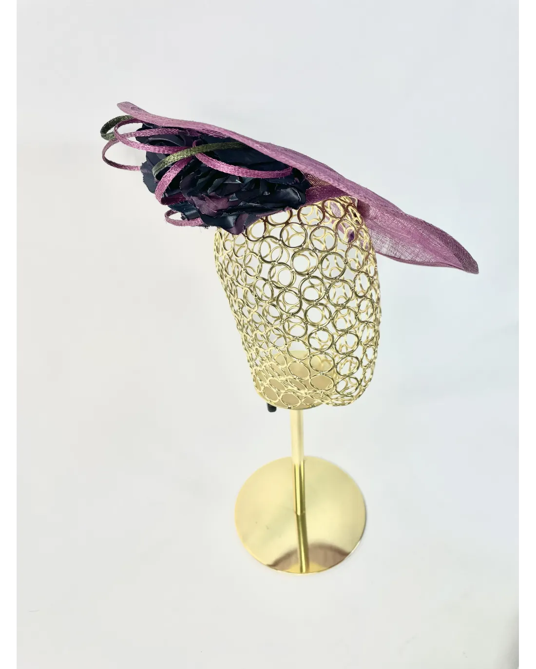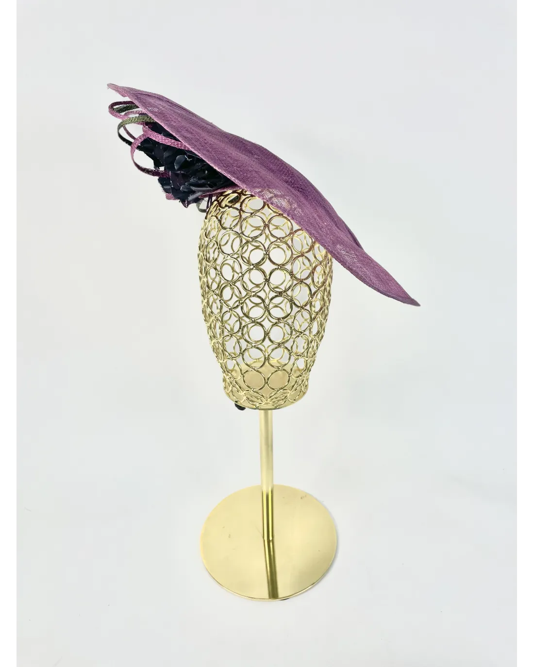Tocado platillo en color berenjena de sinamay con flores en la parte inferior del lateral.