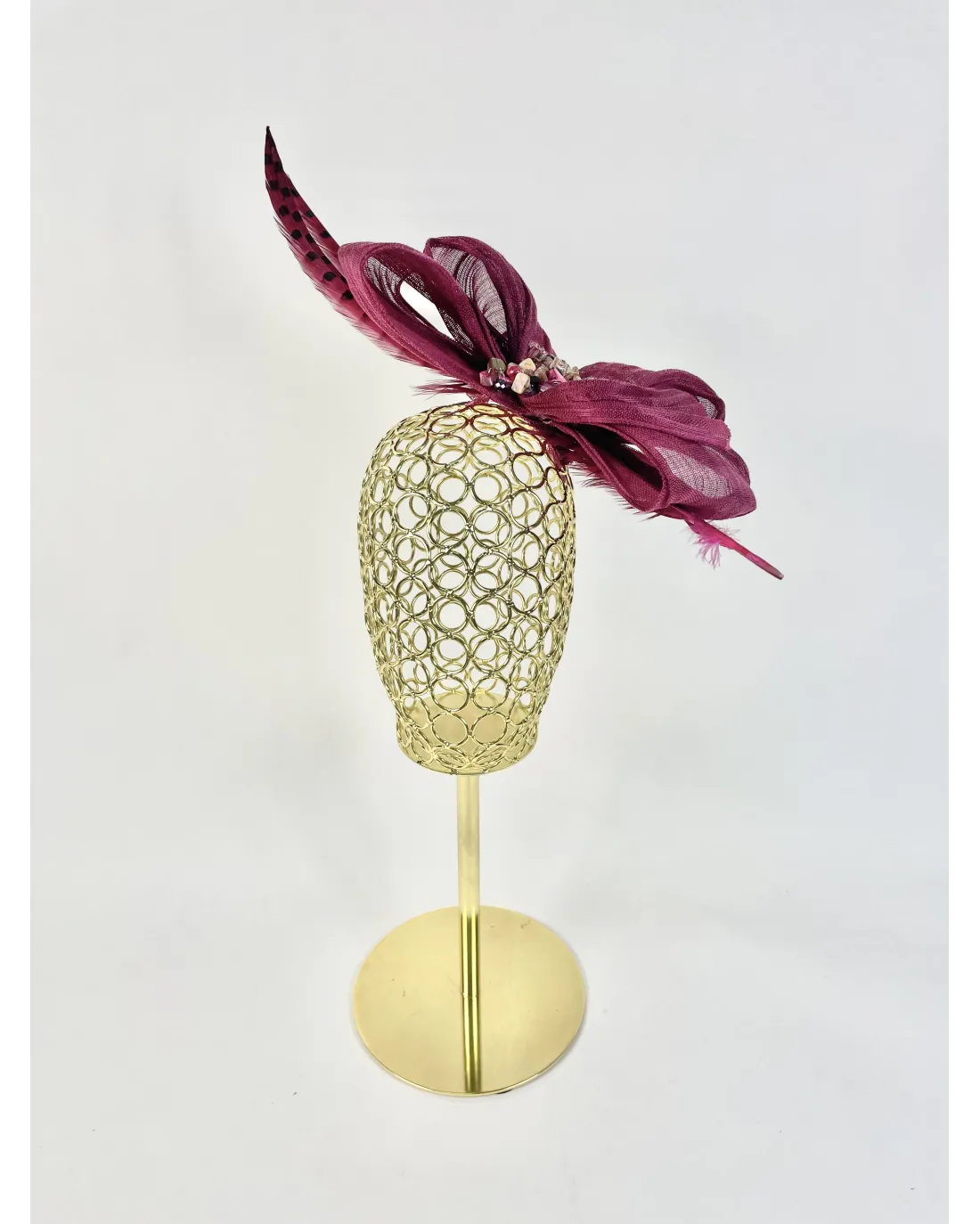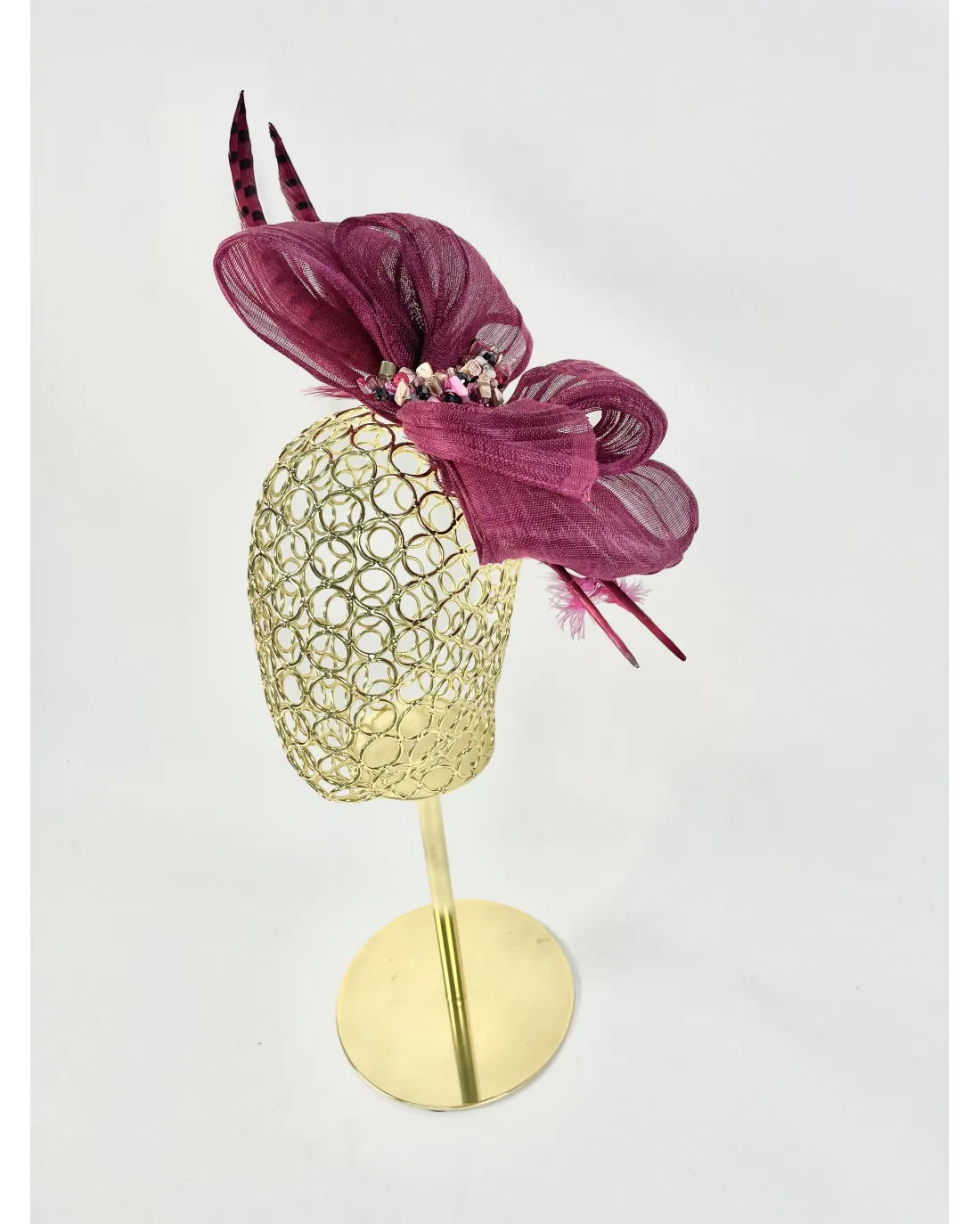 Tocado platillo en color berenjena de sinamay con flores en la parte inferior del lateral.