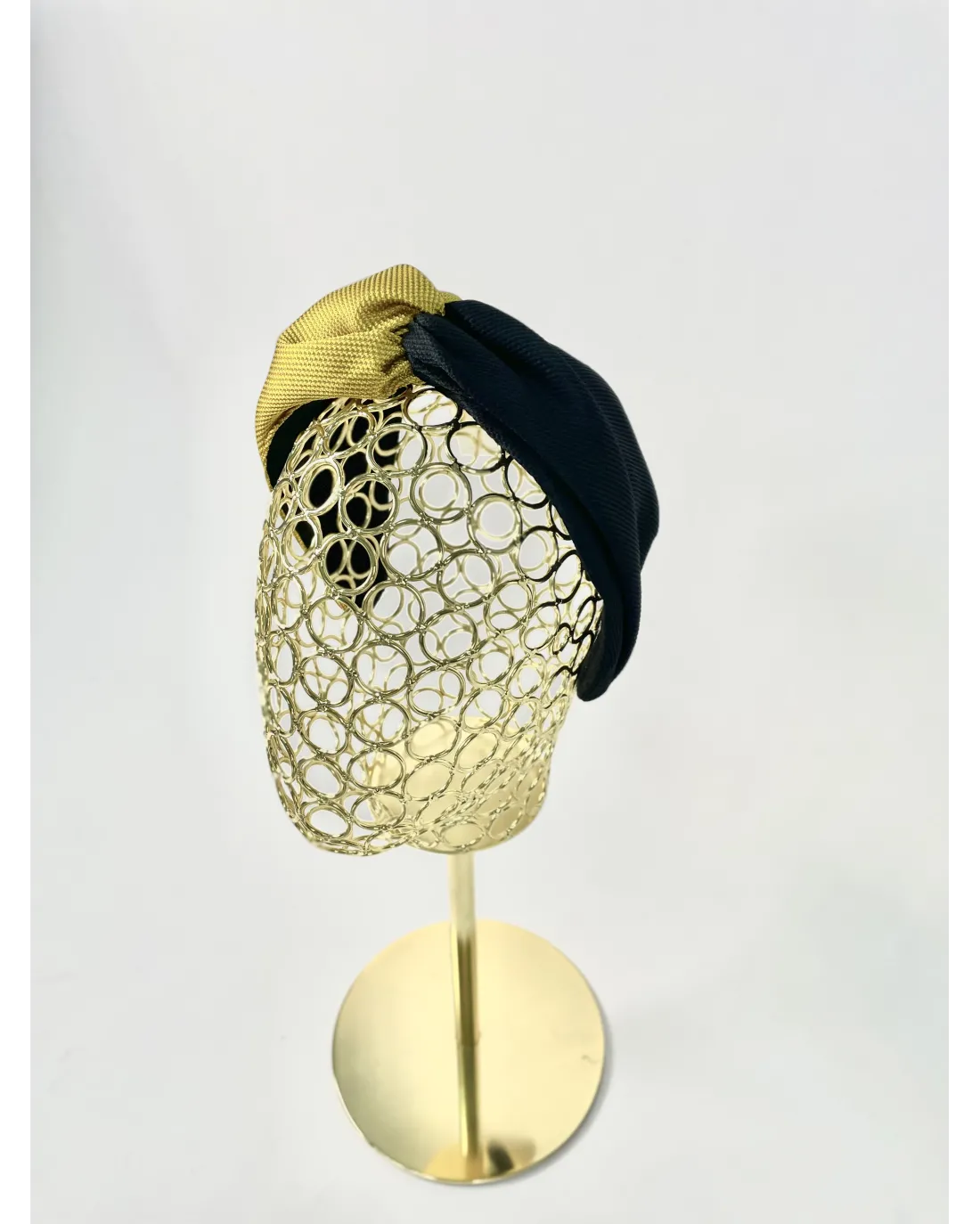 Tocado montado sobre diadema ancha con velo de rejilla con topos a tono y lazada con nudo en la parte superior.