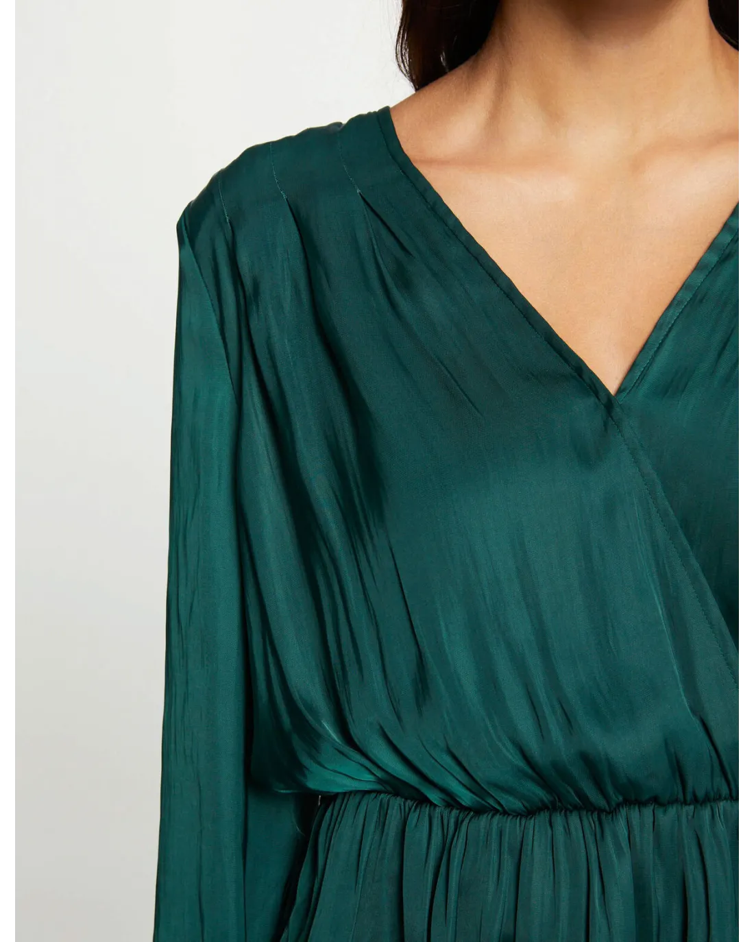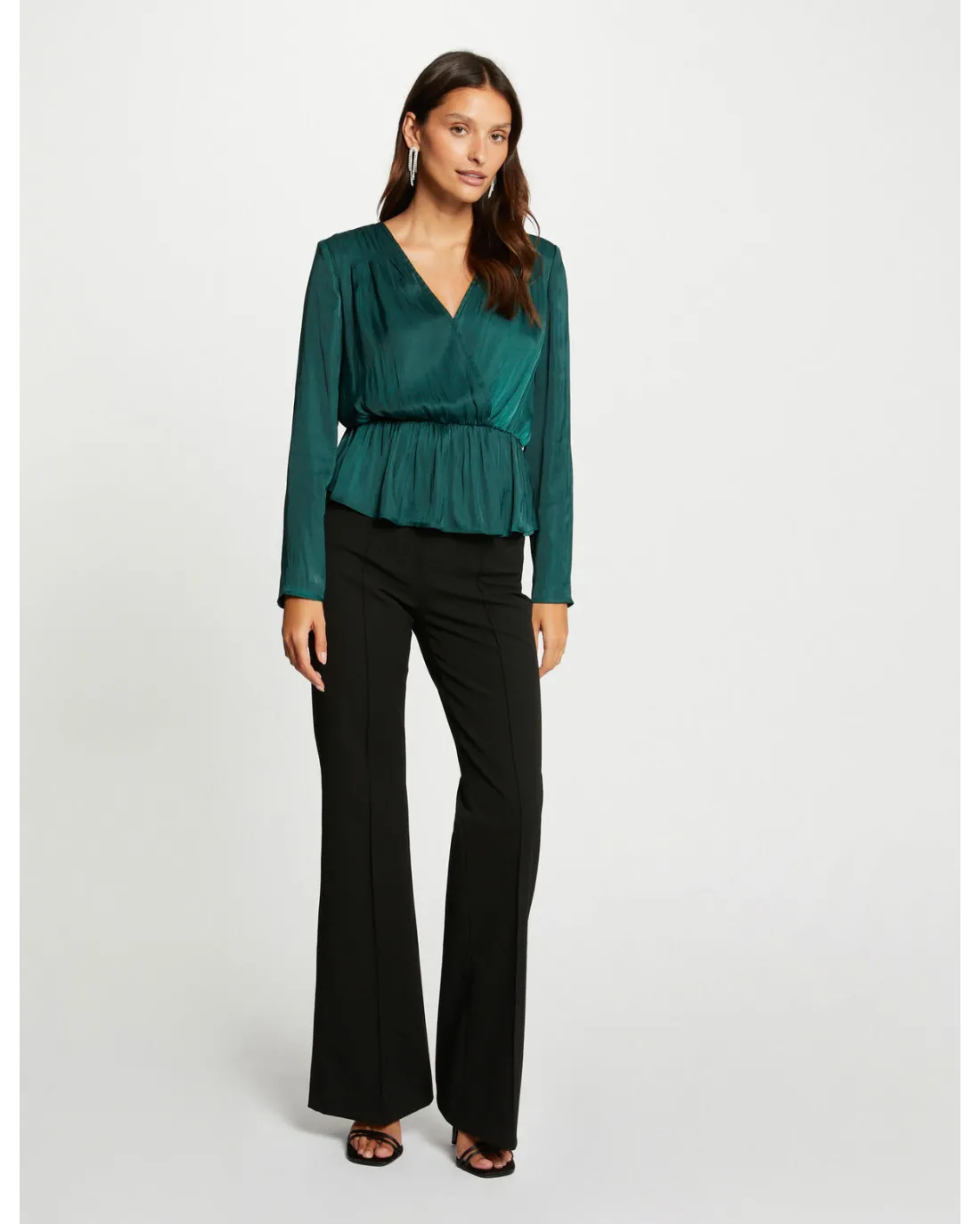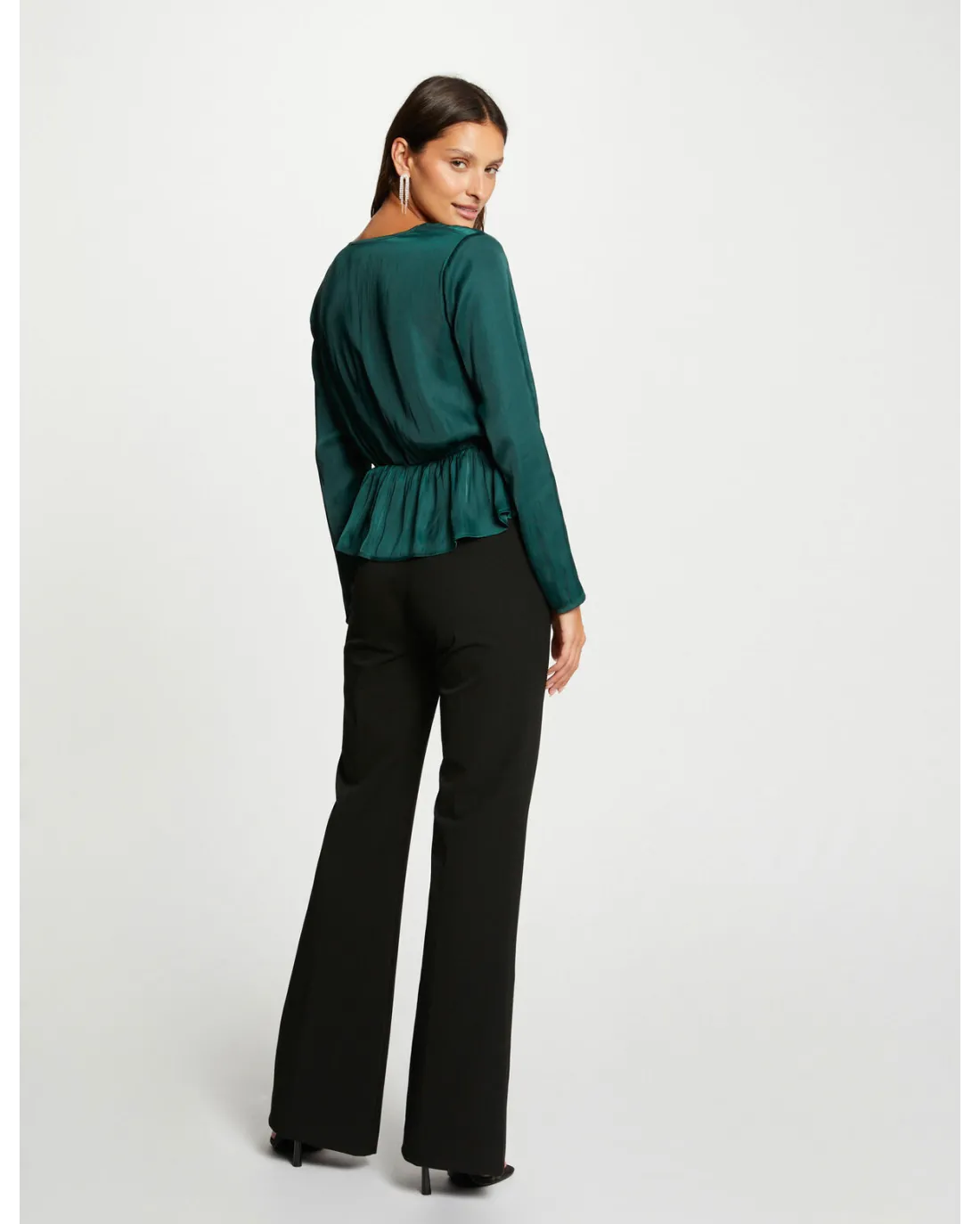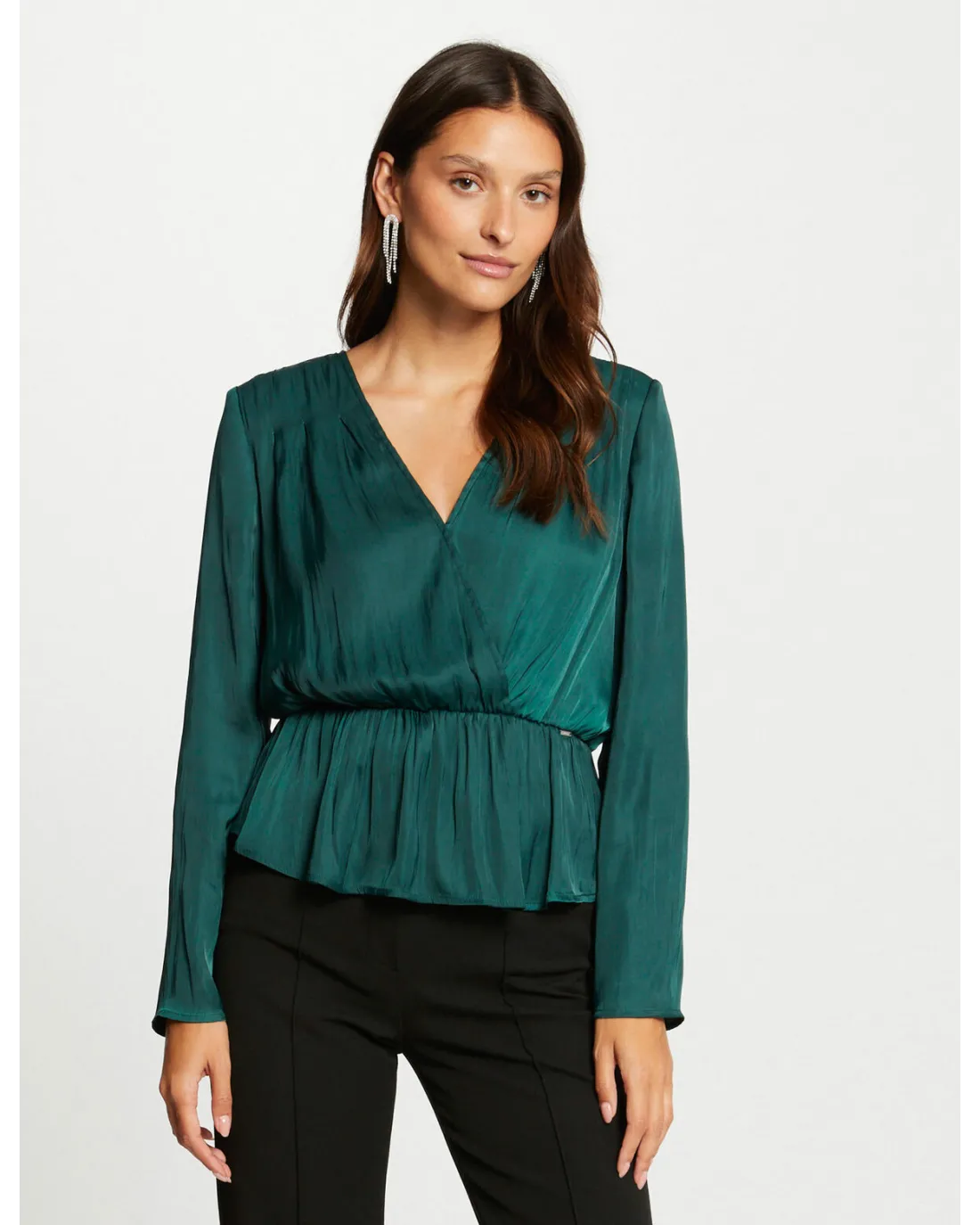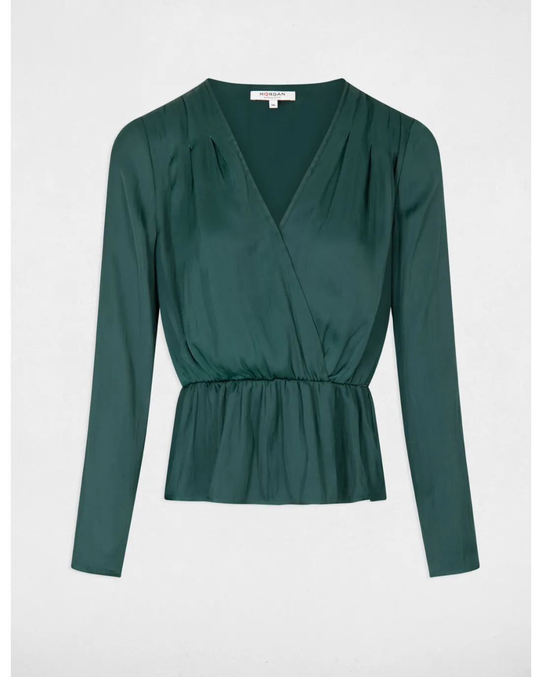Blusa confeccionada en un tejido satén con escote cruzado, manga larga y cintura elástica con volante.