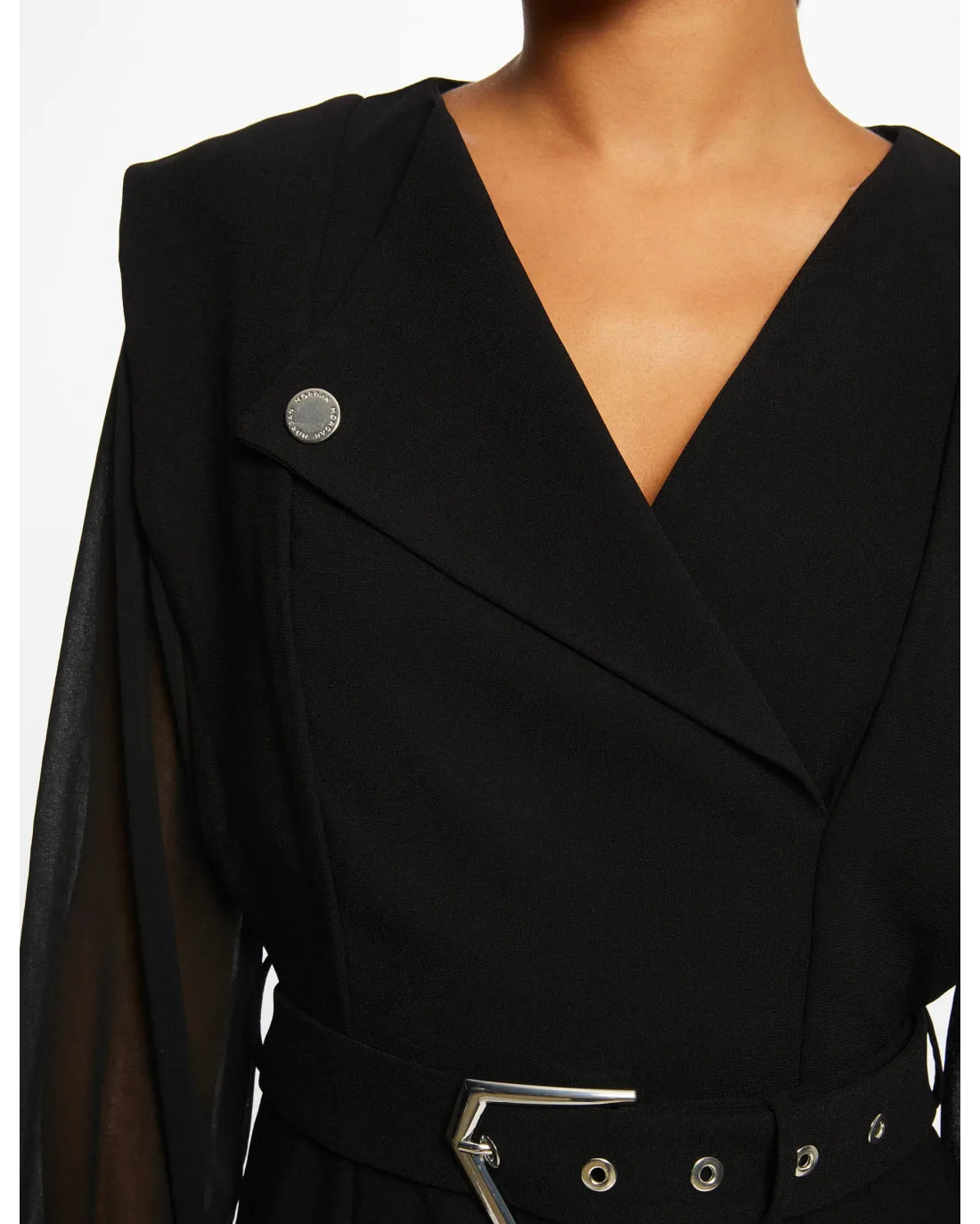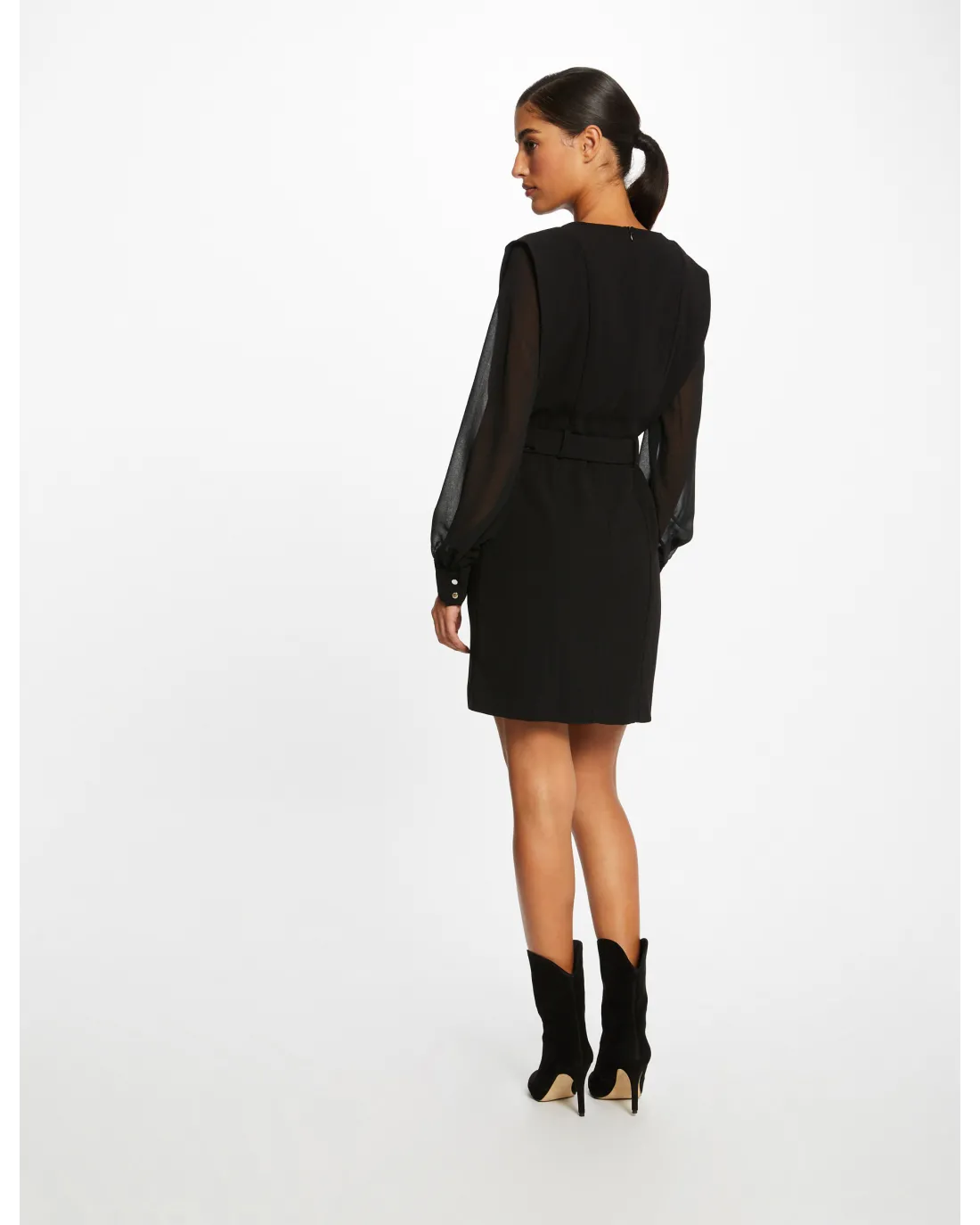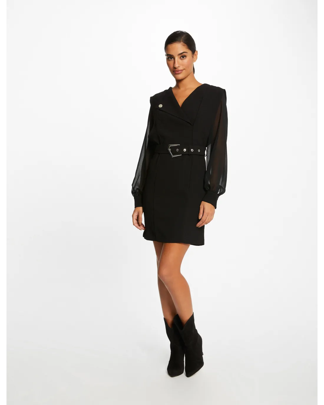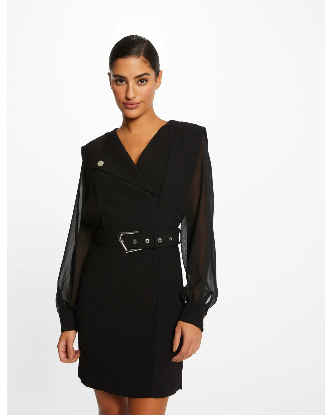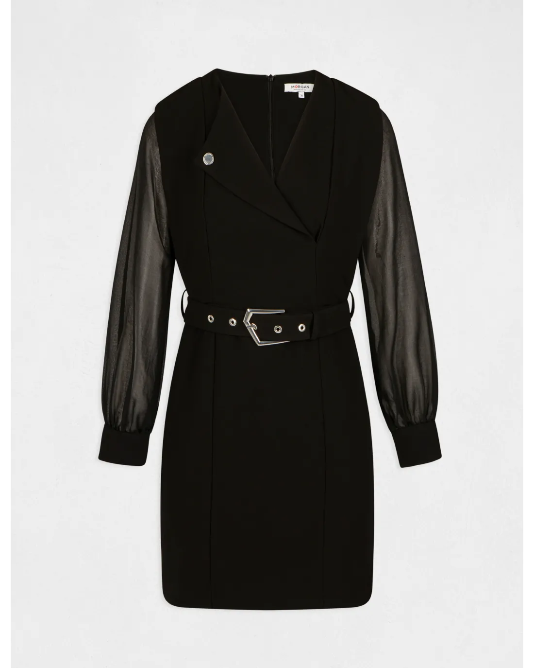 Vestido corto de corte recto, cuello con muescas acabado en V, manga larga en tejido semi-transparente acabadas en puño en tejido crepé como el vestido y cinturón con hebilla y trabillas.