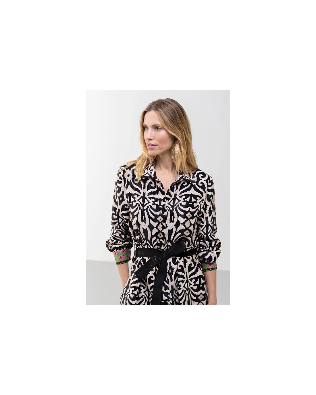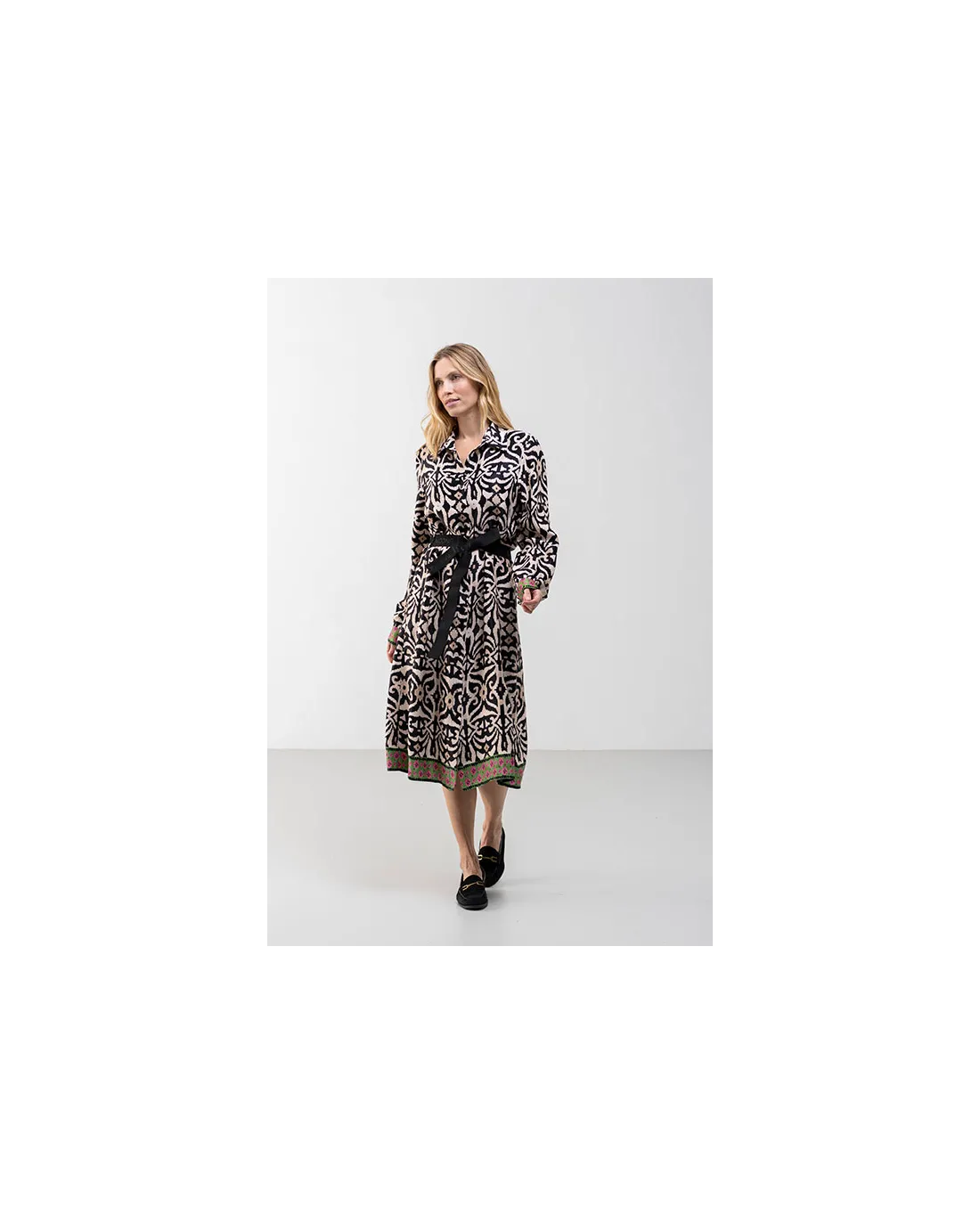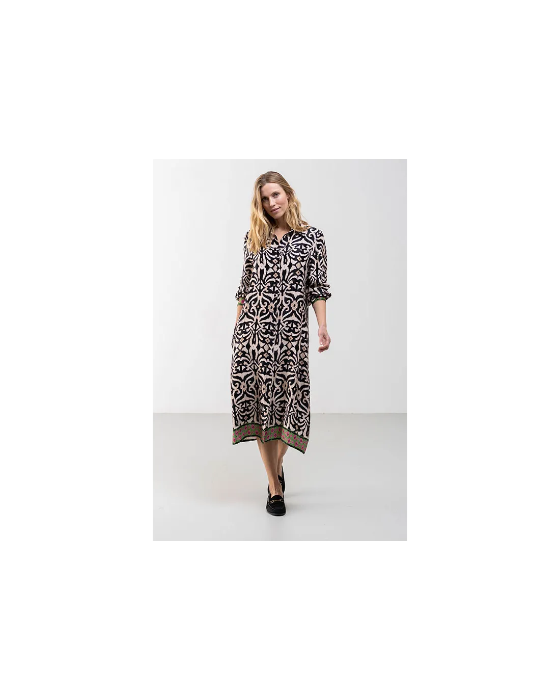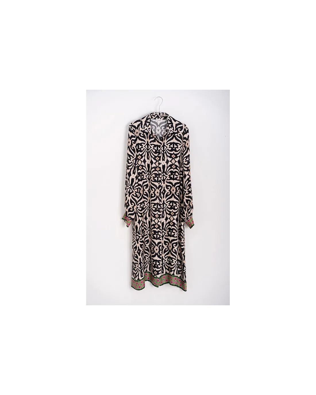 Vestido de largo midi confeccionado en algodón a rayas con manga corta, escote en V, bolsillos laterales y aberturas en los laterales.