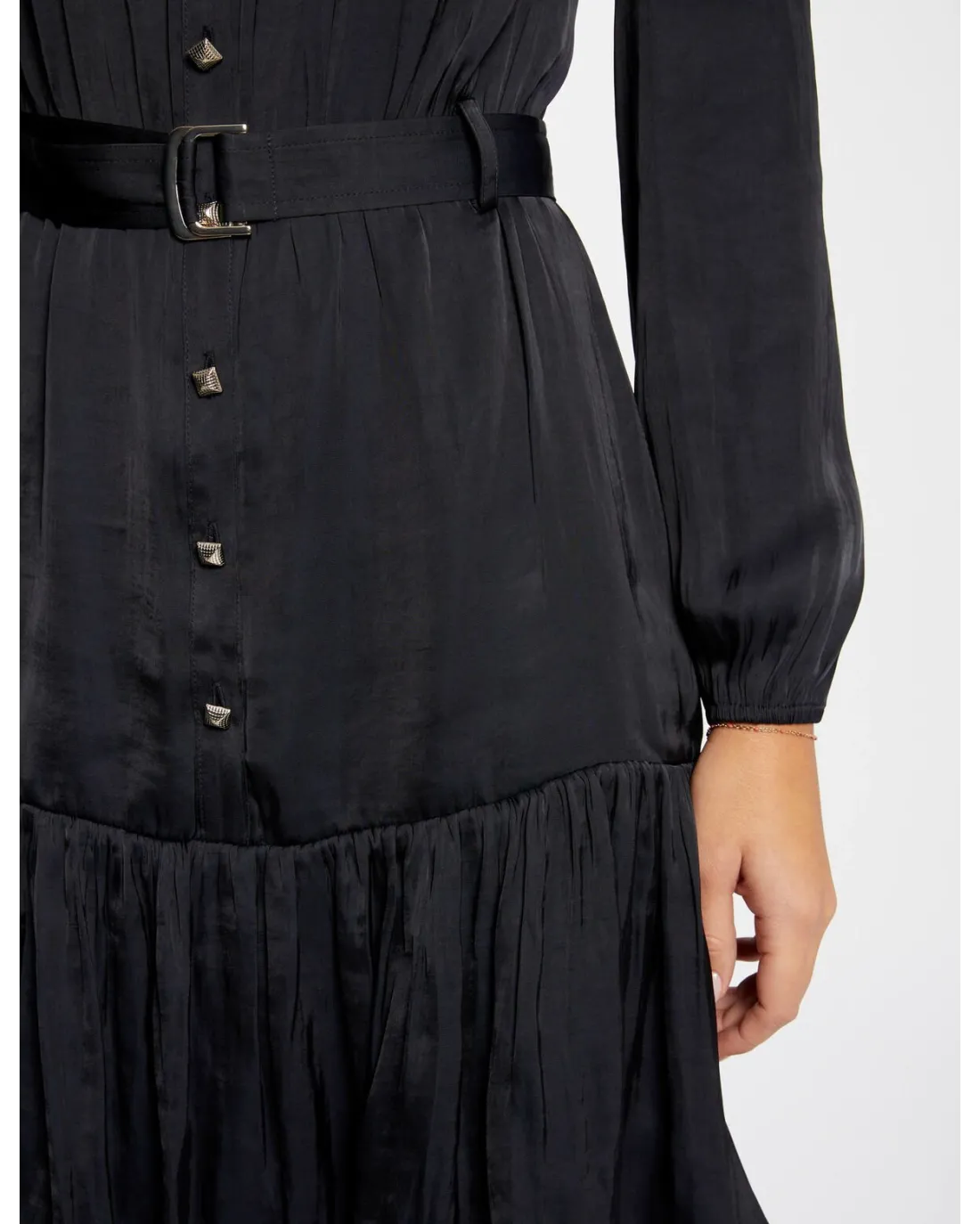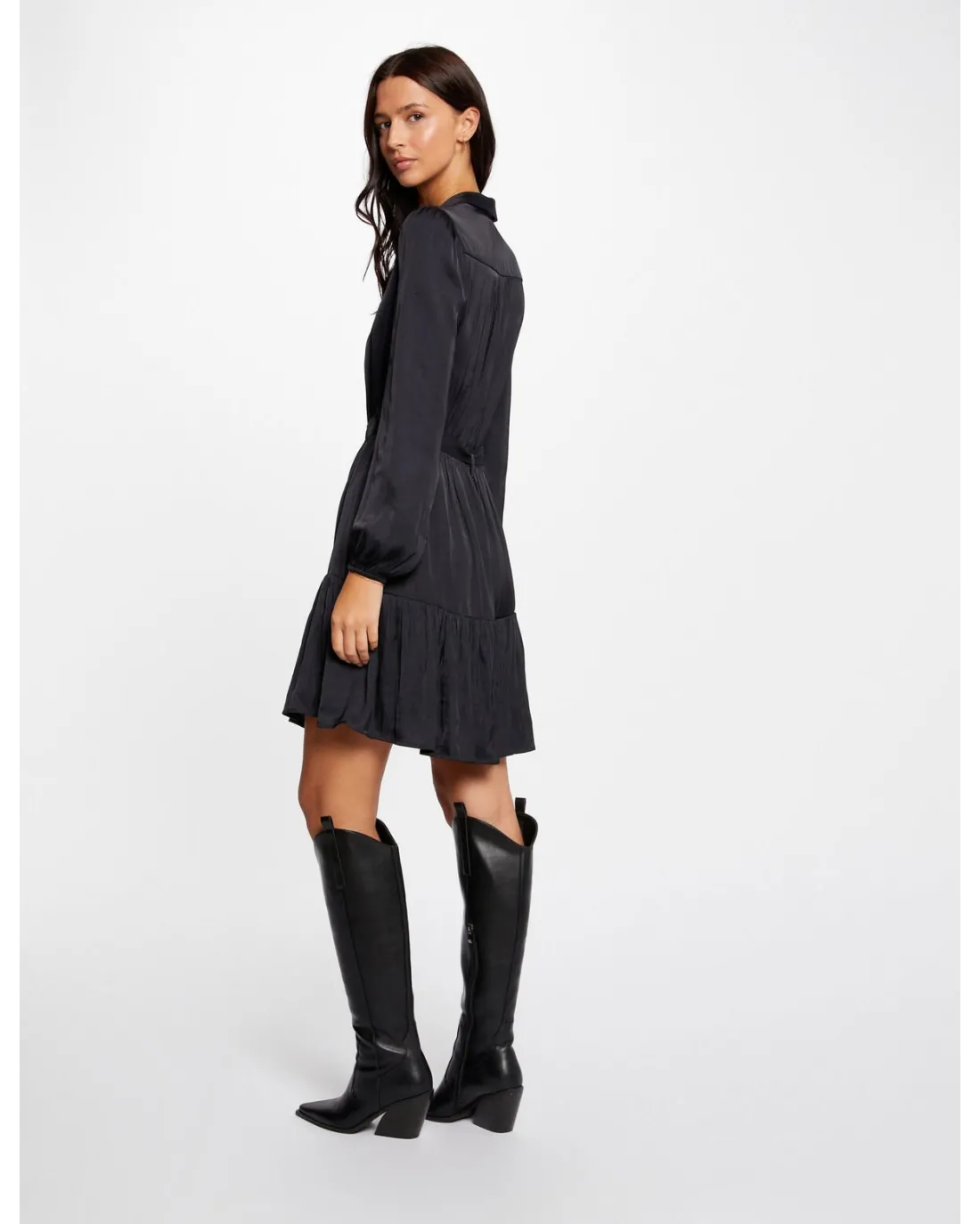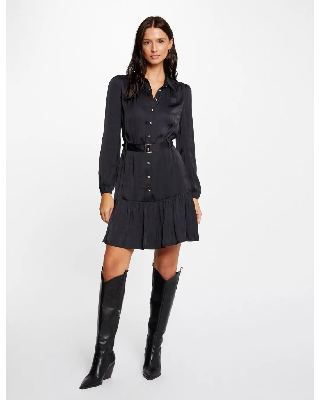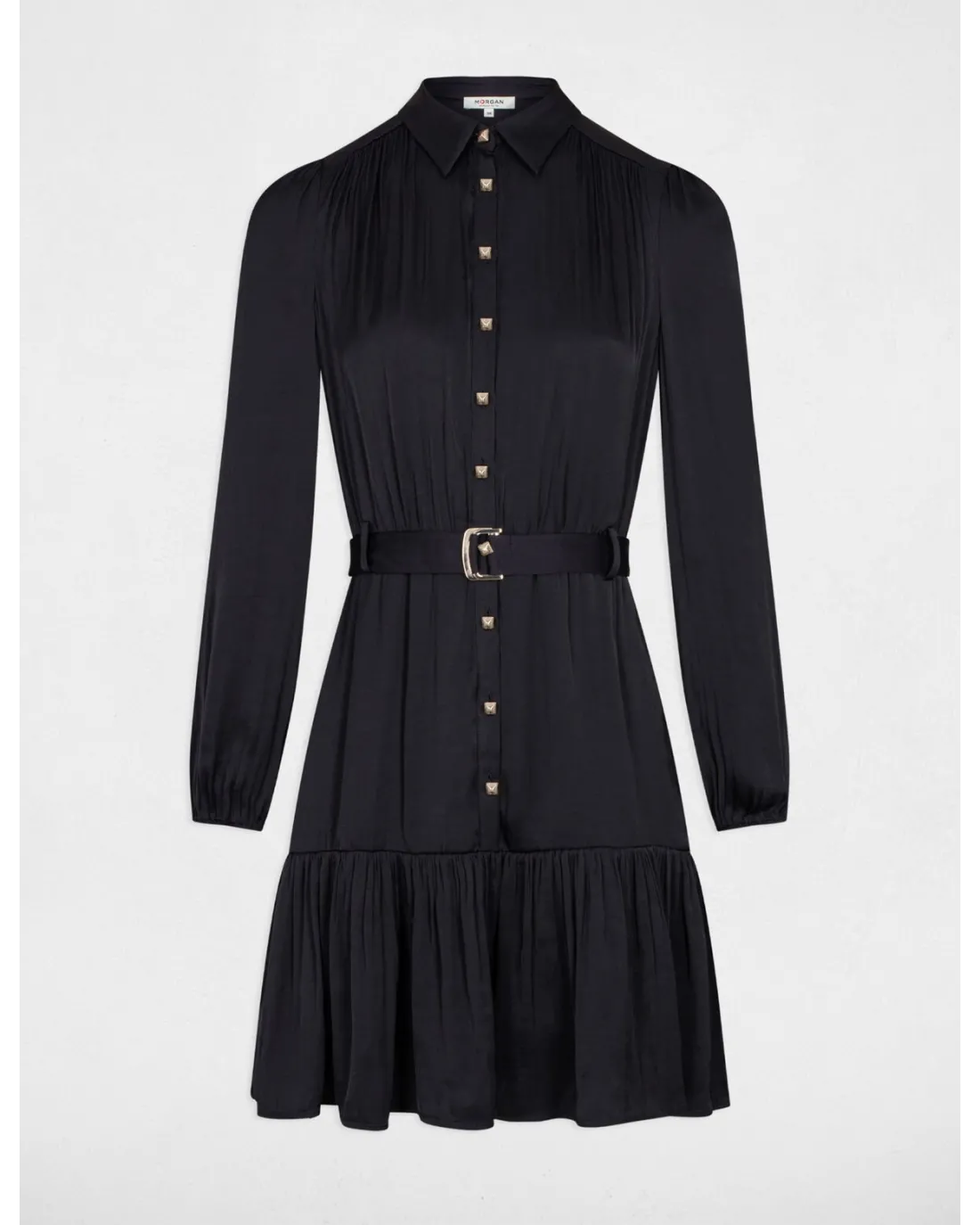 Vestido corto camisero confeccionado en tejido satinado de manga larga y volante en el final del vestido. Incluye cinturón al tono.