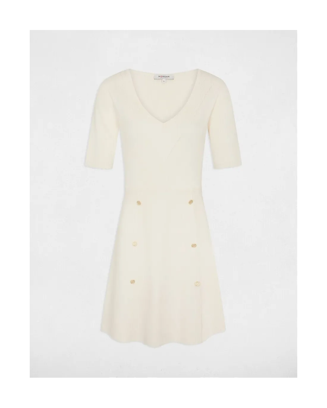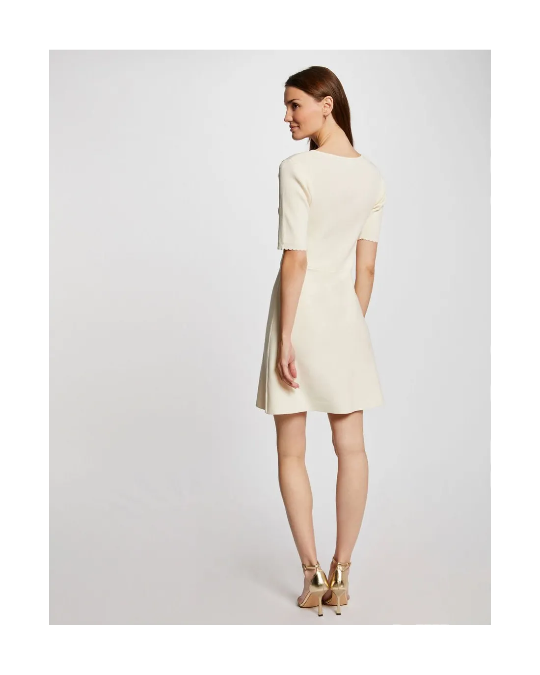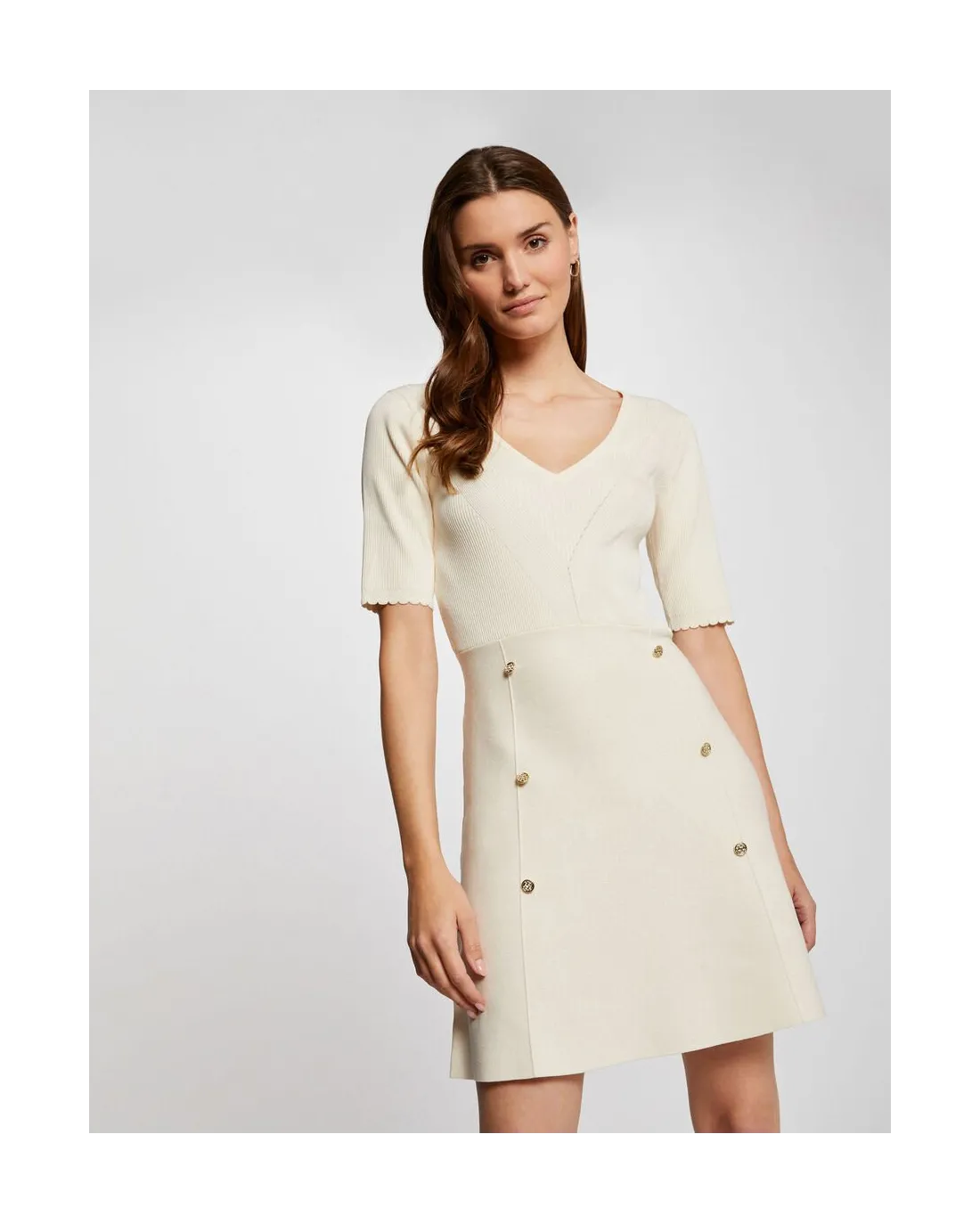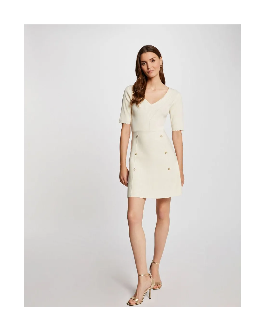 Vestido corto confeccionado en punto medio, de manga larga y cuello redondo. Vestido cuenta con unas franjas a contraste en el cuello, cintura y puños.