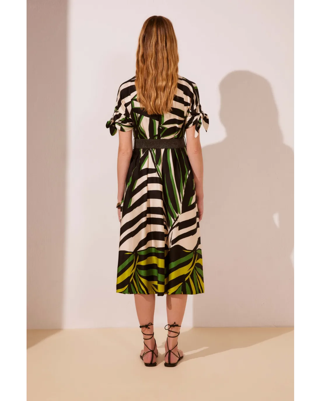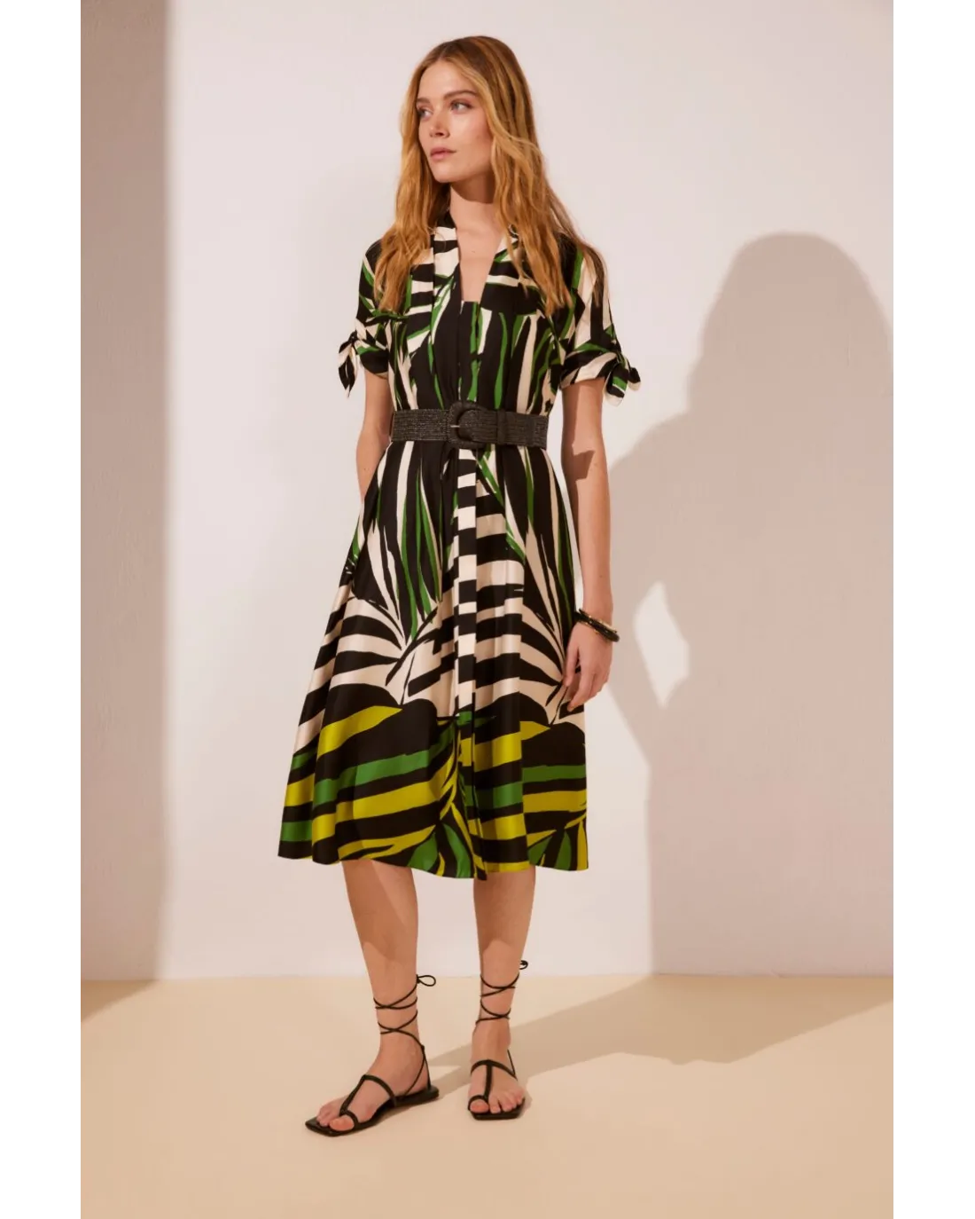 Vestido de largo midi camisero con estampación geométrica, de manga corta con cuello camisero y cinturón negro incluido.