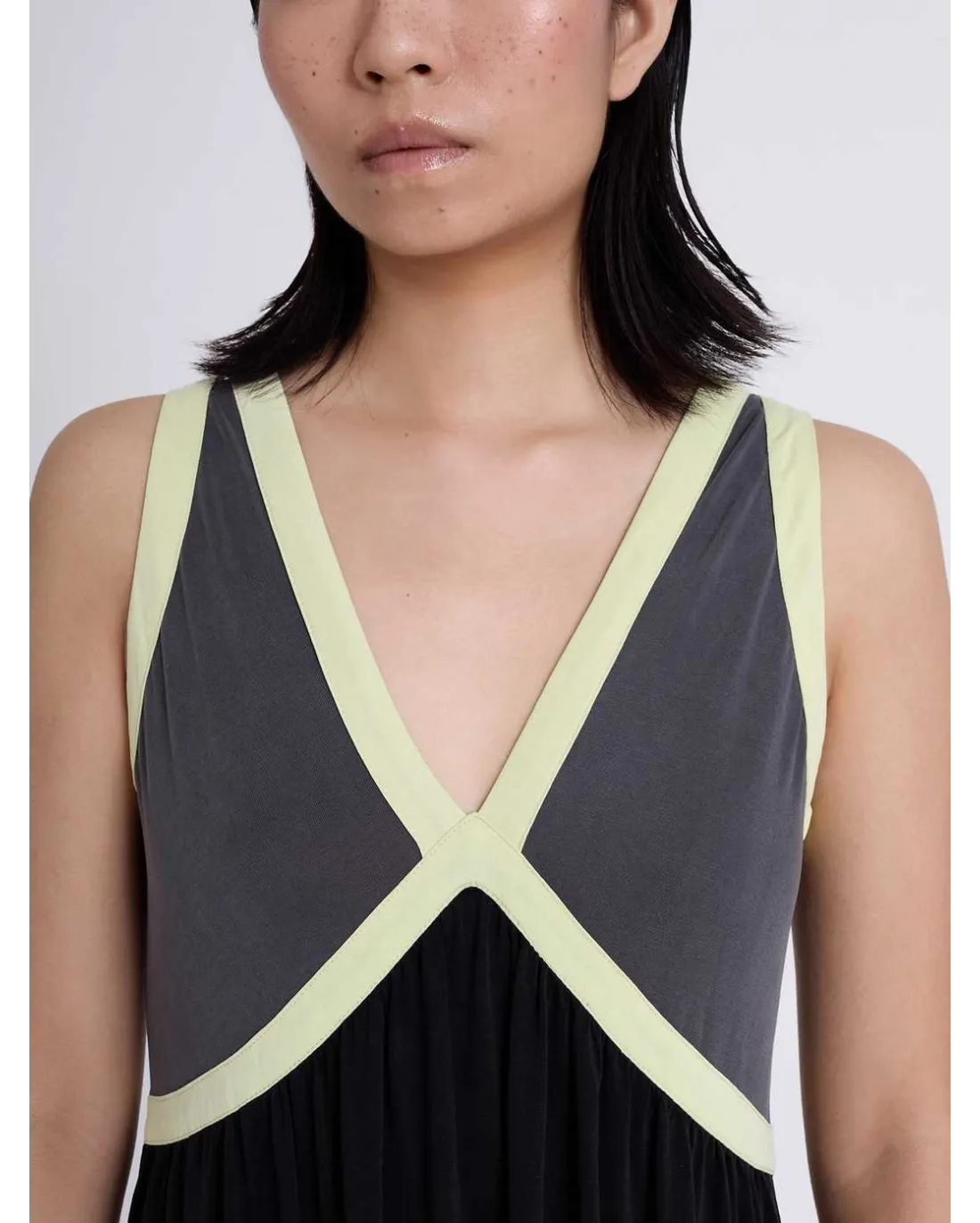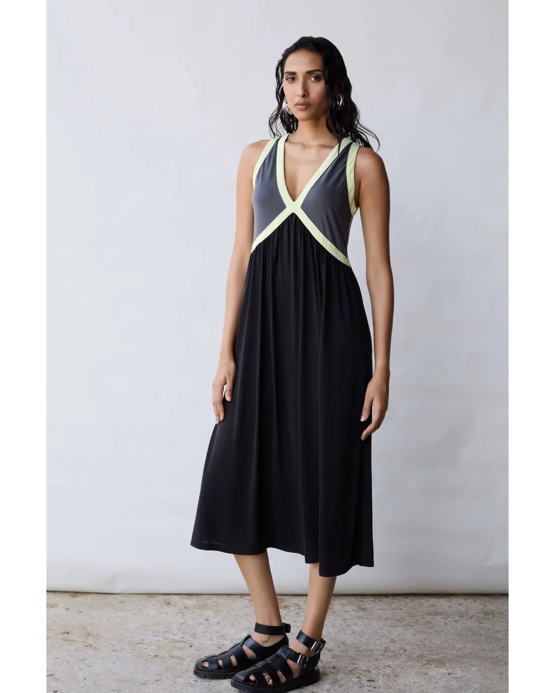 Vestido largo estampado con cansesú de encaje, escote en V y manga corta ranglan. El vestido es acabado en un volante.