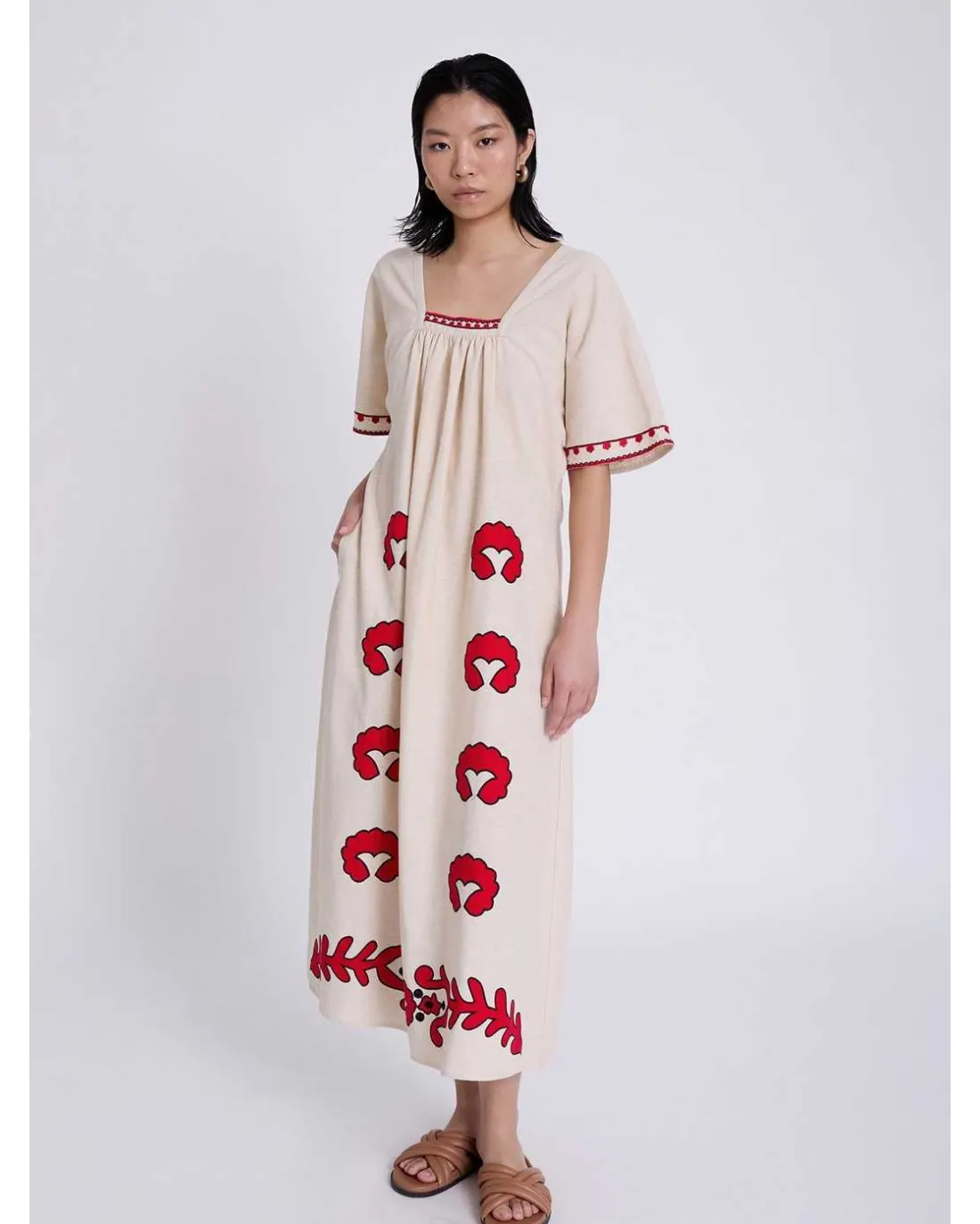 Vesido de largo midi confeccionado en algodón con doble tejido. La parte de arriba confeccionado en tejido calado con rayas marineras, cuello redondo y hombros anchos, la parte de la falda lisa con cintura fruncida.